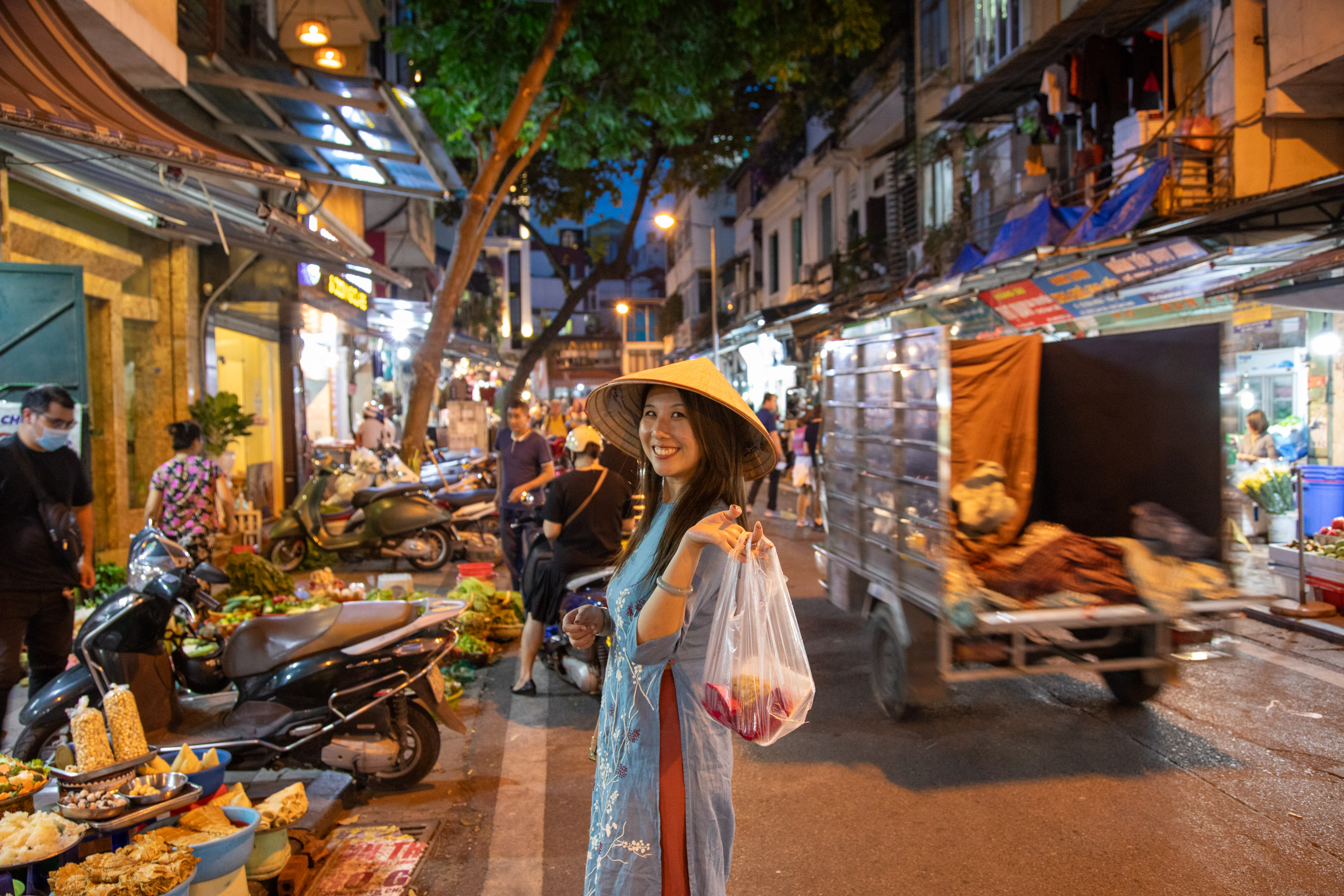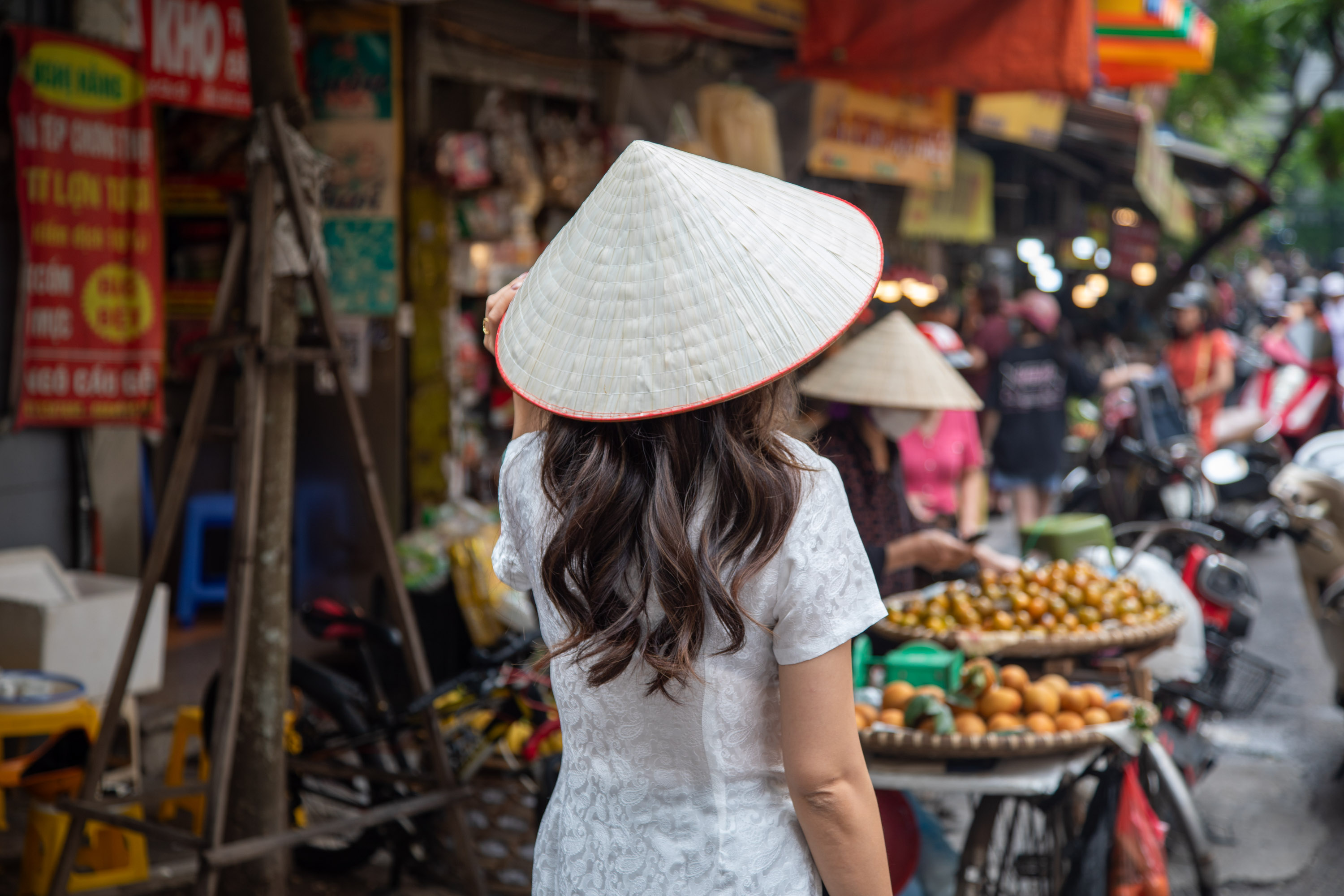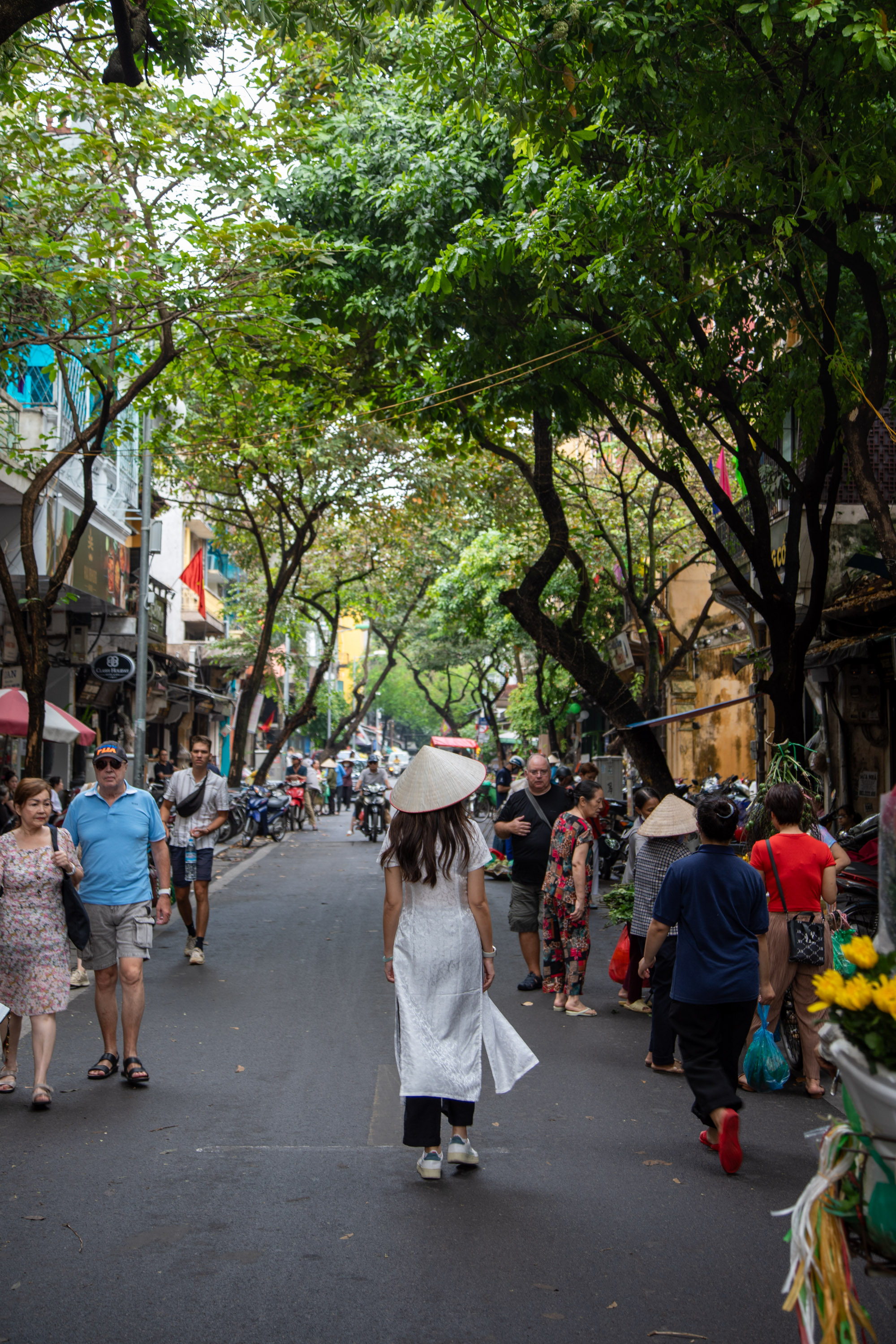 Le vieux Hanoi a cela d’agréable, ce sont ces rues ombragées qui donnent envie de se perdre au hasard. Il y a de nombreuses boutiques très mignonnes et on finit par acheter une autre Ao Dai en lin un peu cher mais dans des couleurs différentes. La ça y est, l’épisode de l’iPhone est maintenant oublié. Nous sortons pour acheter un snack et on s’installe sur un banc pour manger, puis on achète un chapeau vietnamien pour finaliser la tenue.