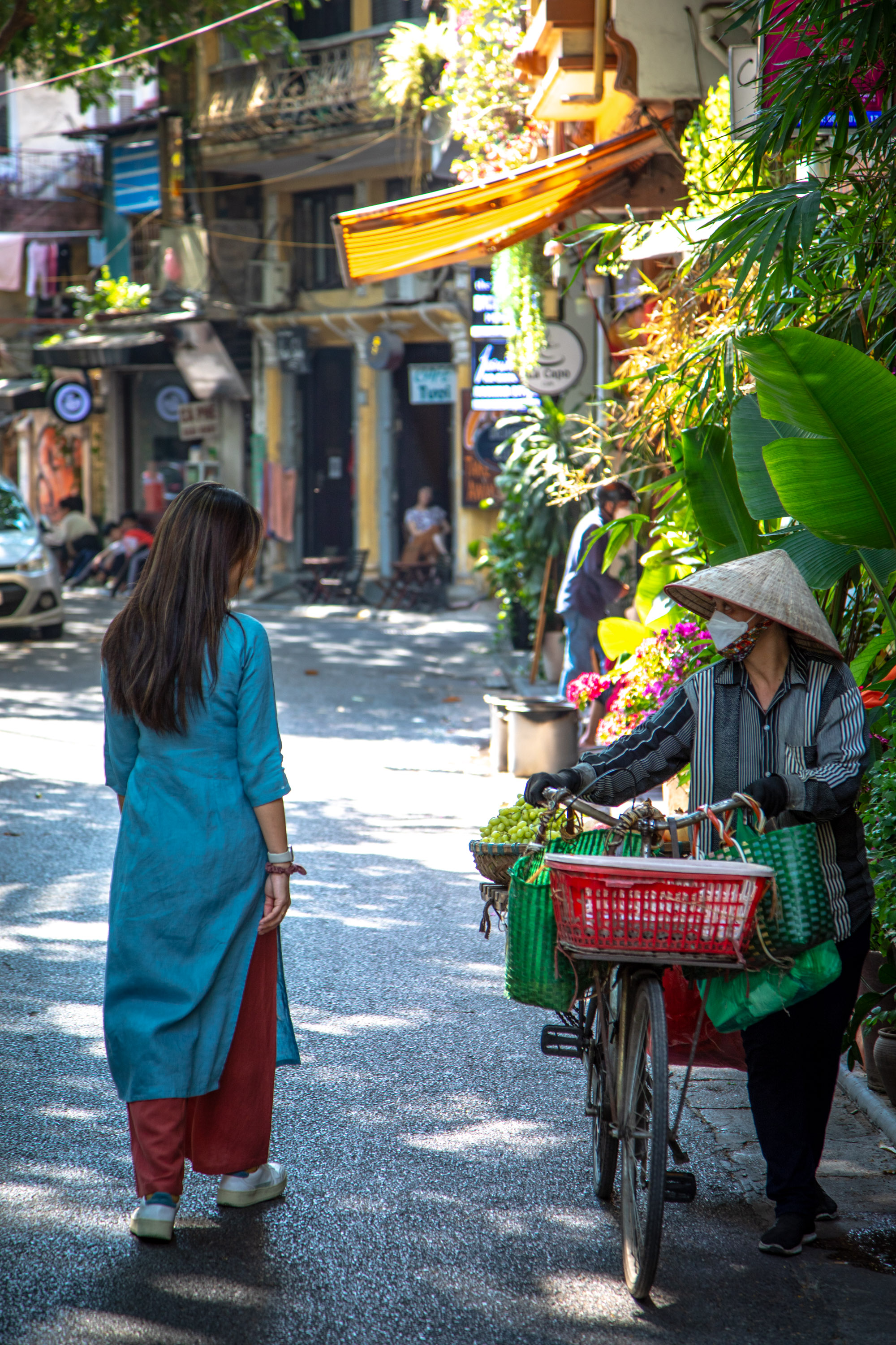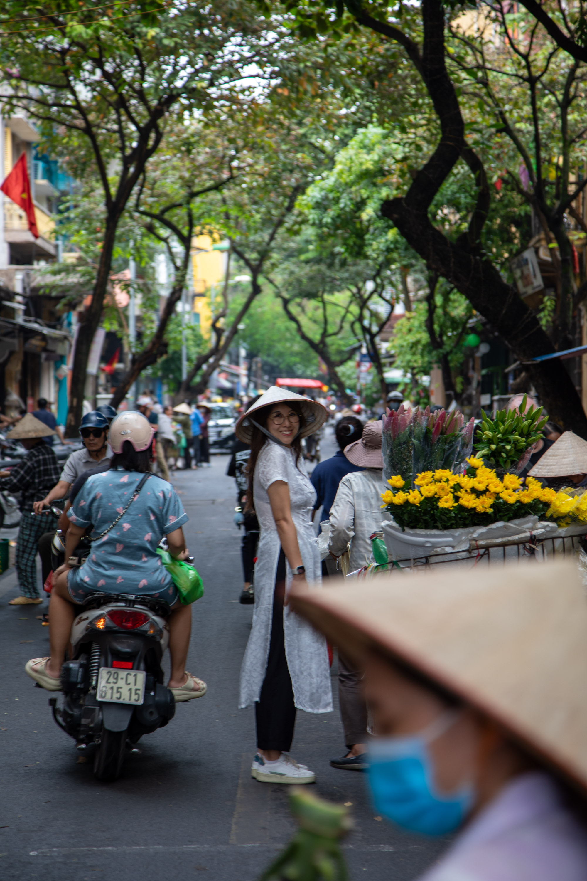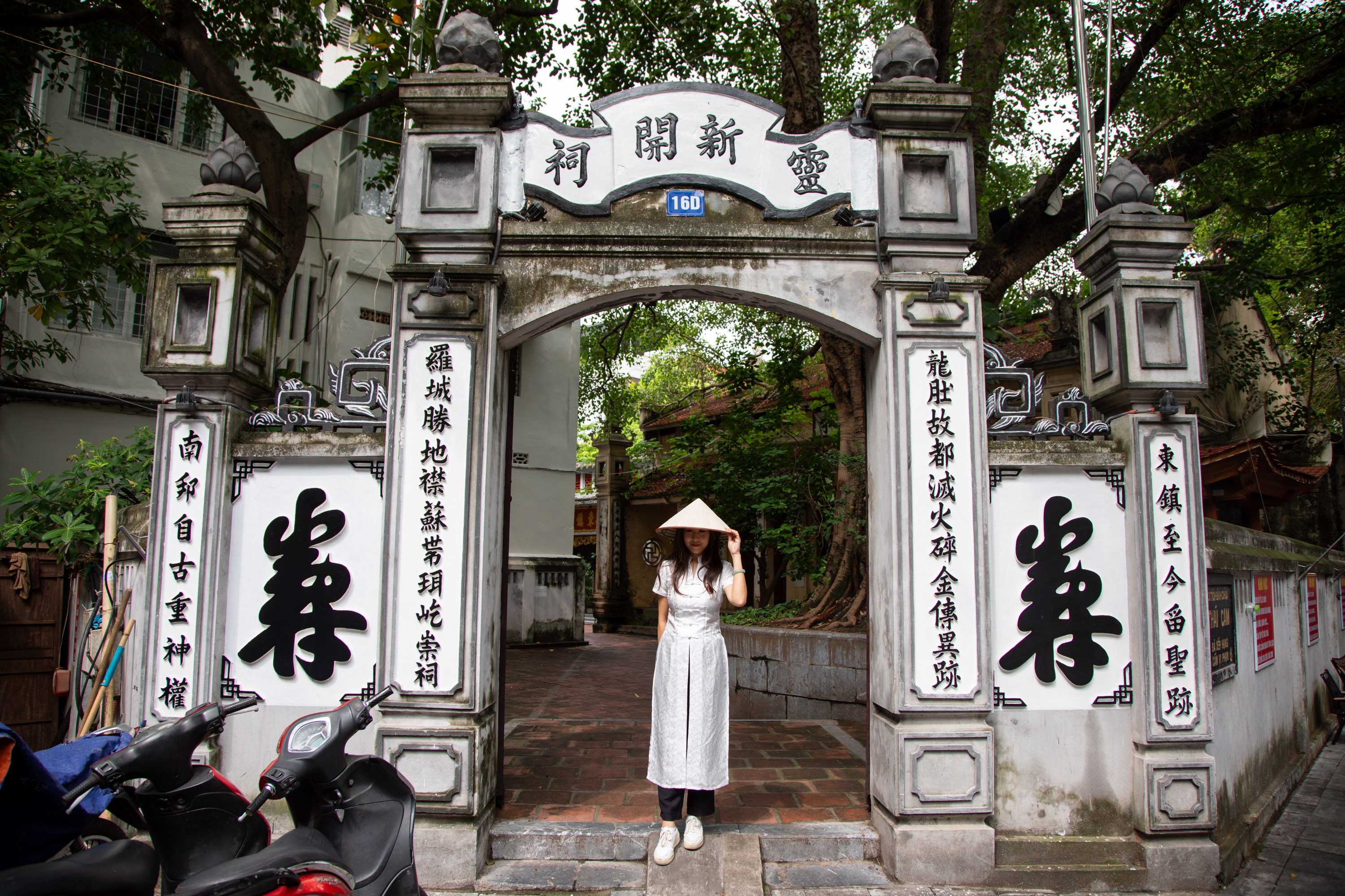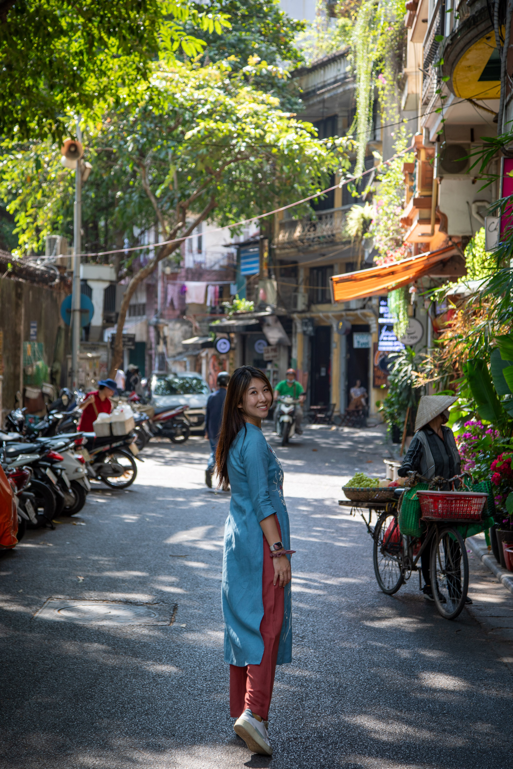 Le lendemain nous continuons notre déambulation dans les rues d’Hanoi habillé de la nouvelle Ao Dai en soie blanche faite sur mesure, le costume traditionnel est tout aussi adapté au cadre et les images sont captivantes.