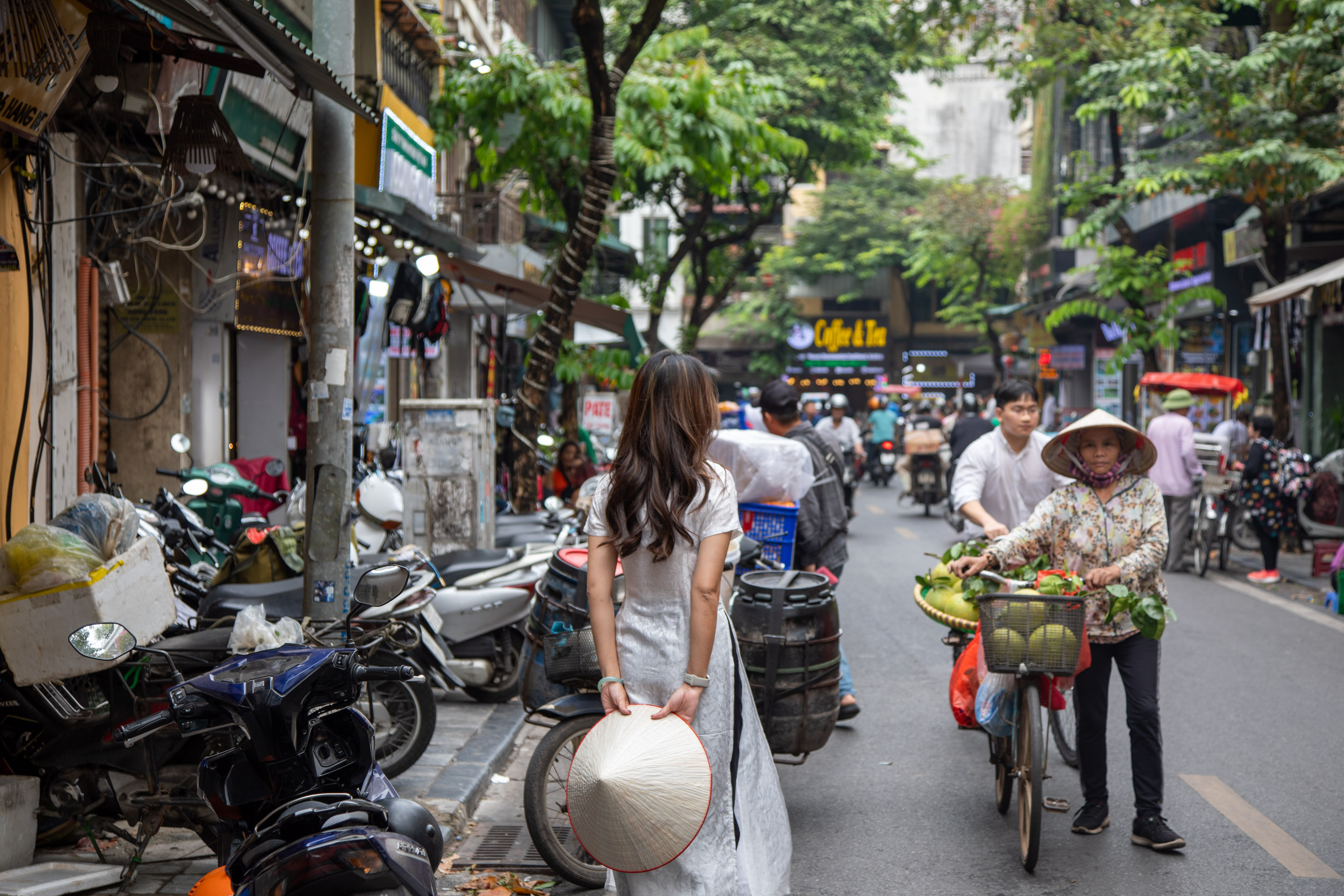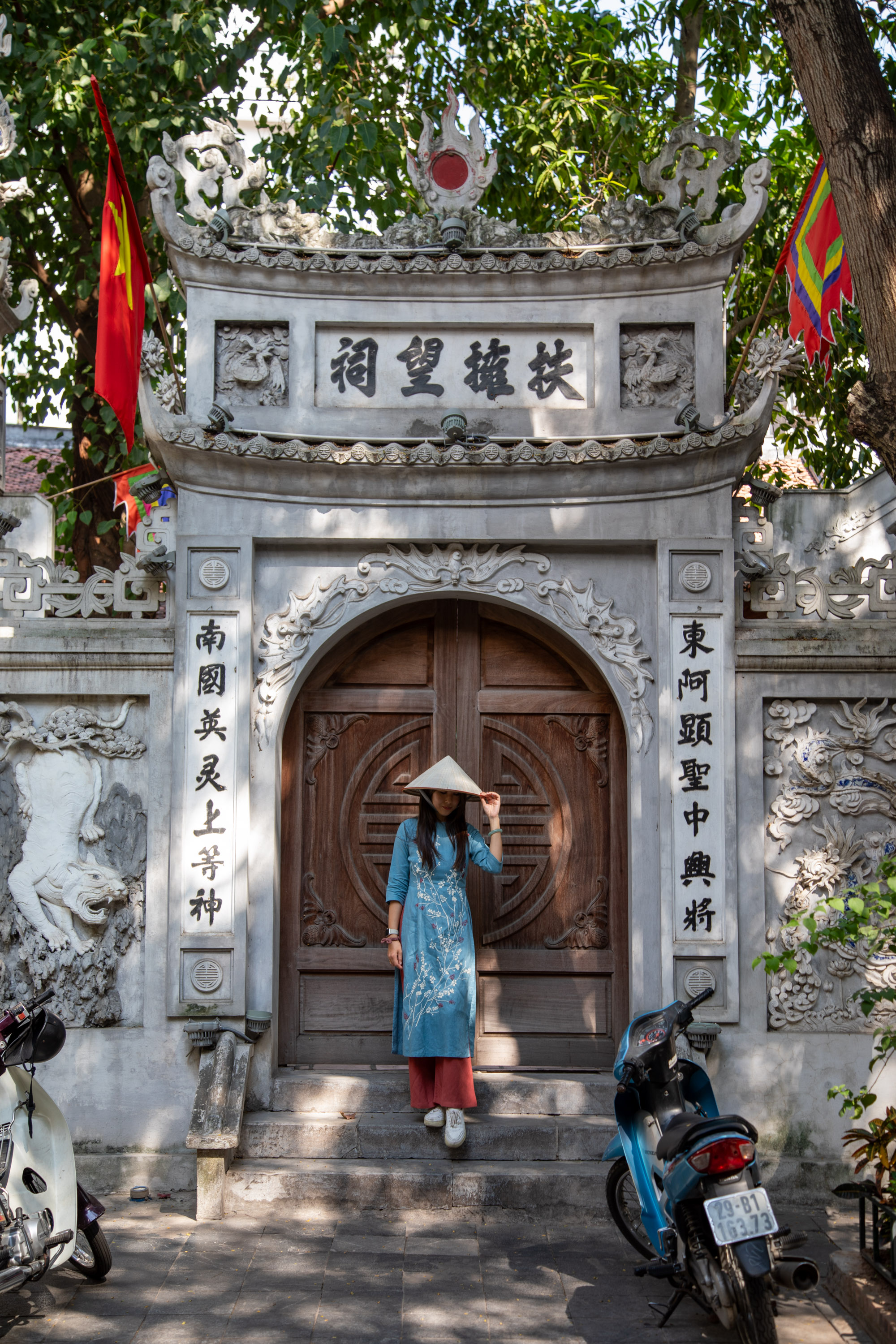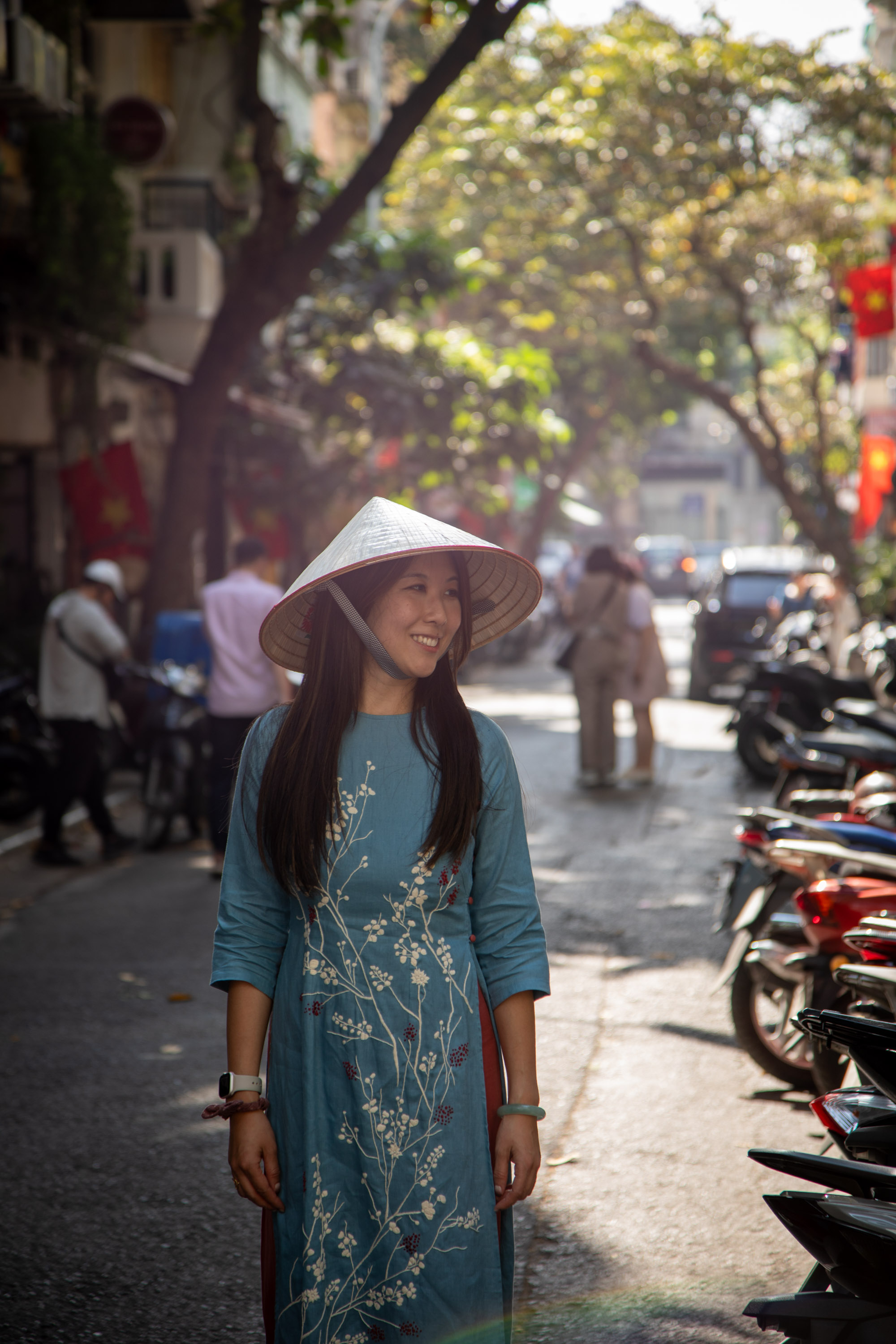 Le lendemain nous continuons notre déambulation dans les rues d’Hanoi habillé de la nouvelle Ao Dai en soie blanche faite sur mesure, le costume traditionnel est tout aussi adapté au cadre et les images sont captivantes.