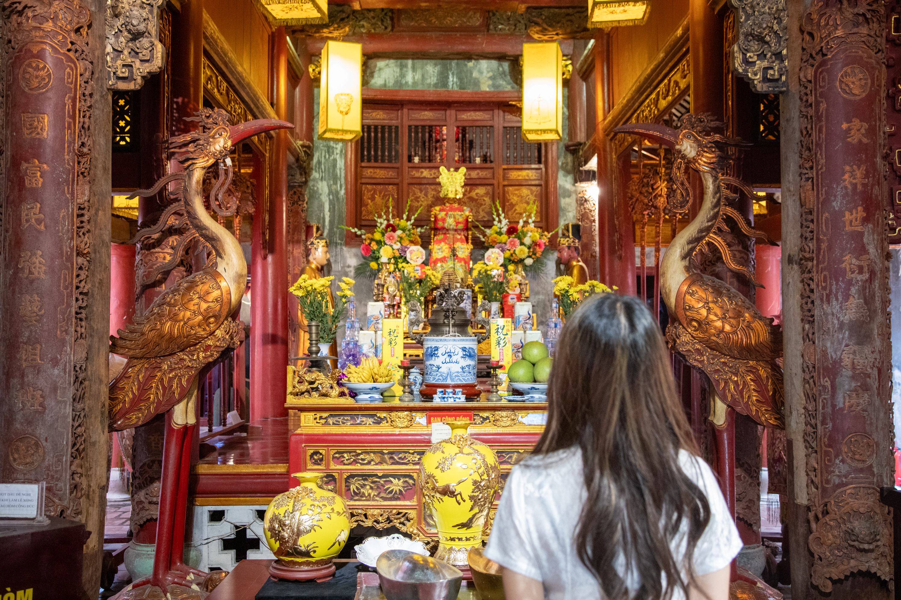 Certains temples ont des portes magnifiques avec de beaux caractères chinois peints sur les murs. Ce qui est étonnant c’est que le Vietnam a du abandonner l’usage des caractères chinois pour le remplacer par l’alphabet lors de la colonisation française. Le lien entre le son, mot et l’idée est maintenant déconnectée l’un de l’autre et c’est assez triste d’apprendre cela. Les chinois et sinophones peuvent donc lire ce qui est écrit sur les frontons des temples ou sur les tablettes mais pas les locaux.