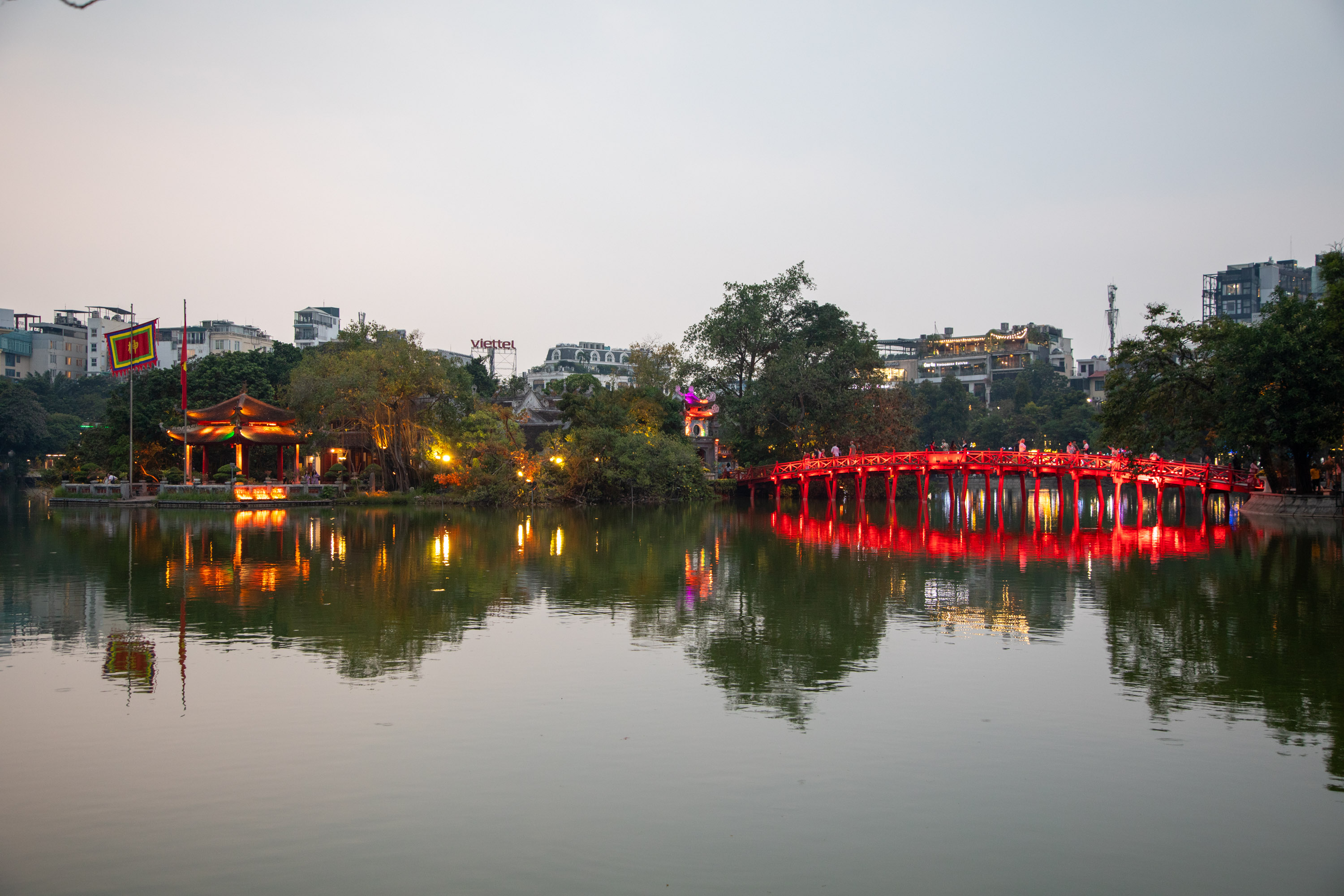 Nous faisons notre première promenade dans les rues de Hanoi et nous allons vivre notre première mauvaise expérience dans le pays. Nous allons retirer de l’argent au distributeur puis nous retournons découvrir les berges du lac de Hoàn Kiếm. Il y a beaucoup de monde et il est difficile de marcher, on piétine les uns derrière les autres. On prend une photo devant le temple de Ngoc Son qui est relié par un pont illuminé en rouge. C’est beau.