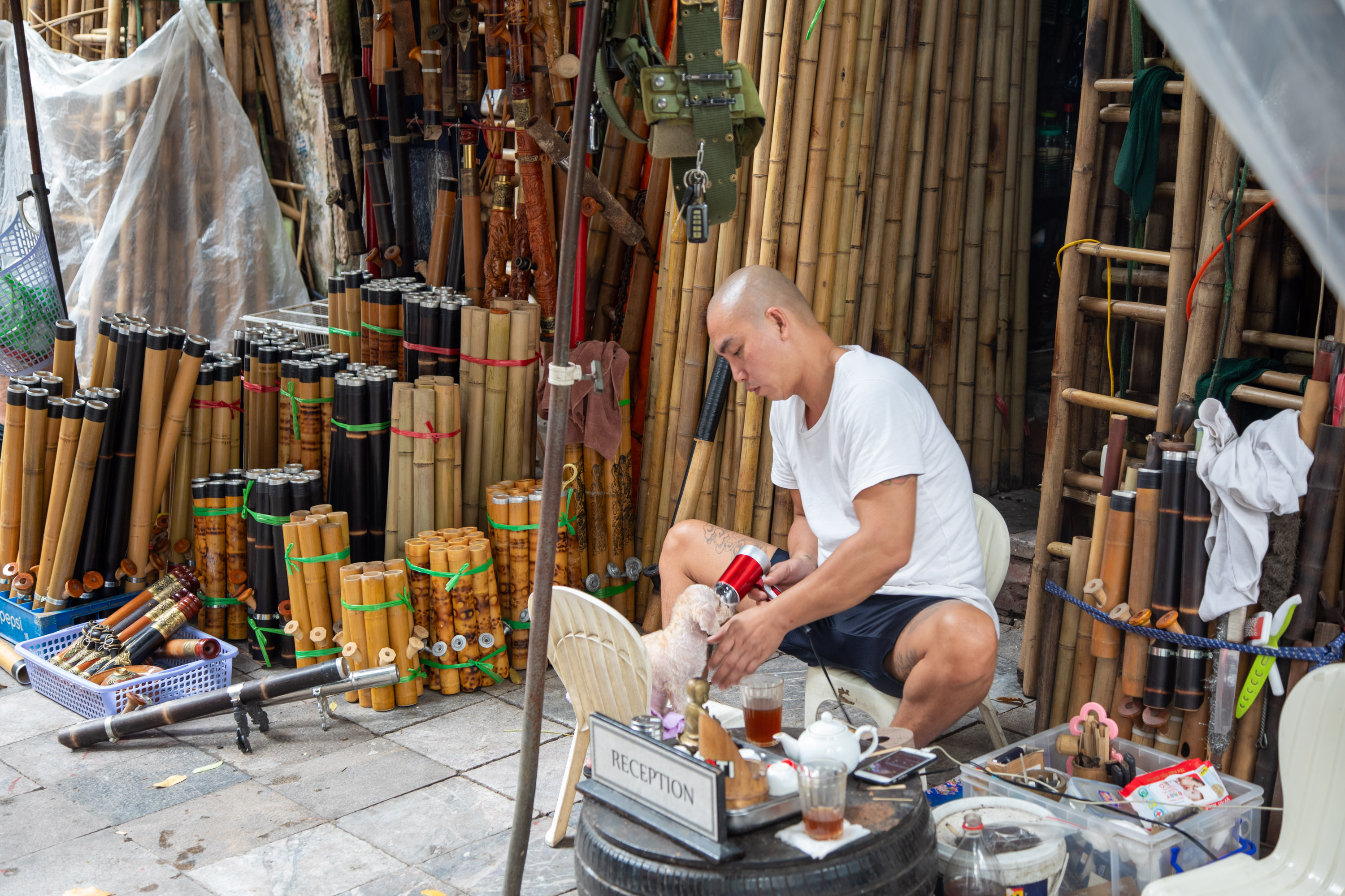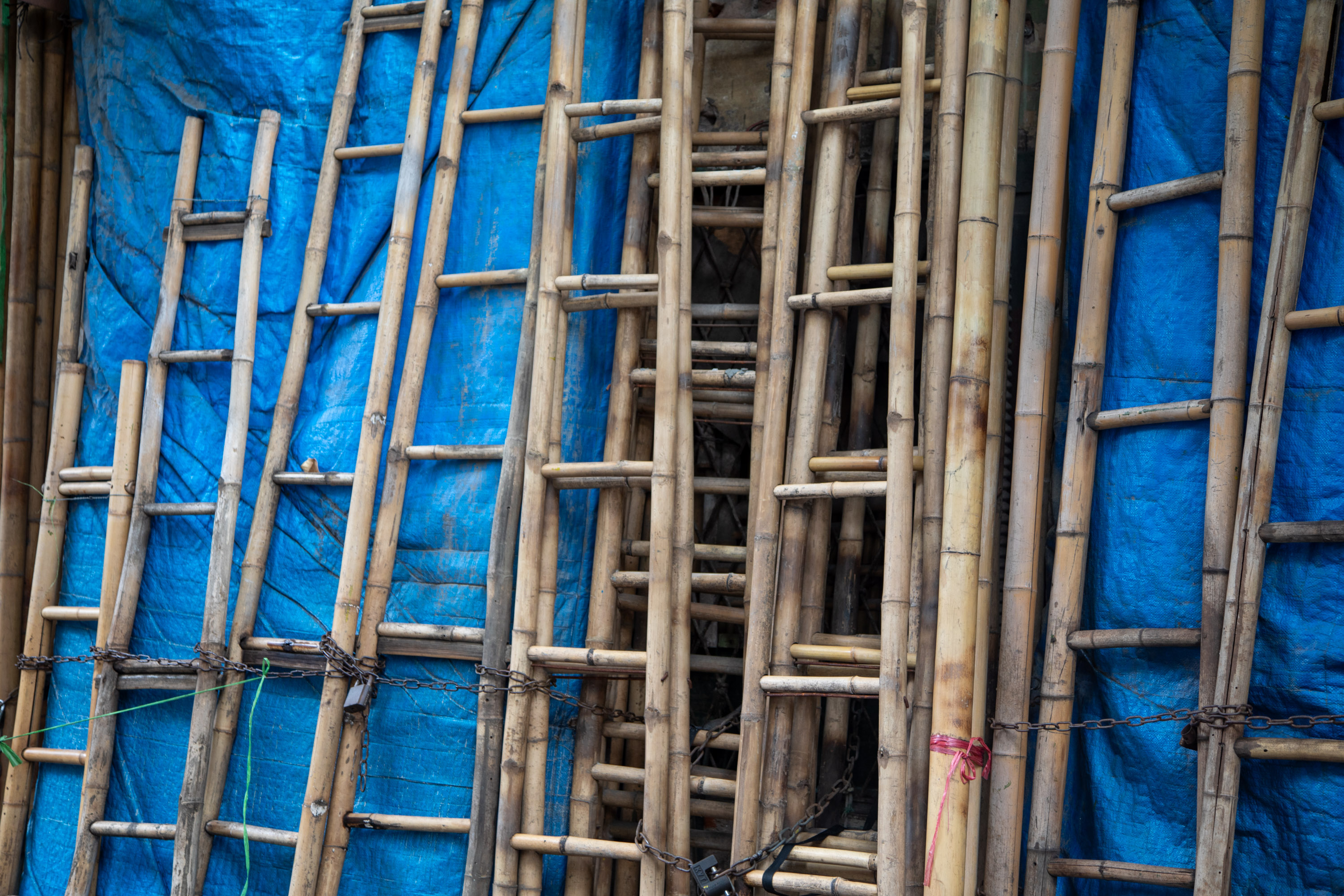 On remarque que les rues sont dédiées à certaines activités, on traverse un quartier entièrement consacré au bambou avec une enfilade de vendeurs d’échelles en bambou ou de chicha.
