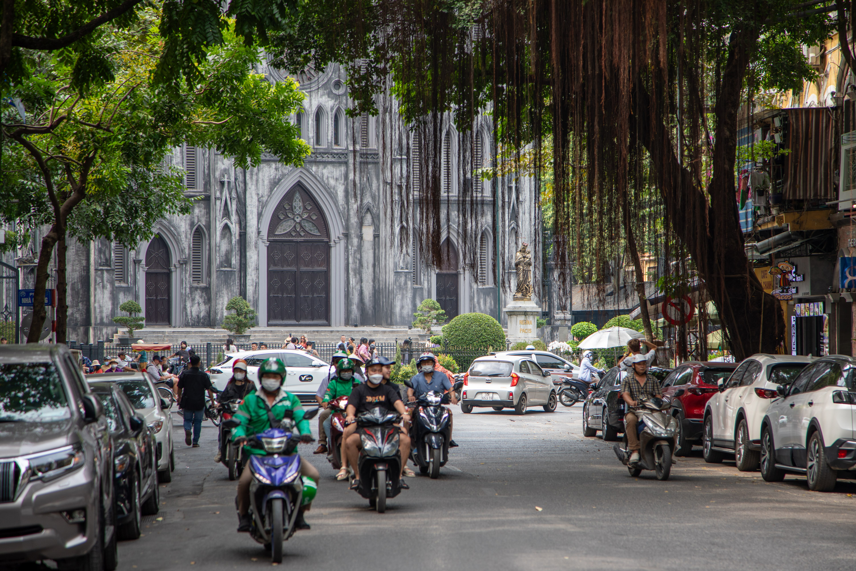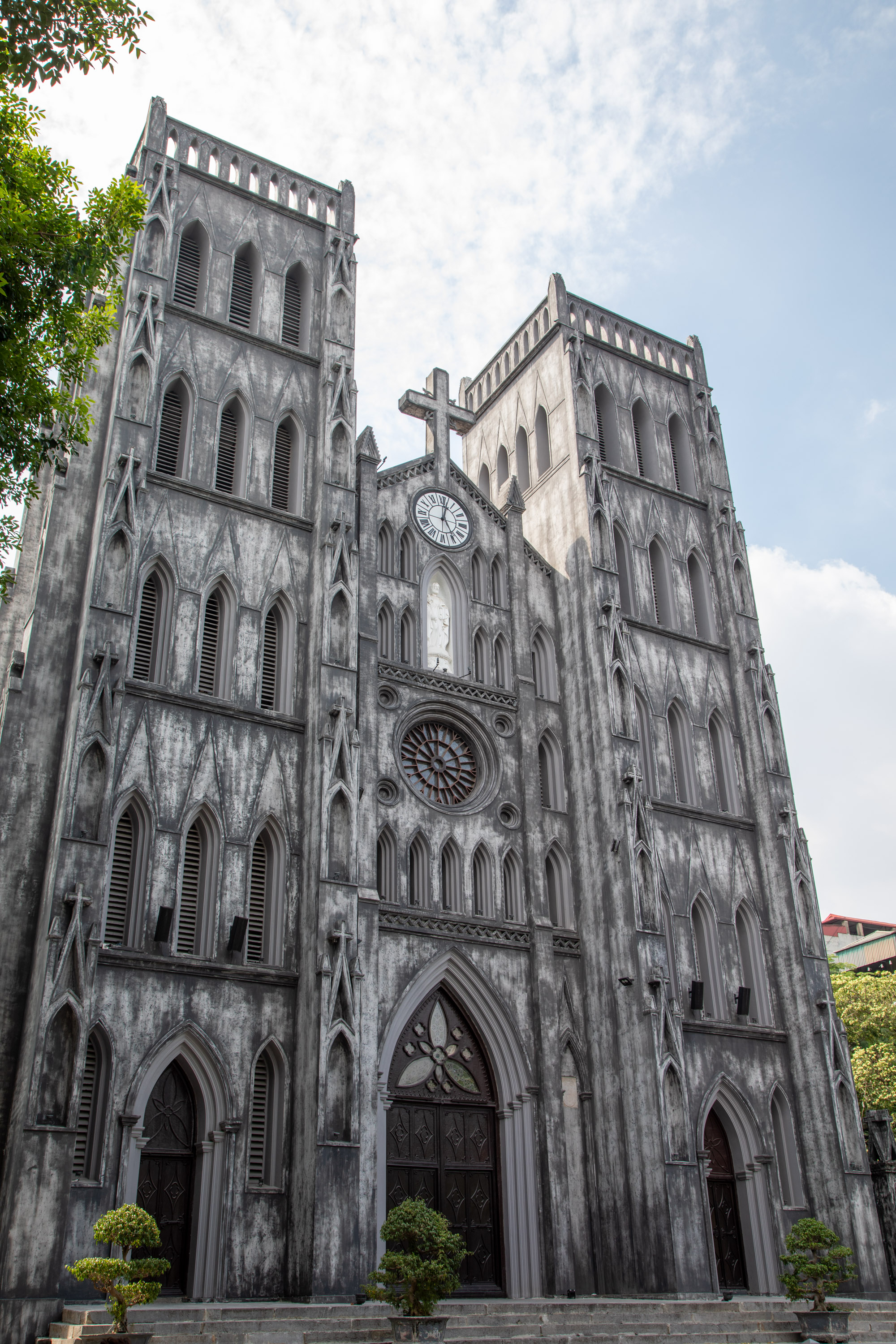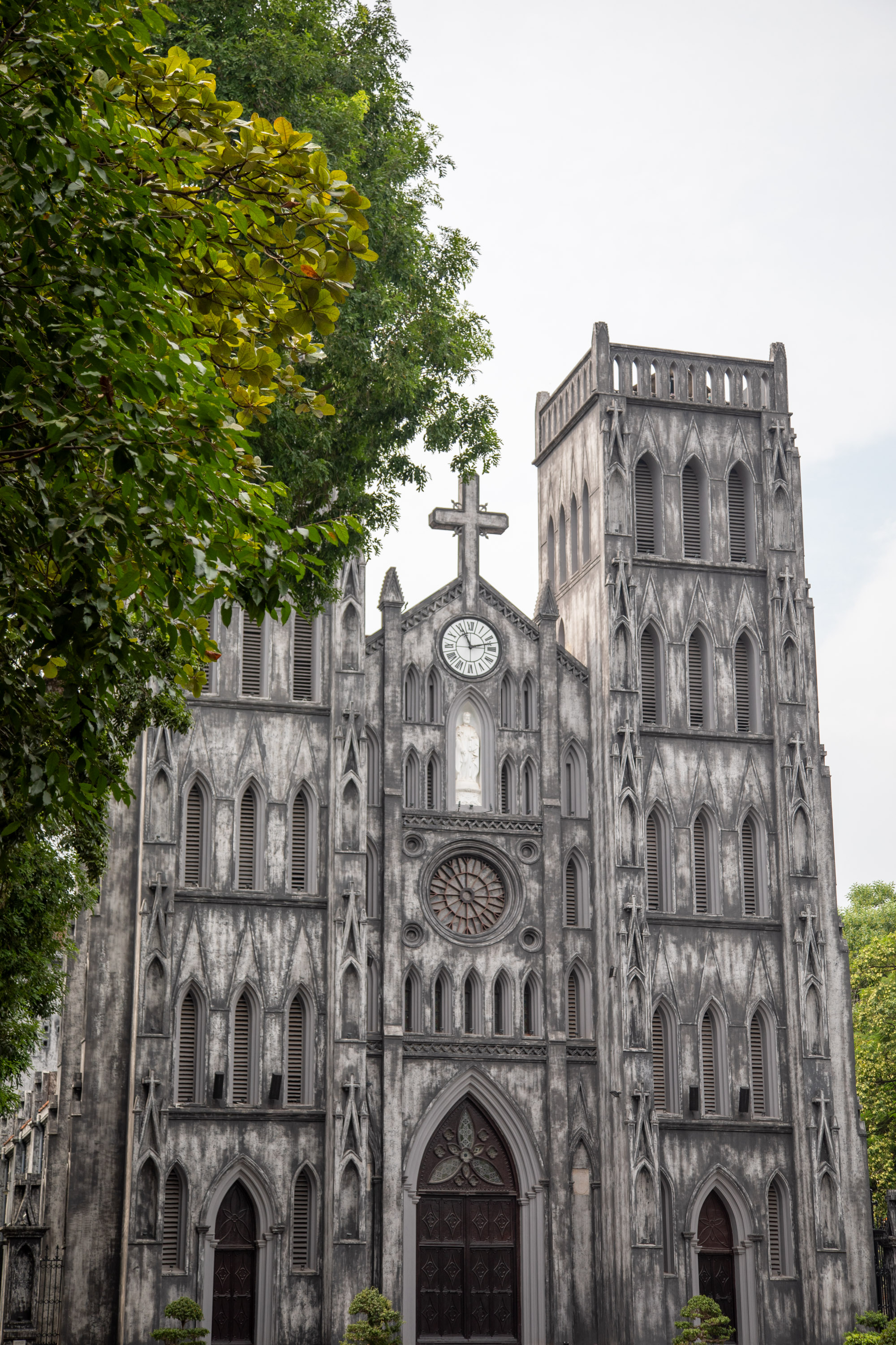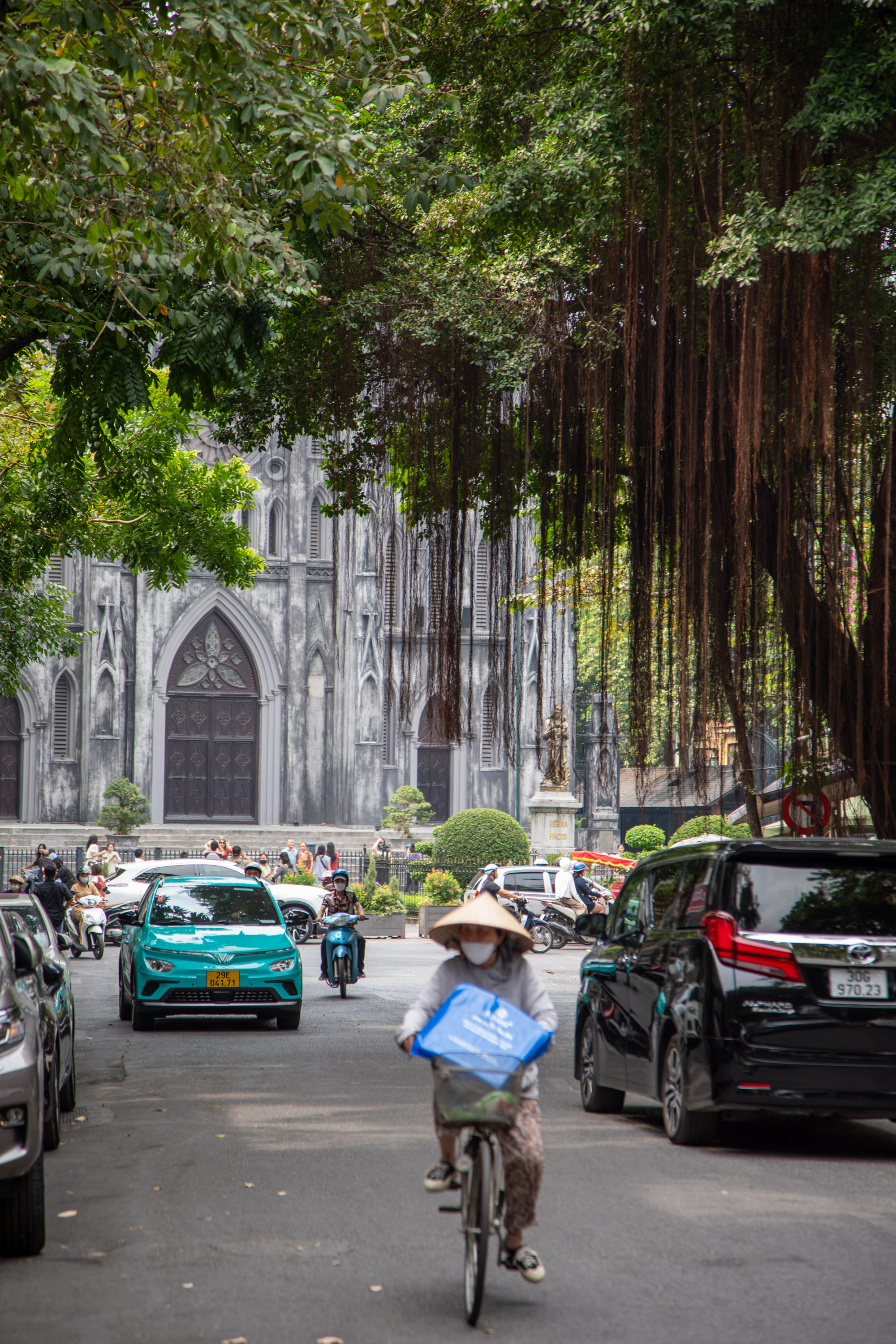 Ma copine tout à coup se rend compte que son sac à main est ouvert et que son iPhone a disparu. Cela a du se passer en quelques fractions de secondes parce qu’une minute avant sur la photo que l’on a pris, son sac était fermé et juste un peu après la fermeture éclair est ouverte. Cela casse clairement l’ambiance, on rentre à l’hotel pour essayer de le localiser avec l’ordinateur mais il est bien sur déconnecté. Heureusement je voyageais avec deux téléphones avec moi et je peux lui en fournir un autre en attendant, mais on perd un temps fou à récupérer tous les accès et comptes. L’ambiance est plombée et elle n’a plus envie de sortir ce soir, finalement on se dit qu’il faut quand même passer à autre chose et on a pu finalement paramétrer correctement mon iPhone en réserve donc le moral revient quand même. On sort manger un Pho dans une ruelle, notre premier Pho du séjour et surement pas le dernier. On aime vraiment cette soupe de nouille avec des tranches de boeuf et des feuilles de coriandre. On rentre avec le coeur un peu lourd pour notre première soirée au Vietnam. La conclusion est qu’il faut vraiment faire attention dans les environs du lac Hoàn Kiếm. On s’est renseigné après coup sur Internet il y a un grand nombre de messages de touristes qui se sont fait voler leur téléphone dans cette zone, donc on espère que ce message permettra à d’autres voyageurs d’éviter la même mésaventure. Le lendemain pour remonter le moral de ma copine, je lui propose de commencer la journée par acheter un vêtement traditionnel vietnamien, une robe Ao Dai fait sur mesure. Il y a beaucoup de magasins dans le centre ville qui offre ces vêtements avec tous les prix et qualité. On choisit un magasin qui fait des Ao Dai sur mesure en soie et on viendra la récupérer en fin de journée, en attendant on décide de parcourir la ville à pieds et de trouver un café pour s’installer. On arrive aux pieds de la cathédrale de St. Joseph Cathedral, un des bâtiments que la France a construit au Vietman pendant les années de colonisation. C’est étonnant de trouver dans cet environnement tropical asiatique une cathédrale conçue par des français. On trouve des arbres banyans avec leurs racines qui poussent sur les branches, cela nous rappelle le centre ville de Canton, à Shamian où l’on trouve une ressemblance dans l’architecture et la nature. Cette île était tout comme l’Indochine d’ailleurs aussi une concession française sur la rivière des perles.