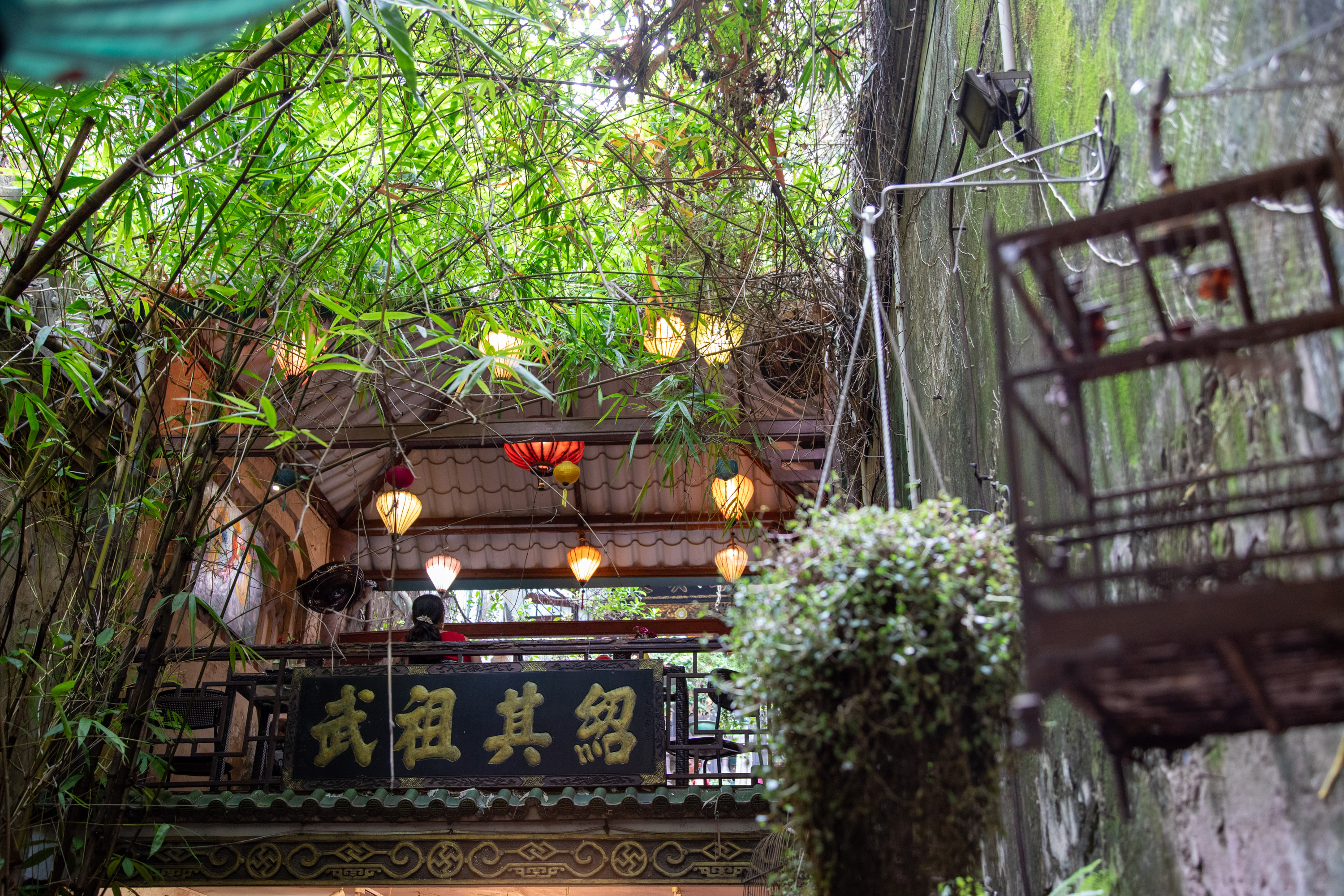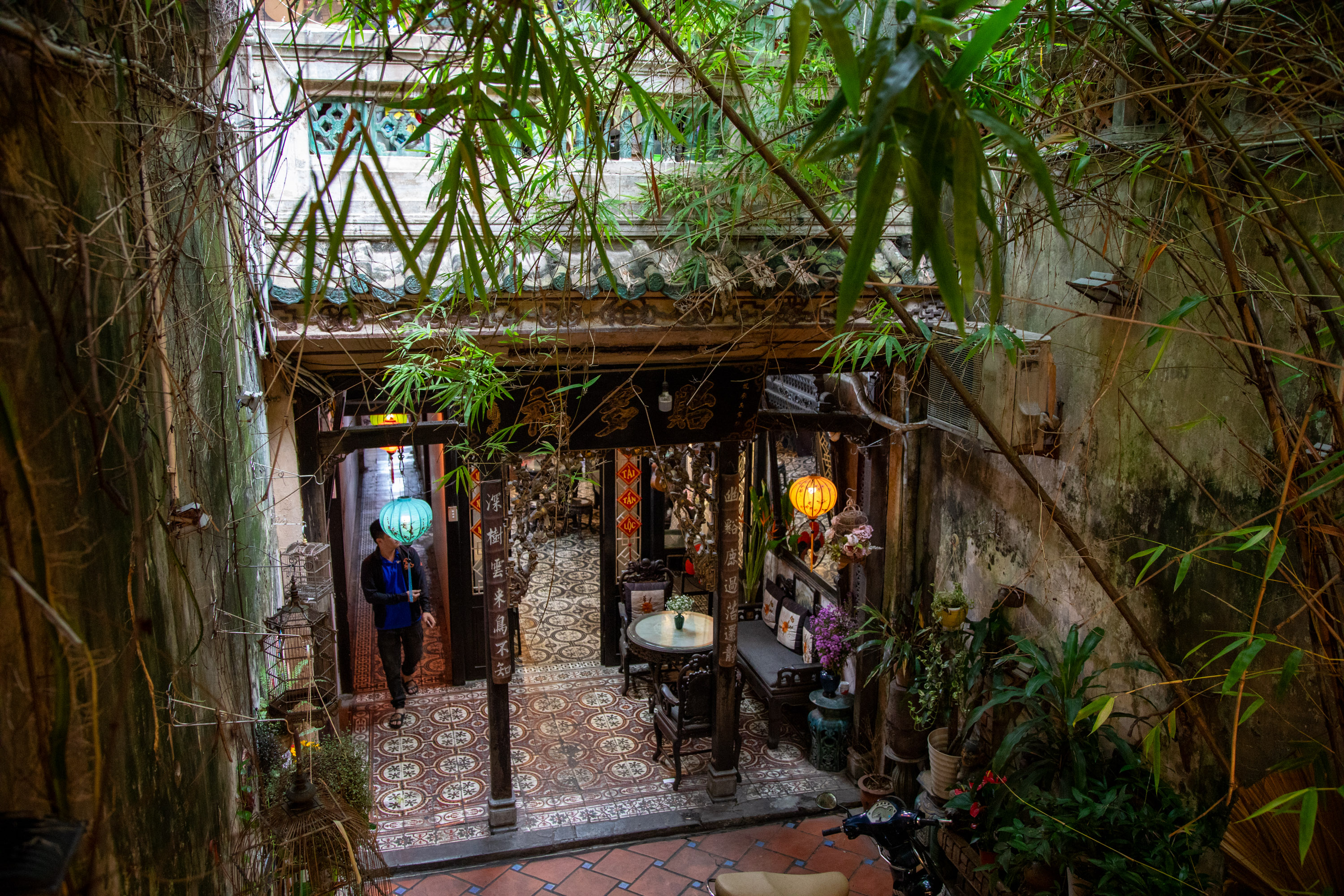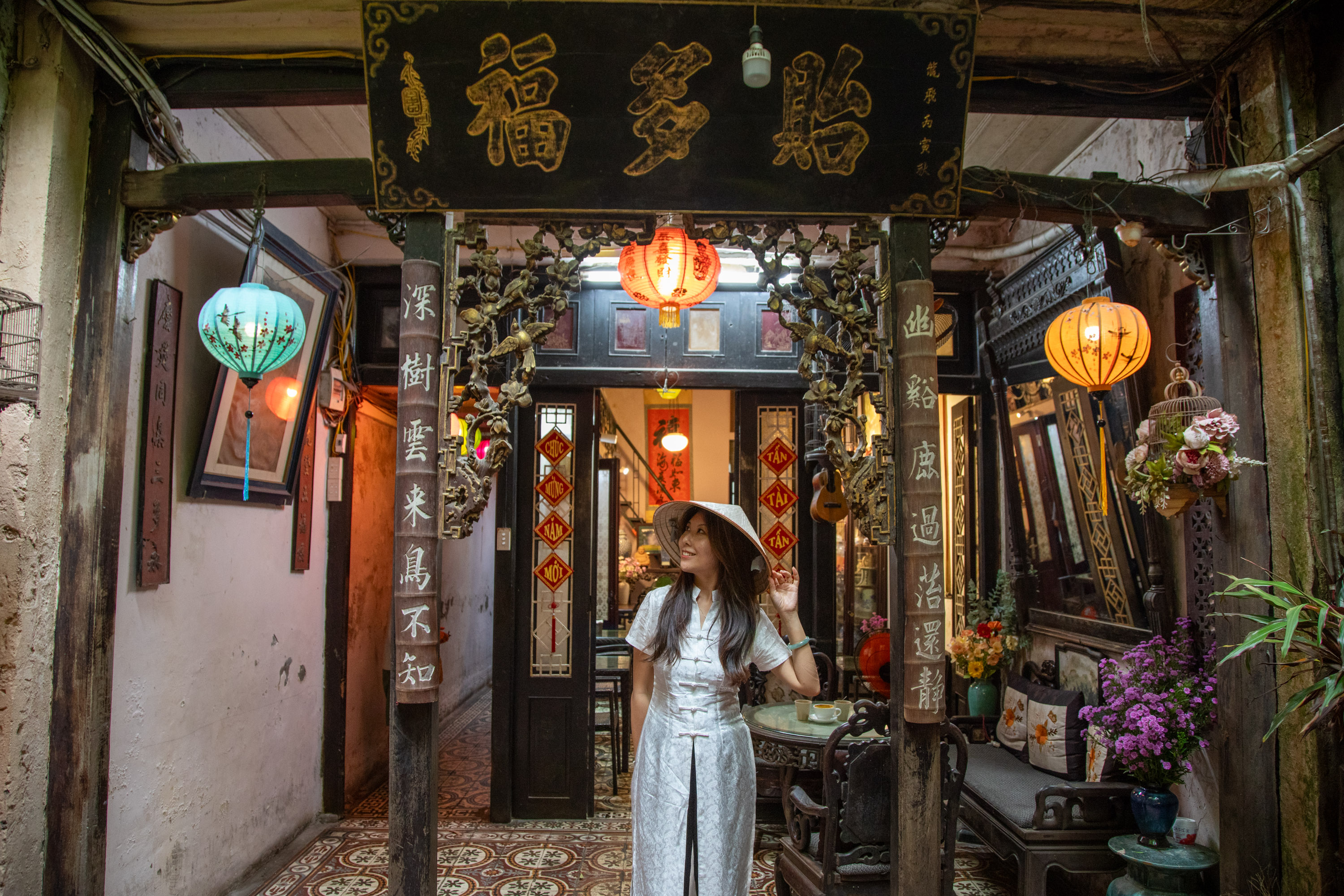 Il fait une chaleur étouffante aujourd’hui et il faut que l’on fasse une petite pause après cette matinée à marcher. On prend un Grab jusqu’au Cafe Phố Cổ, le chauffeur nous dépose devant l’entrée mais on ne trouve pas où c’est. On cherche autour mais il n’y a que des magasins à touriste ici. En fait, on remarque un petit panneau discret qui donne la direction, il faut entrer dans un couloir dans un des magasins pour arriver dans une arrive cour et là c’est vraiment inattendu, on est subjugué. Clairement notre café préféré de tout le séjour à Hanoi, un havre de paix en pleine ville.