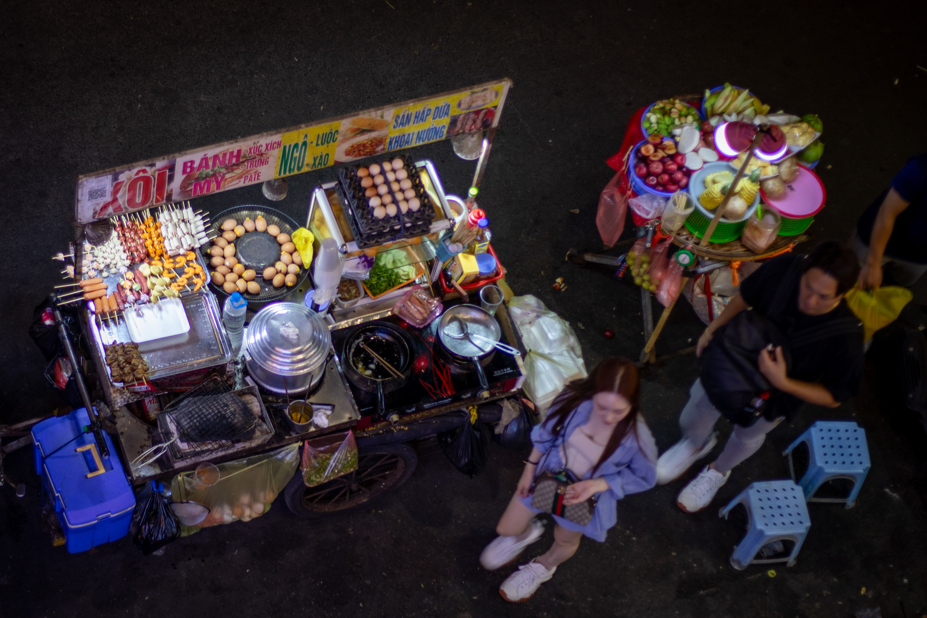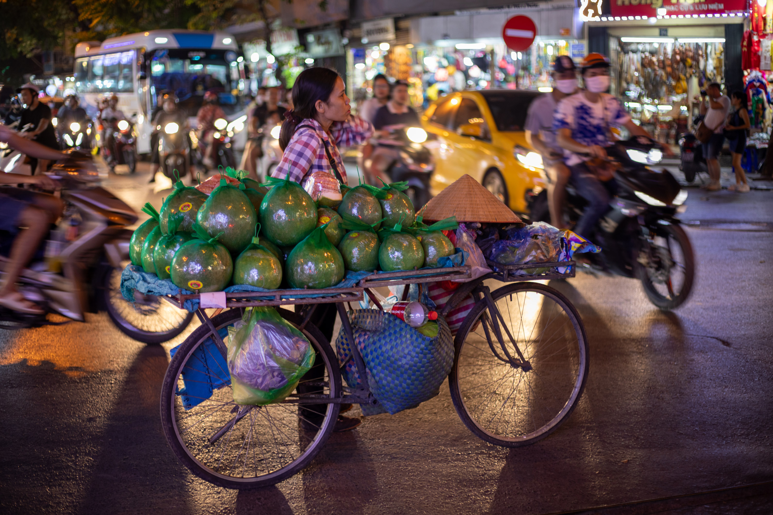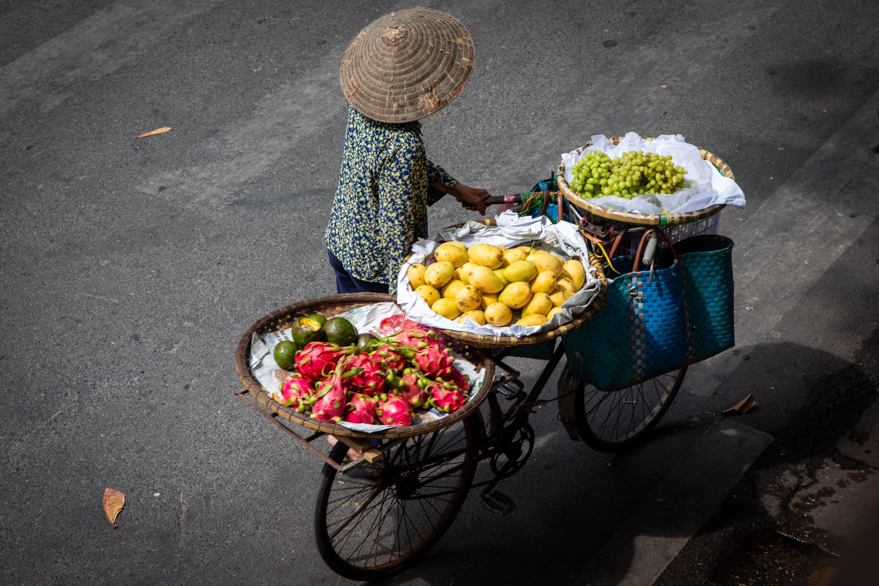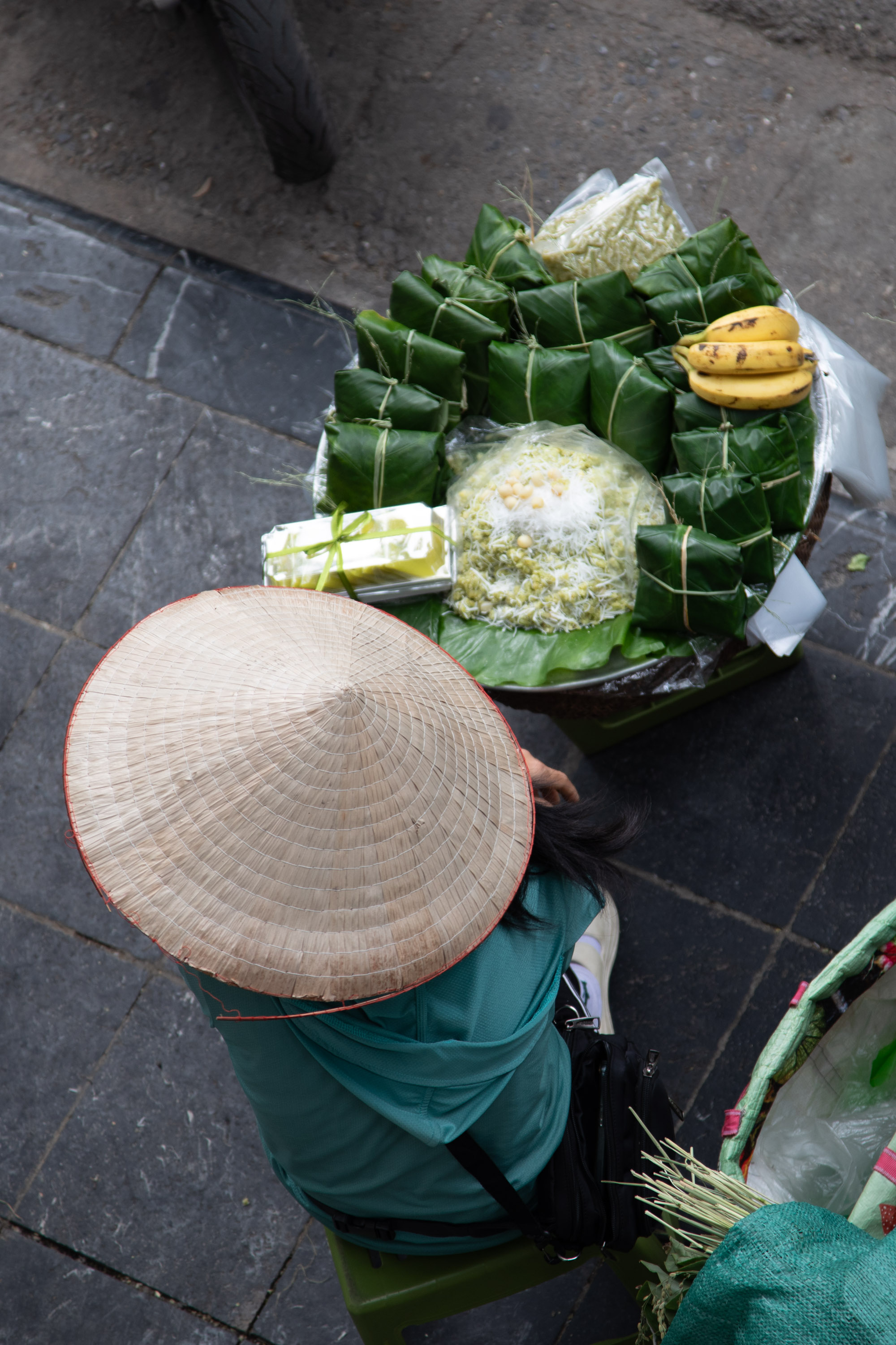 On boit alors notre premier café vietnamien, le début d’une histoire d’amour. On a choisi un coconut coffee et un egg coffee, c’est très sucré, c’est très pâteux, mais c’est vraiment étonnant, c’est frais, donc parfait par ce temps chaud et humide. Rien de mieux qu’un bon café assis en terrasse à contempler la vie, on commence à oublier la mauvaise expérience du téléphone de la veille. Il y a des vendeuses ambulantes qui proposent des fruits ou des snacks sur leur vélo. Elles portent le chapeau pointu traditionnel vietnamien, un des symboles du pays. Il faut dire qu’il fait très chaud ici et le soleil est très dur, il est nécessaire de protéger sa peau.