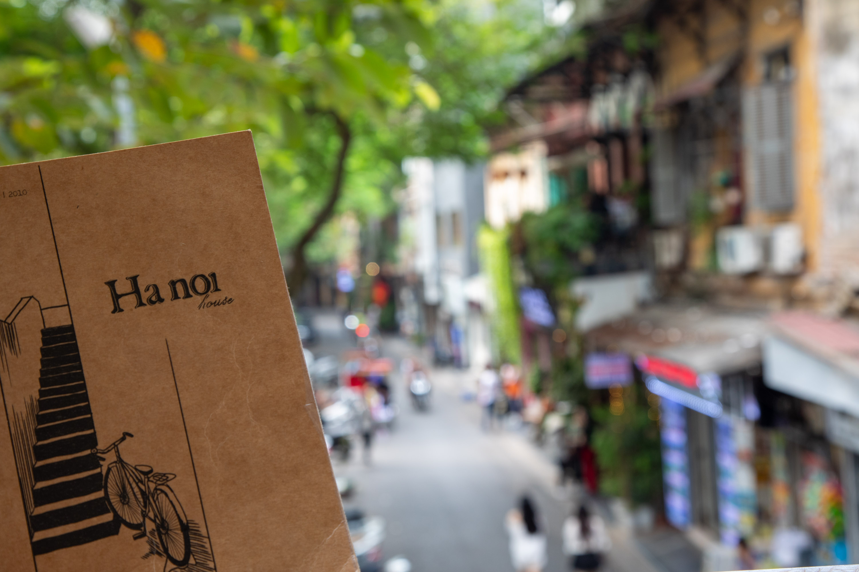 On s’installe sur la terrasse du Hanoi House café, qui surplombe la rue et offre une vue panoramique sur l’activité qui se déroule en bas sous nos yeux.