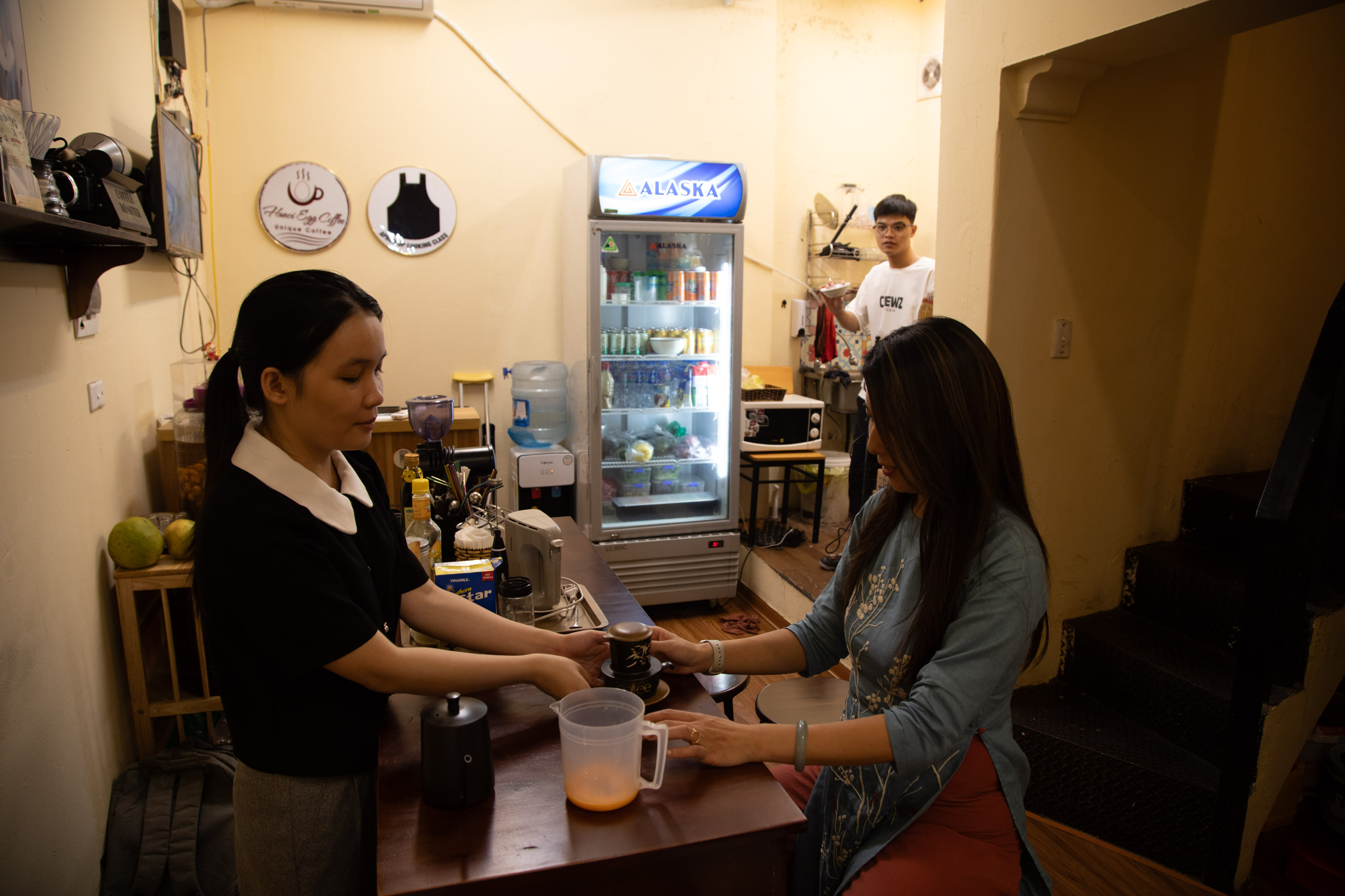 Ma copine voulait absolument prendre un cours de cuisine avant de rentrer, mais c’est souvent organisé le matin et en plus on a déjà réservé pour le diner de ce soir. A proximité de l’hotel on trouve un café qui propose d’apprendre à faire différents types de cafés vietnamiens, comme le egg coffee, le salted coffee, le coconut coffee. On entre et on s’organise une courte formation pour en découvrir les secrets de fabrication.