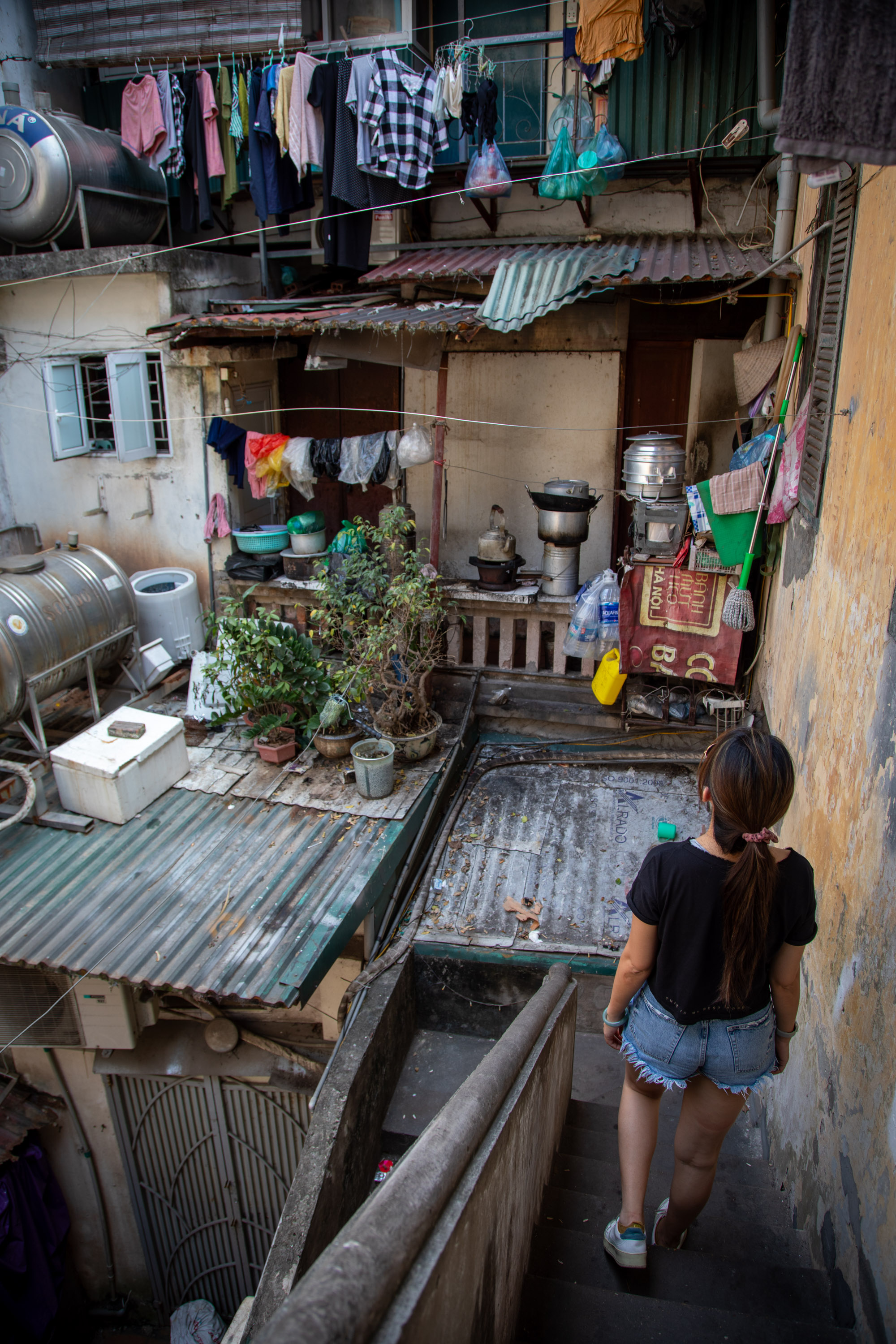 On quitte le café pour continuer notre découverte d’Hanoi. L’entrée du café est aussi très intéressante, il faut prendre un escalier dans un vieil immeuble d’habitation, c’est très encombré et difficile d’imaginer qu’il y a un café à l’étage au milieu des appartements.