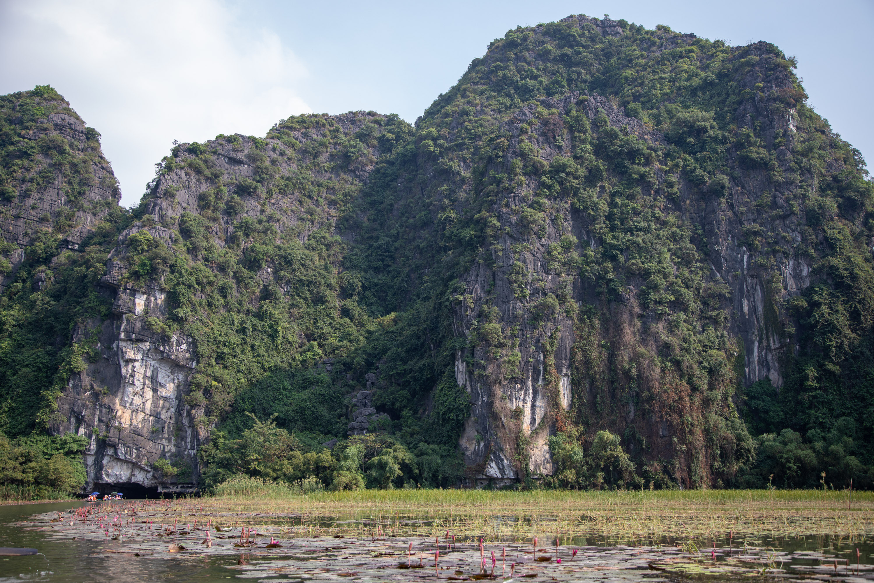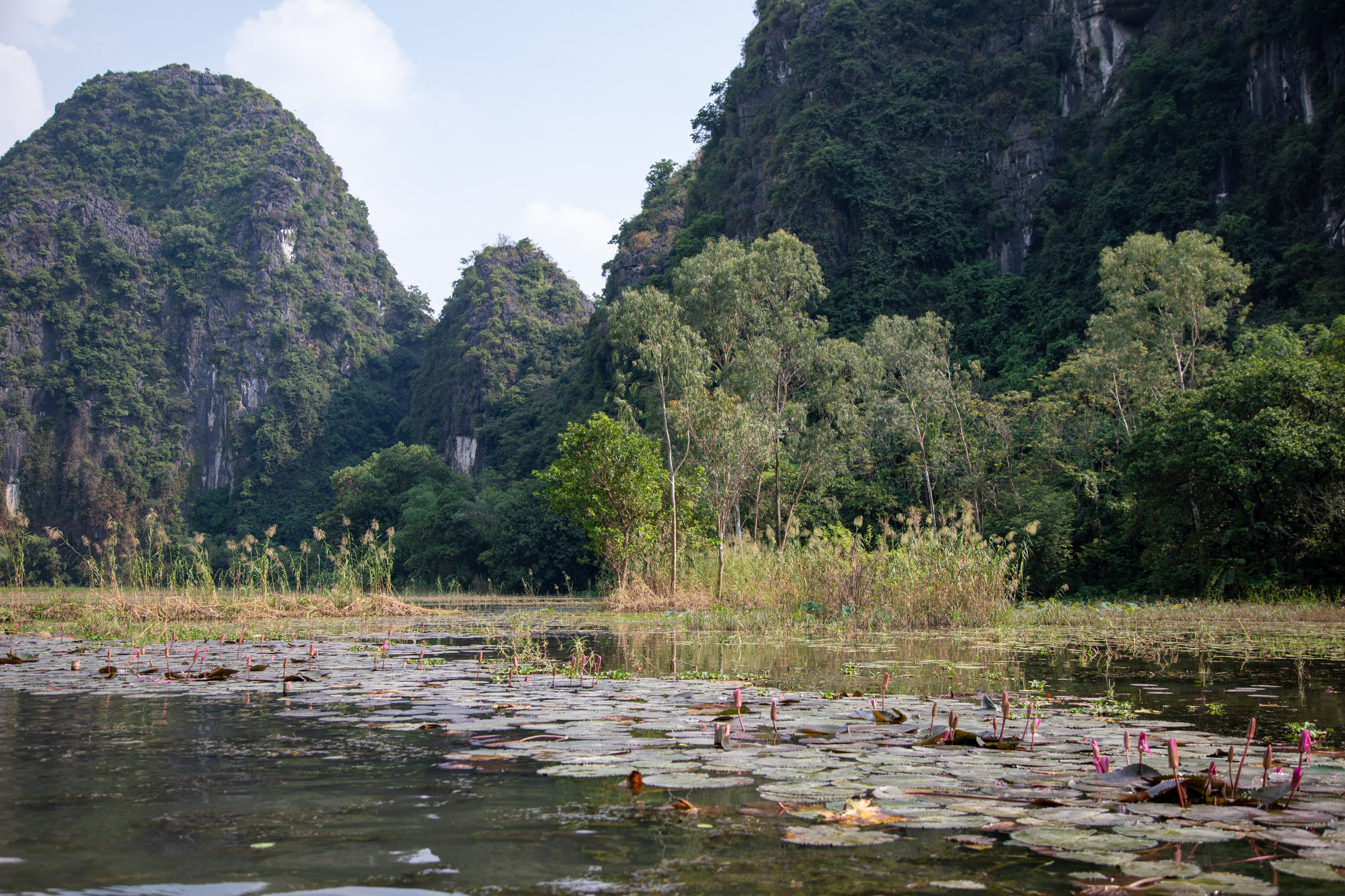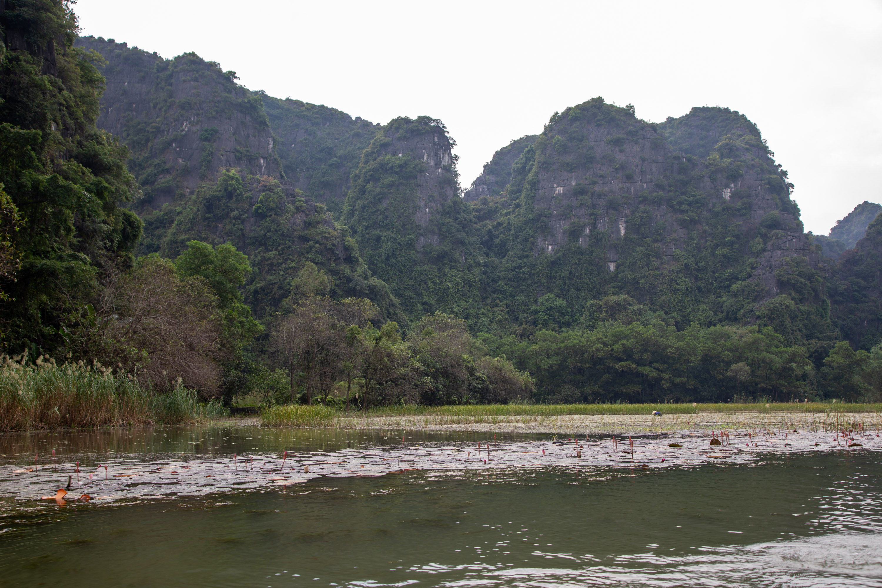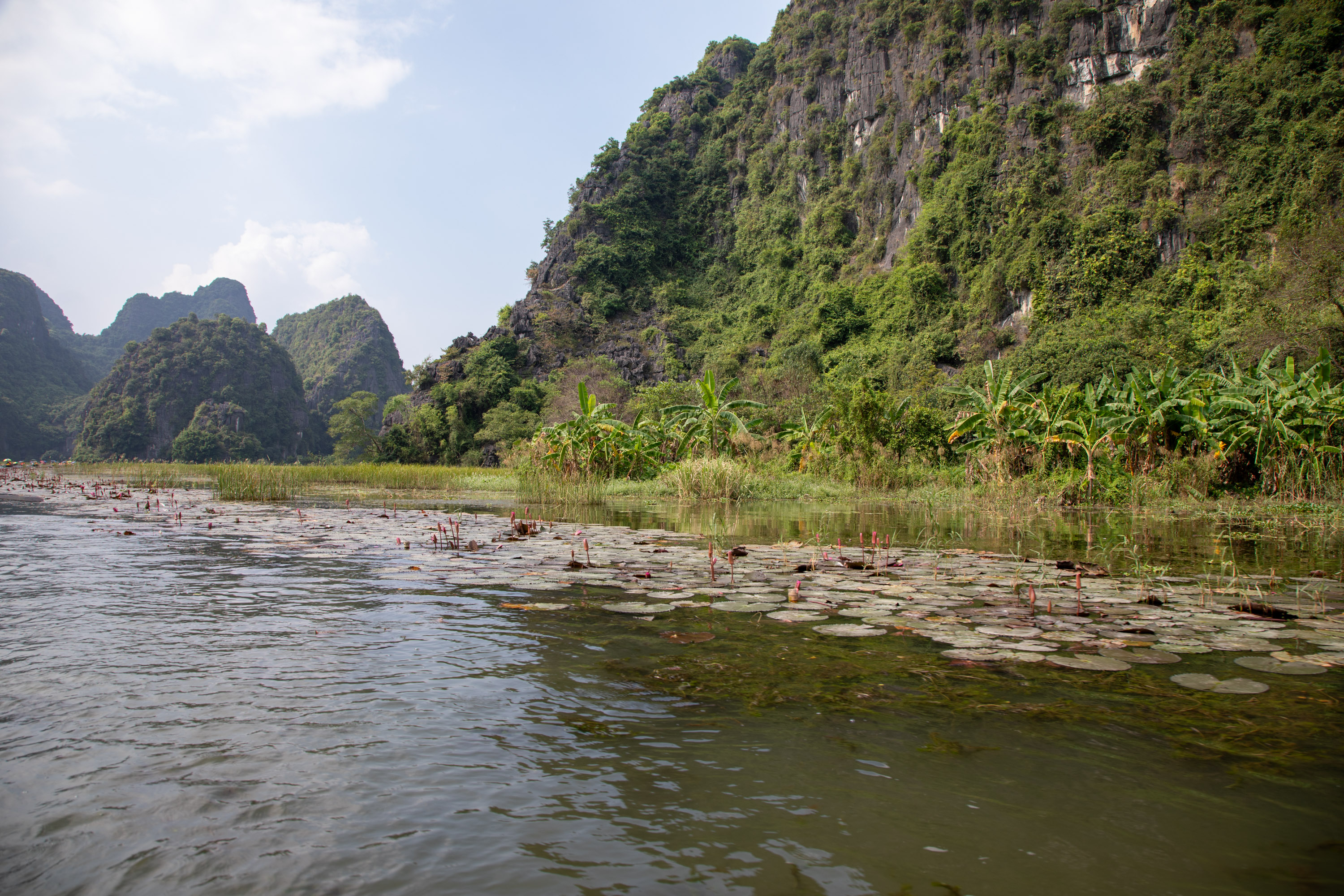 On ressort de la grotte et on arrive de nouveau dans ce paysage bucolique de la campagne vietnamienne. Il y a des lotus qui poussent sur le bord du cours d'eau, les montagnes tombent à pic, la végétation est luxuriante.