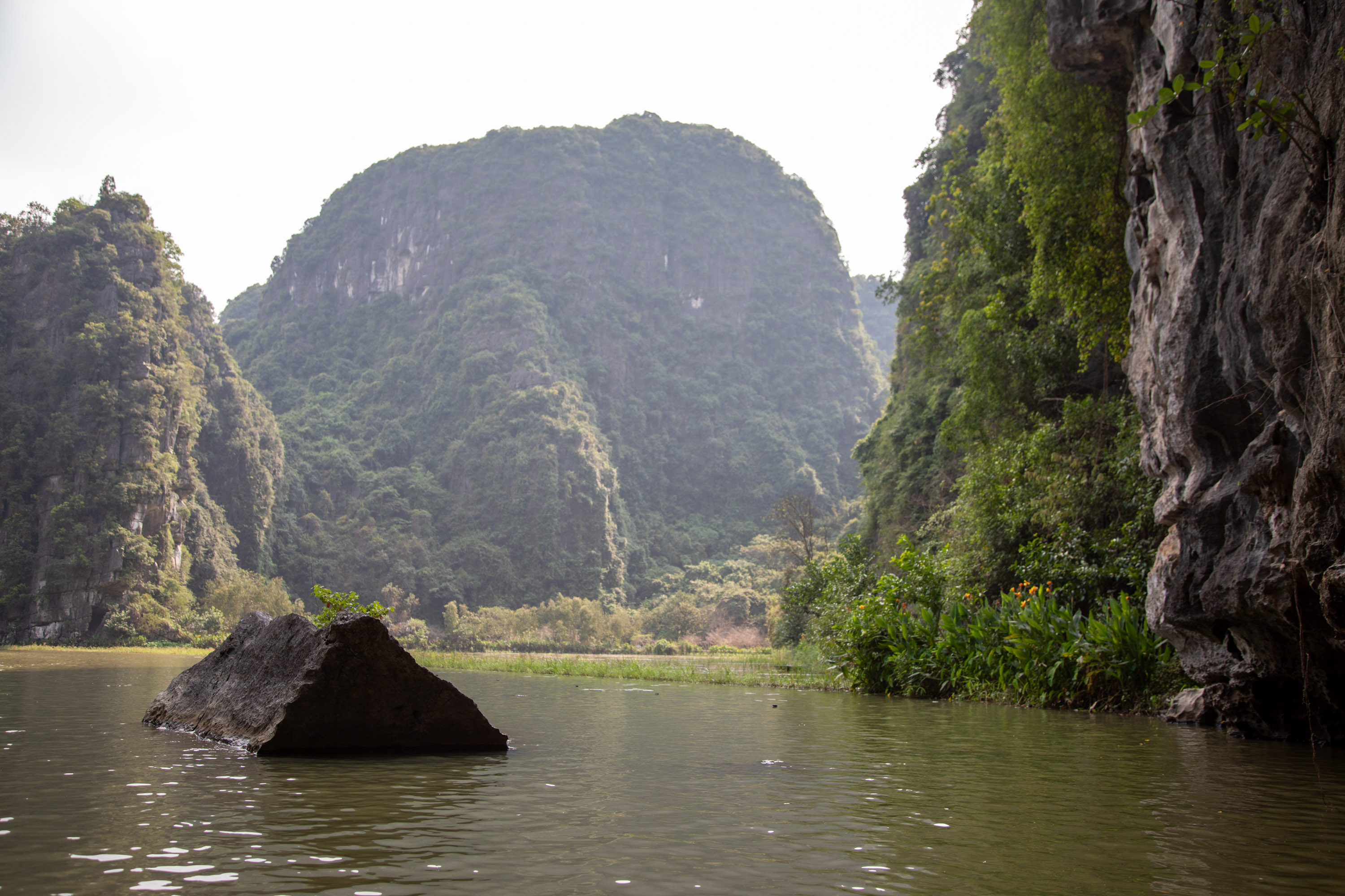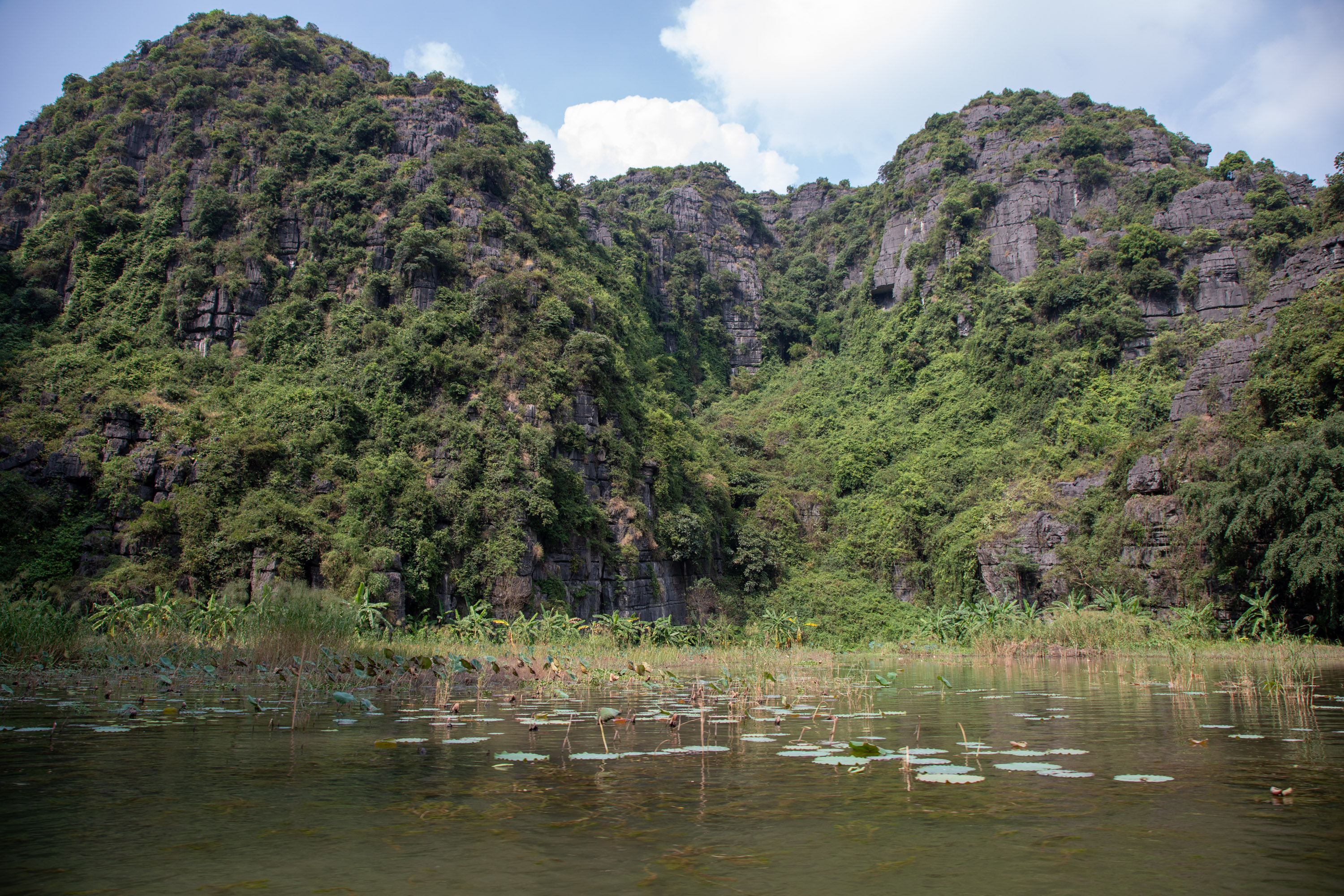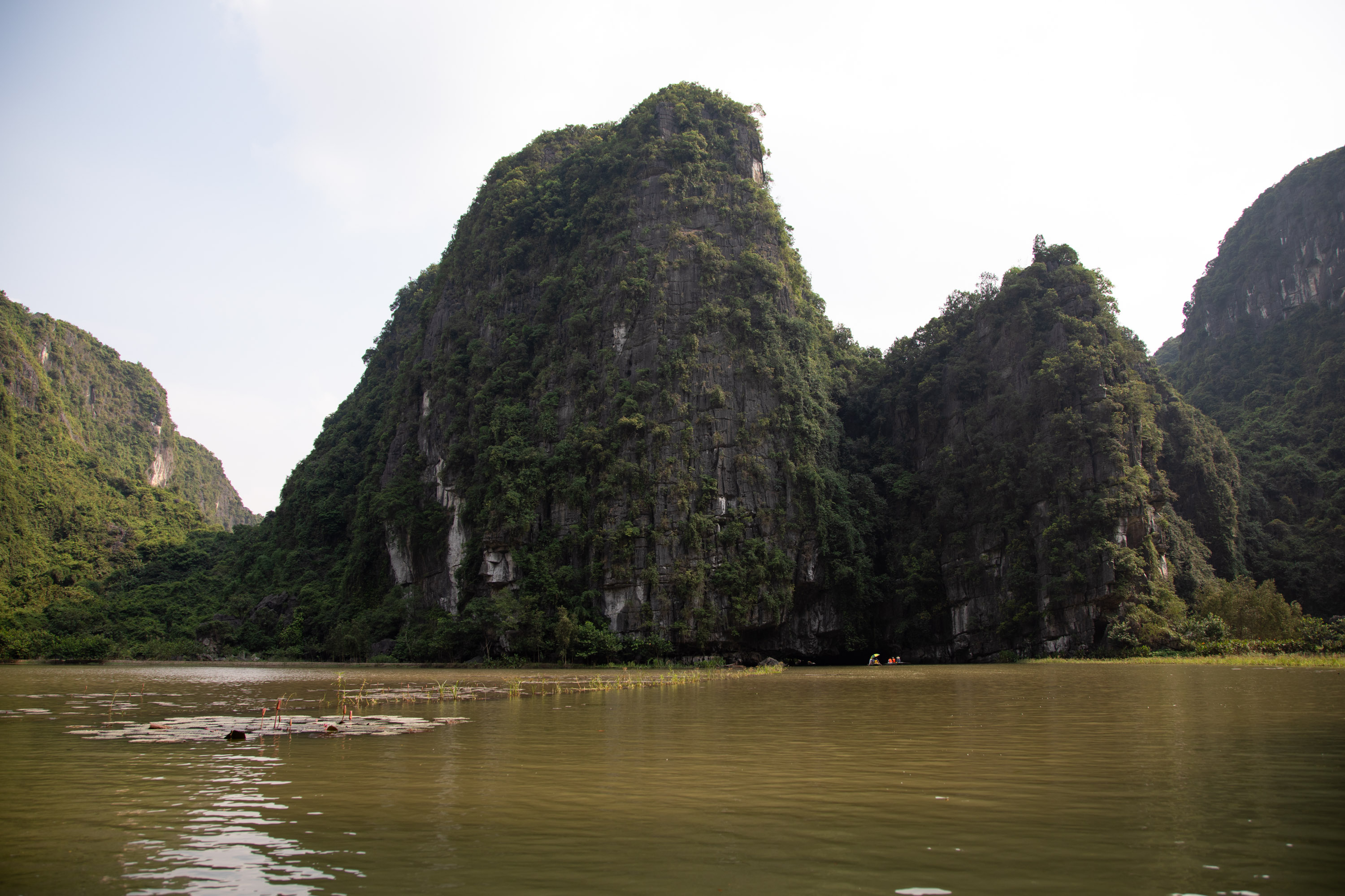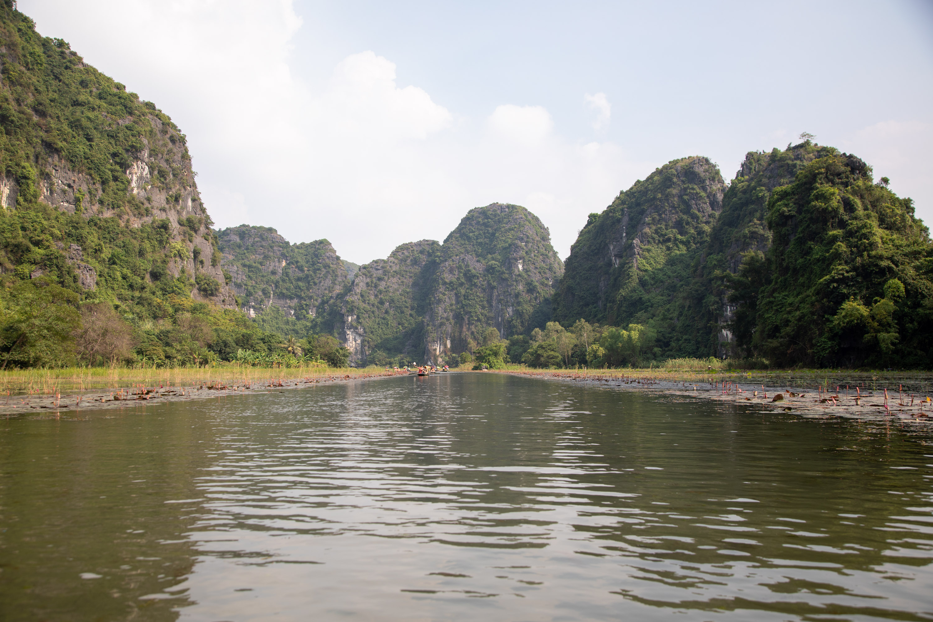 On ressort de la grotte et on arrive de nouveau dans ce paysage bucolique de la campagne vietnamienne. Il y a des lotus qui poussent sur le bord du cours d'eau, les montagnes tombent à pic, la végétation est luxuriante.