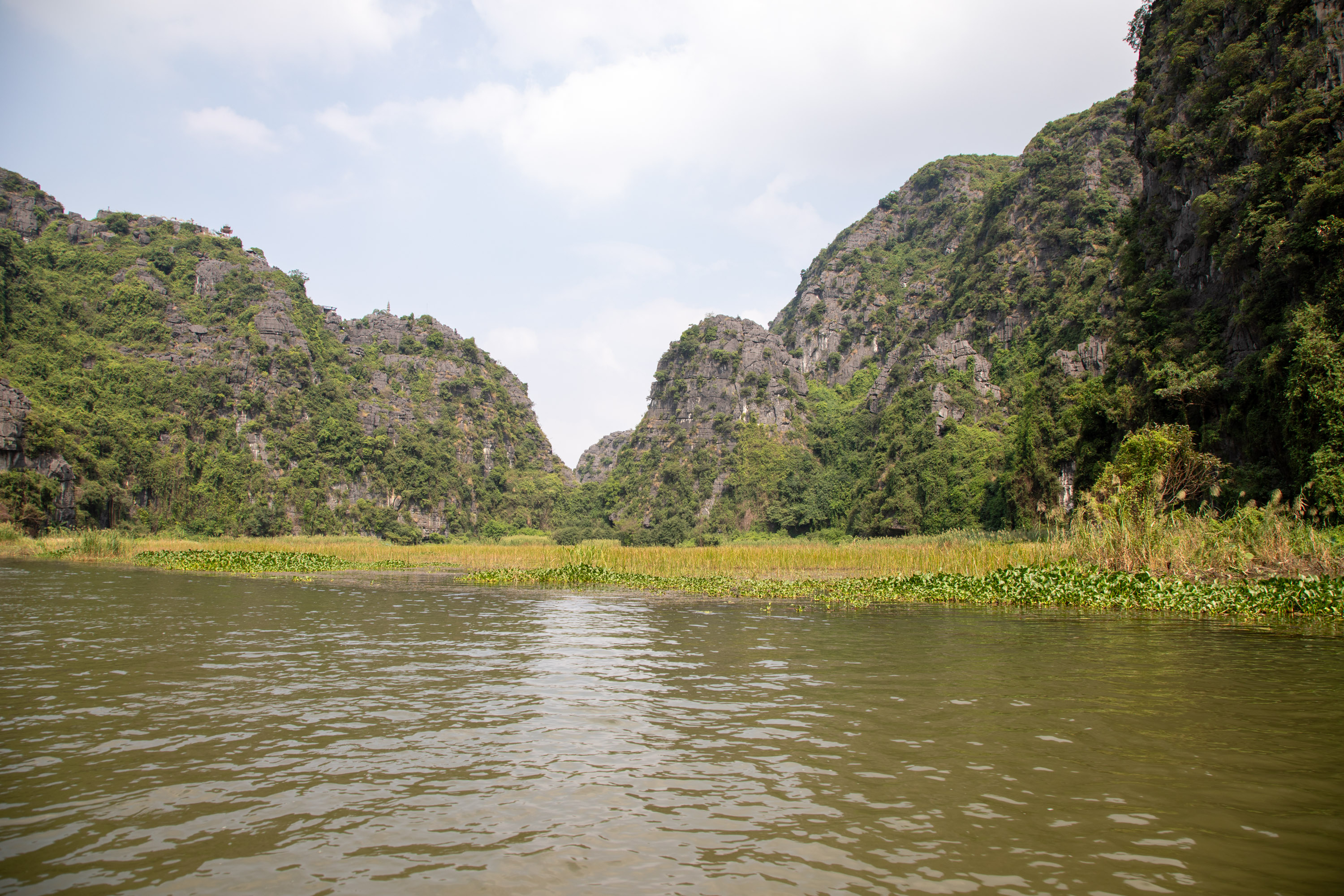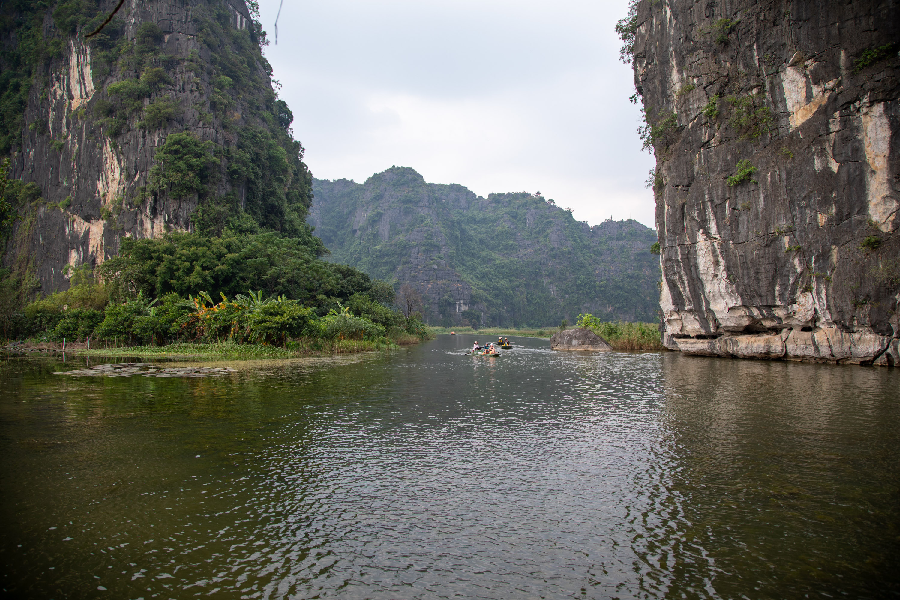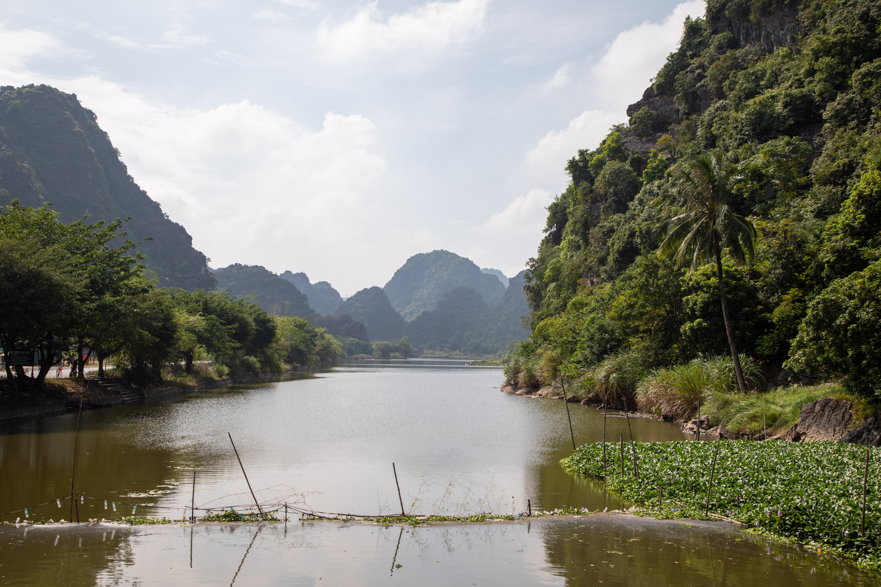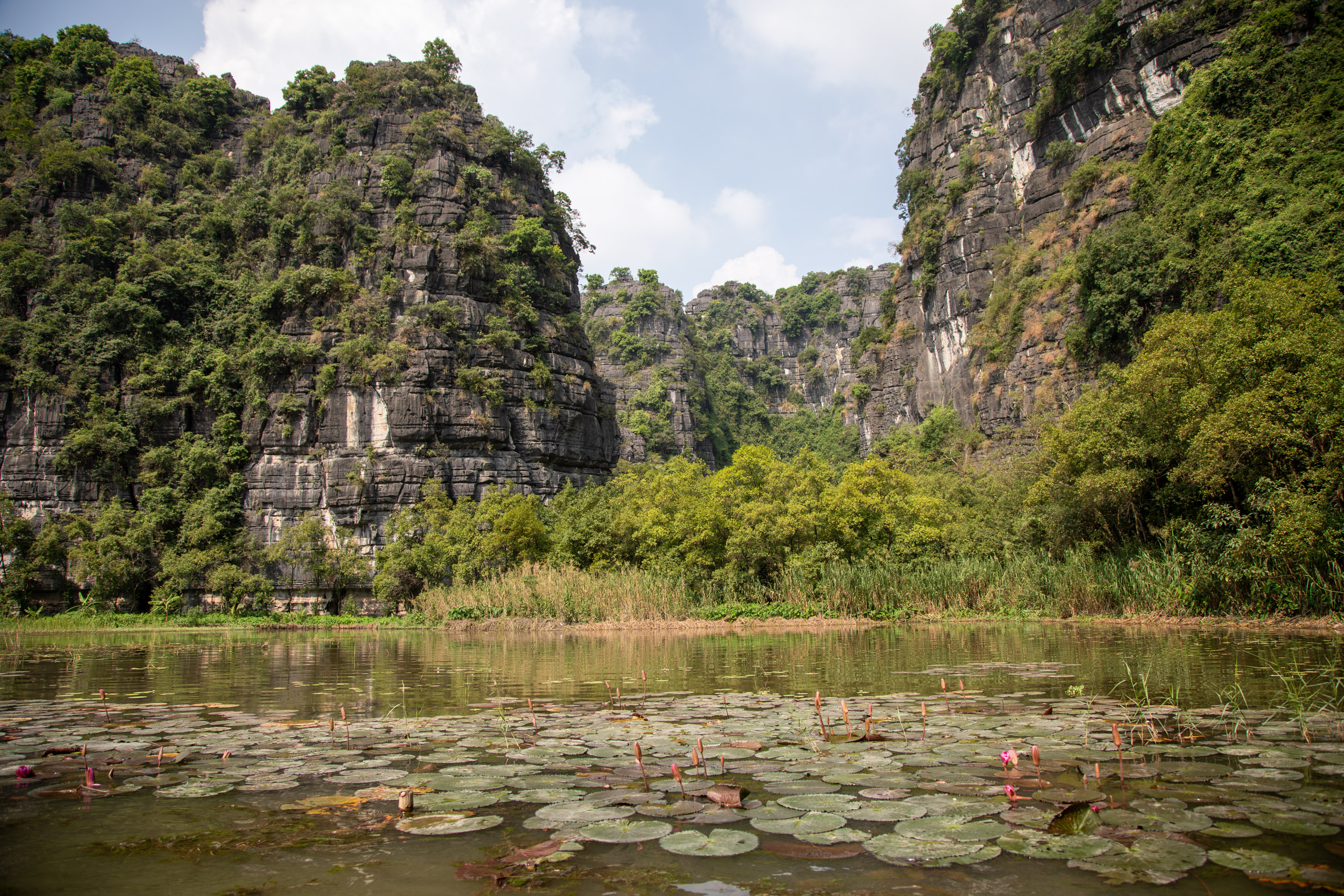 On ressort de la grotte et on arrive de nouveau dans ce paysage bucolique de la campagne vietnamienne. Il y a des lotus qui poussent sur le bord du cours d'eau, les montagnes tombent à pic, la végétation est luxuriante.