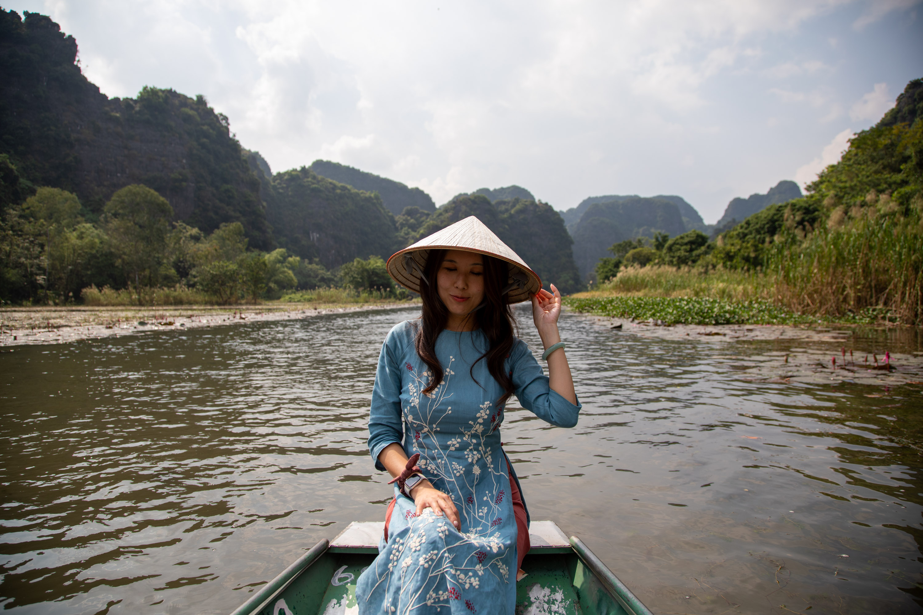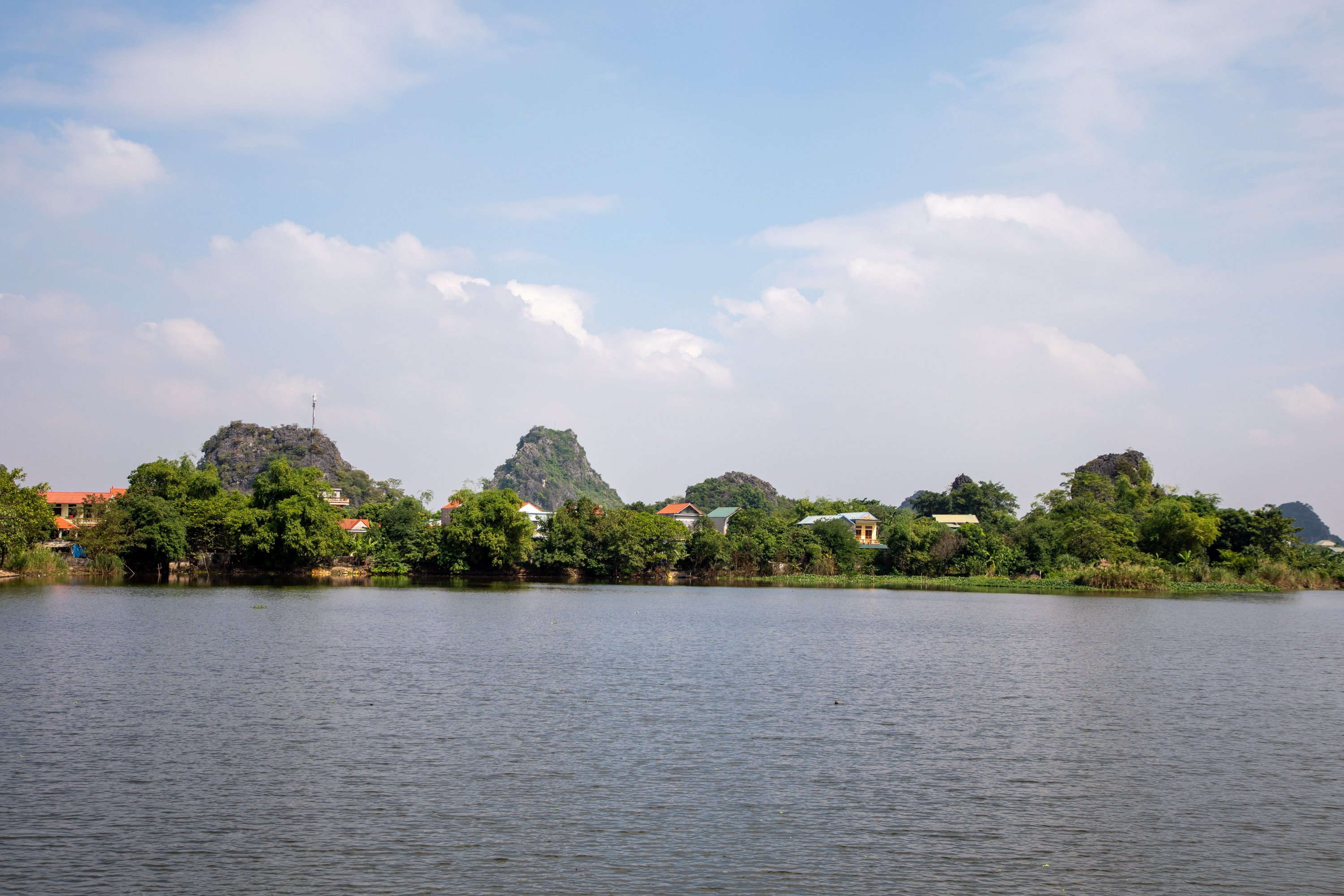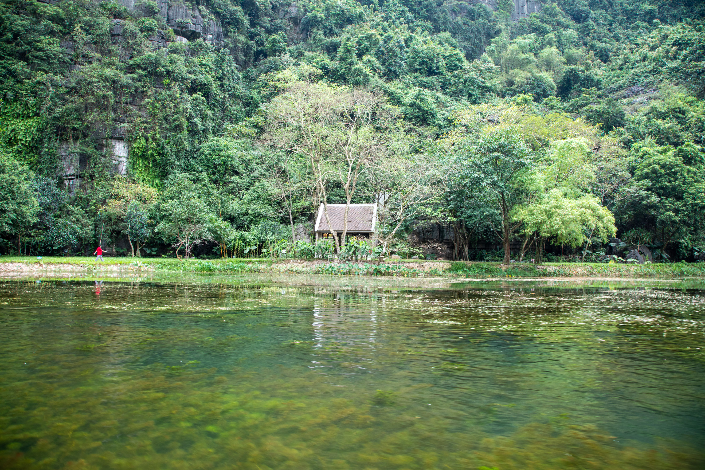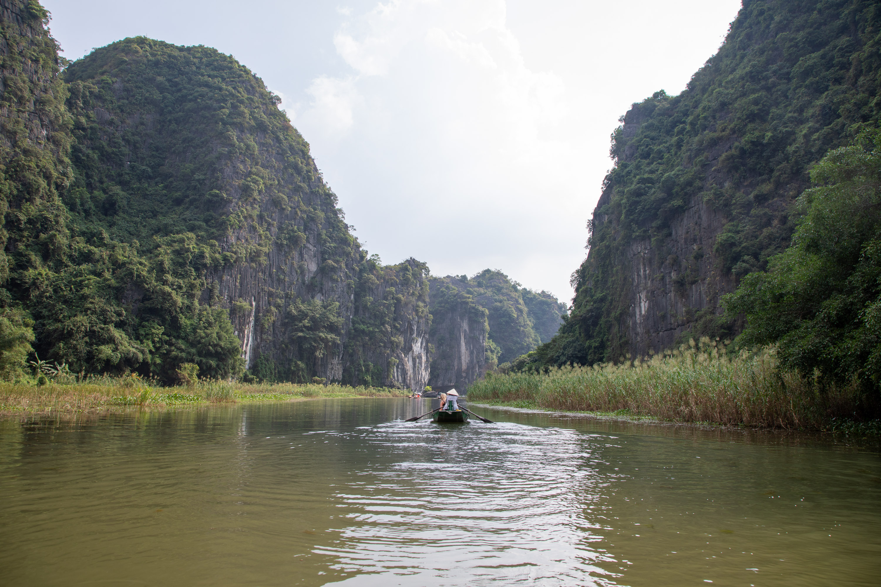 On ressort de la grotte et on arrive de nouveau dans ce paysage bucolique de la campagne vietnamienne. Il y a des lotus qui poussent sur le bord du cours d'eau, les montagnes tombent à pic, la végétation est luxuriante.