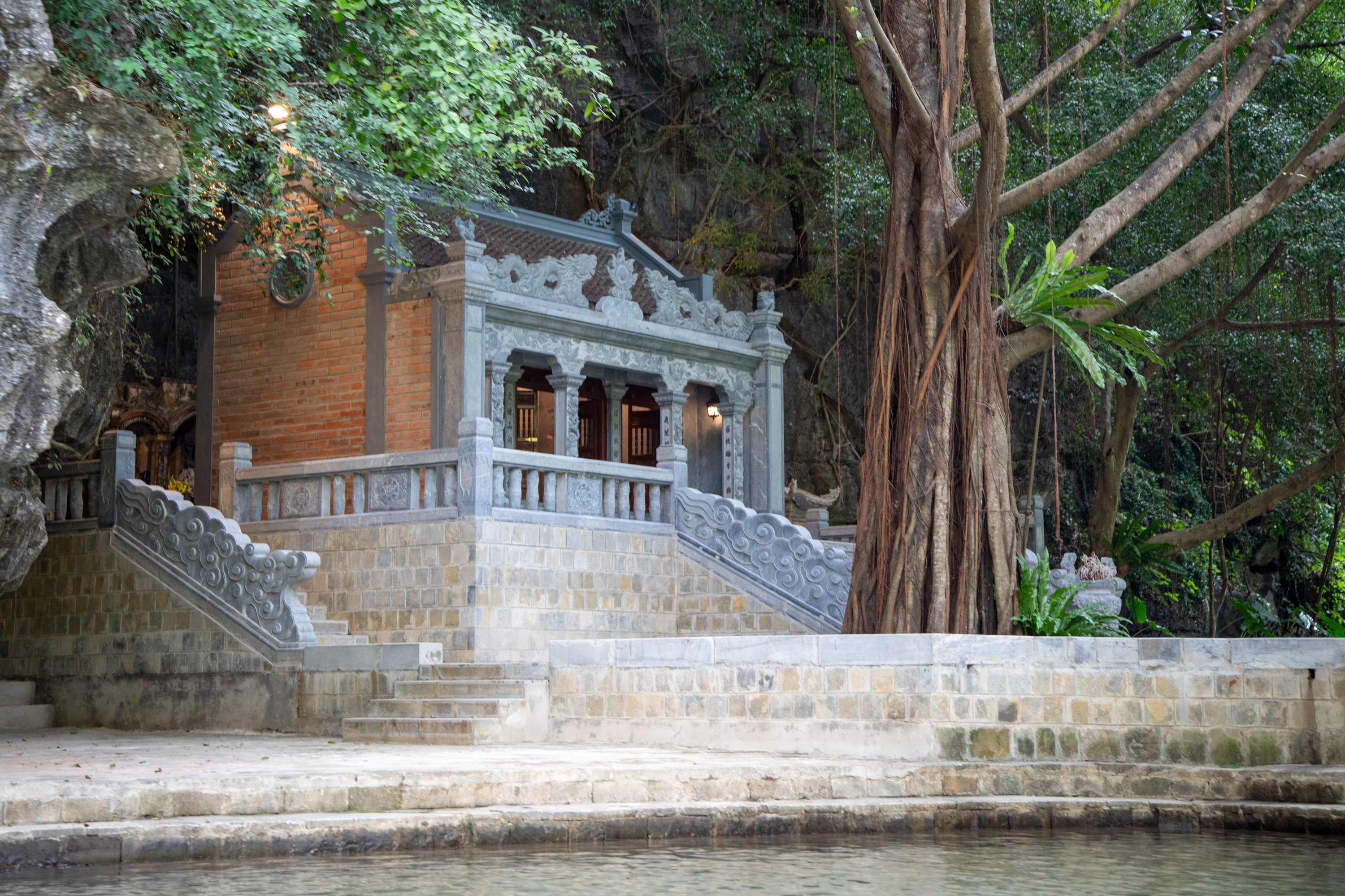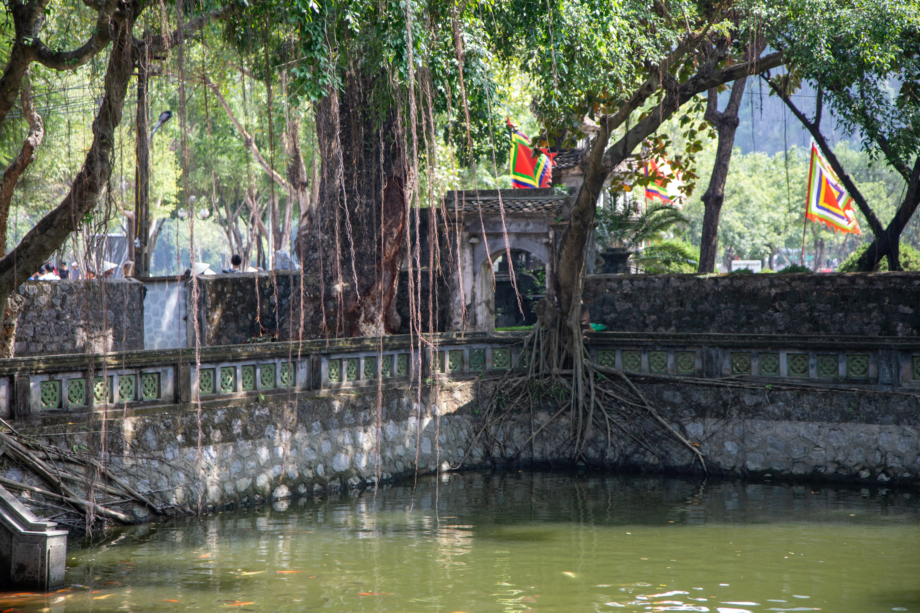 A l'entrée du temple, il y a un bassin avec des carpes et les arbres ont poussé sur les murets.