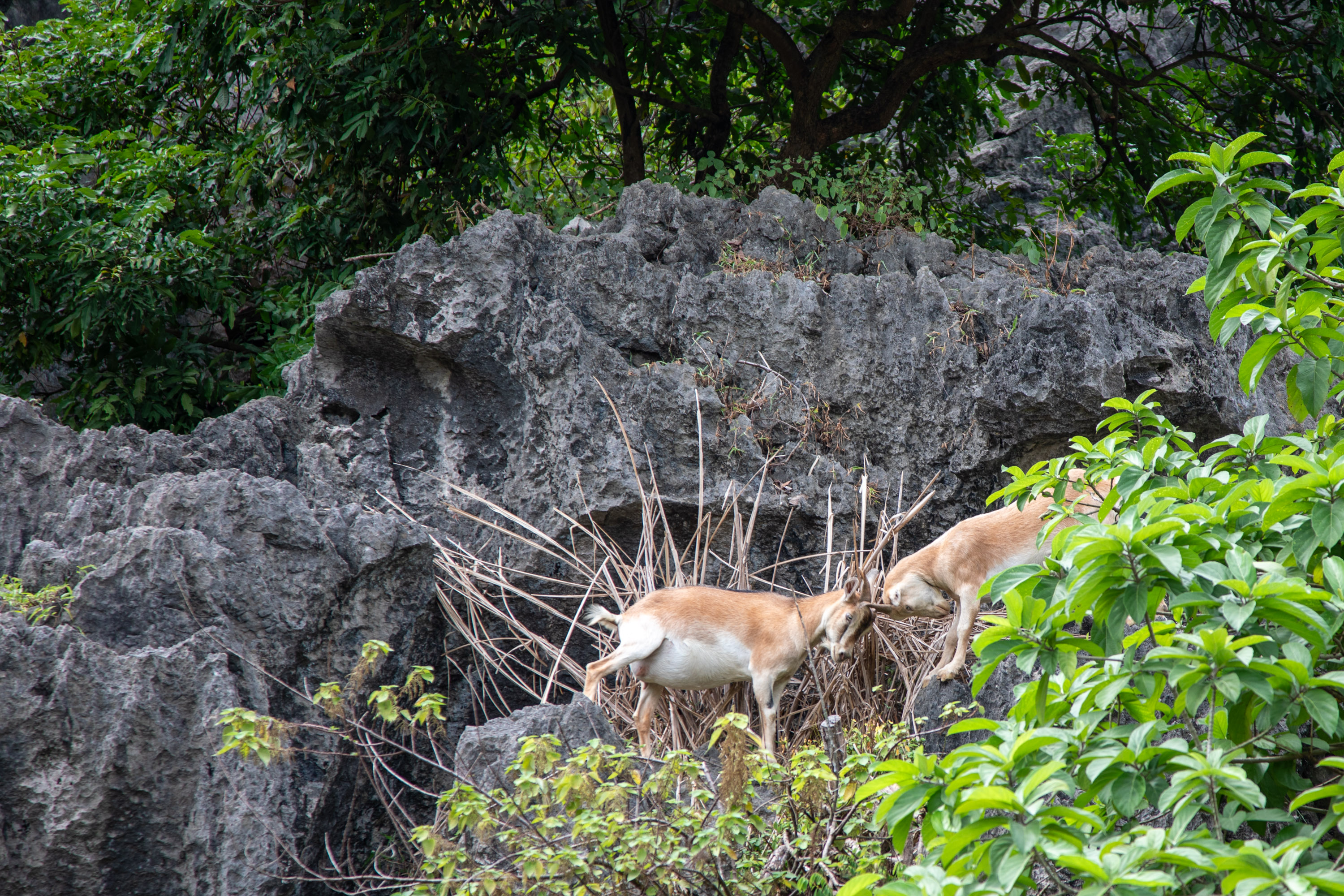 Sur le bord du chemin, on voit des chèvres qui s'affrontent.