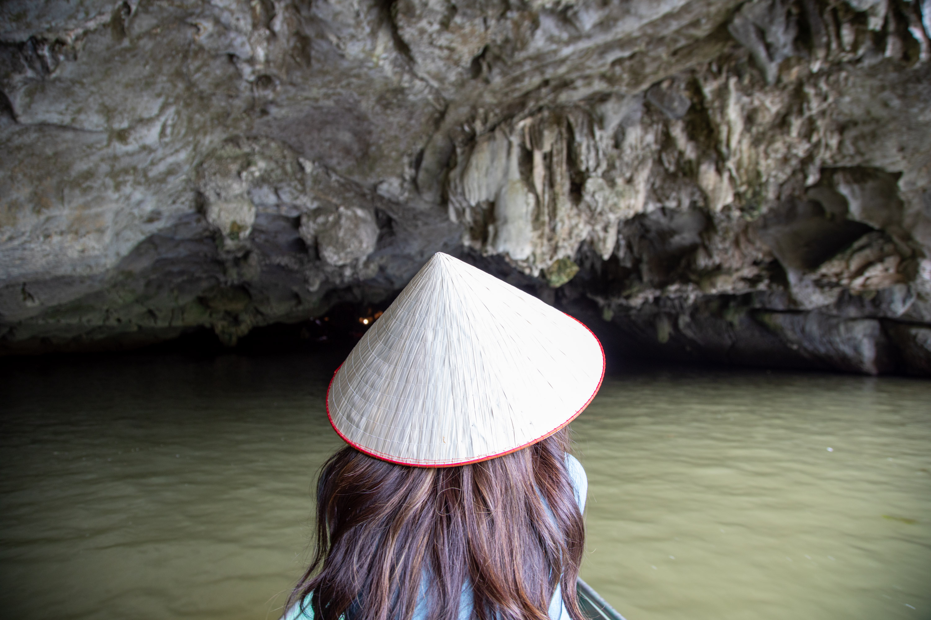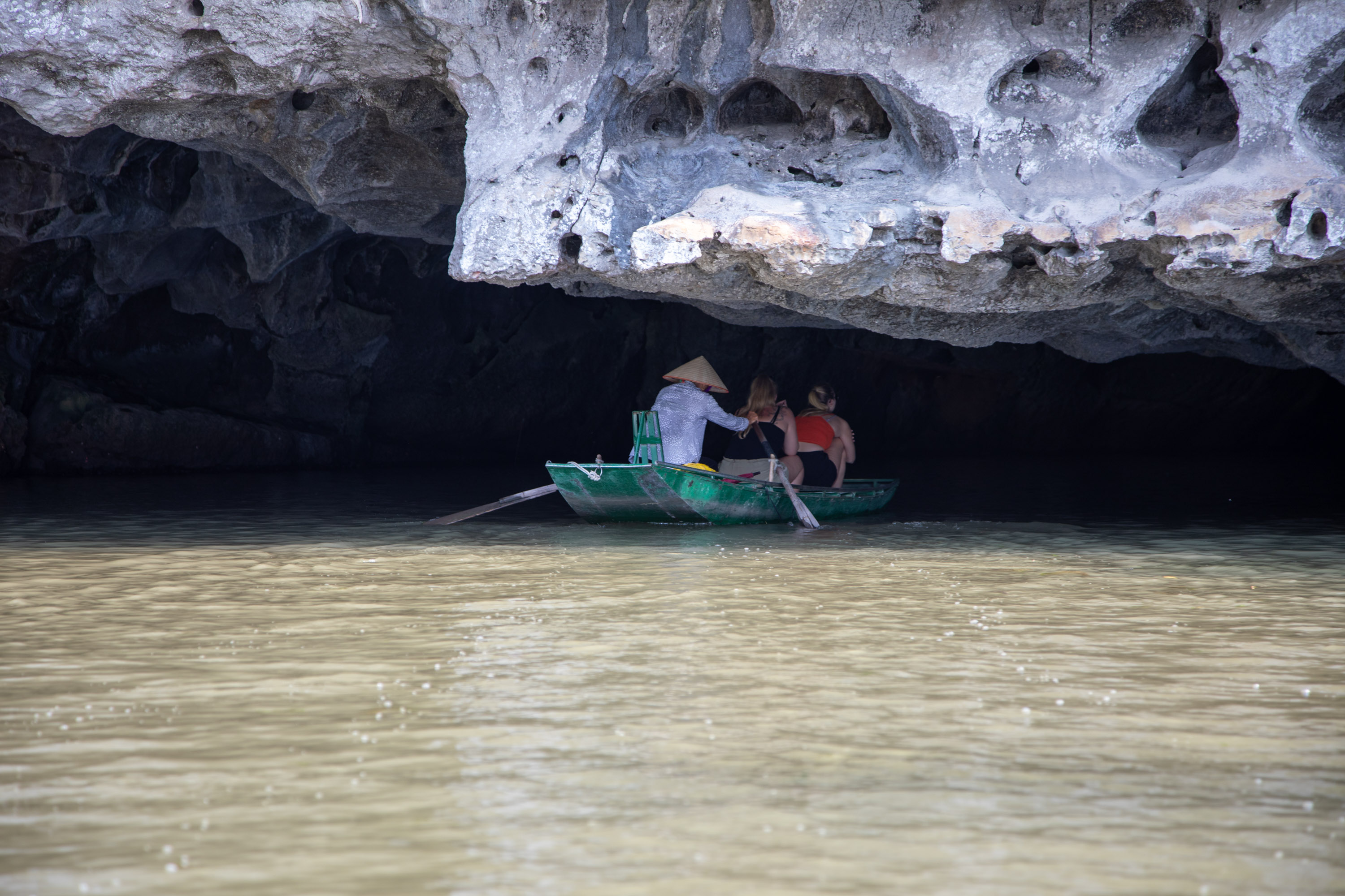 Le site ne nous a pas réellement impressionné. Il y a une signification historique bien entendu, mais ni les dimensions ni les détails ne rivalisent avec ce que l'on a pu voir par ailleurs dans nos autres voyages en Asie. Pour une journée seulement à Ninh Binh, je pense qu'il vaut mieux choisir un tour qui visite un autre endroit. Après le déjeuner, nous partons pour le moment le plus attendu de la journée, une promenade en barque sur la rivière Tam Coc. On s'installe sur une des barques conduite par une vieille femme, la caractéristique des barques est que le batelier rame avec ses pieds et non les mains. Le paysage est vraiment magnifique, avec juste le bruit de l'eau qui claque contre la barque et des rames qui plonge dans la rivière.