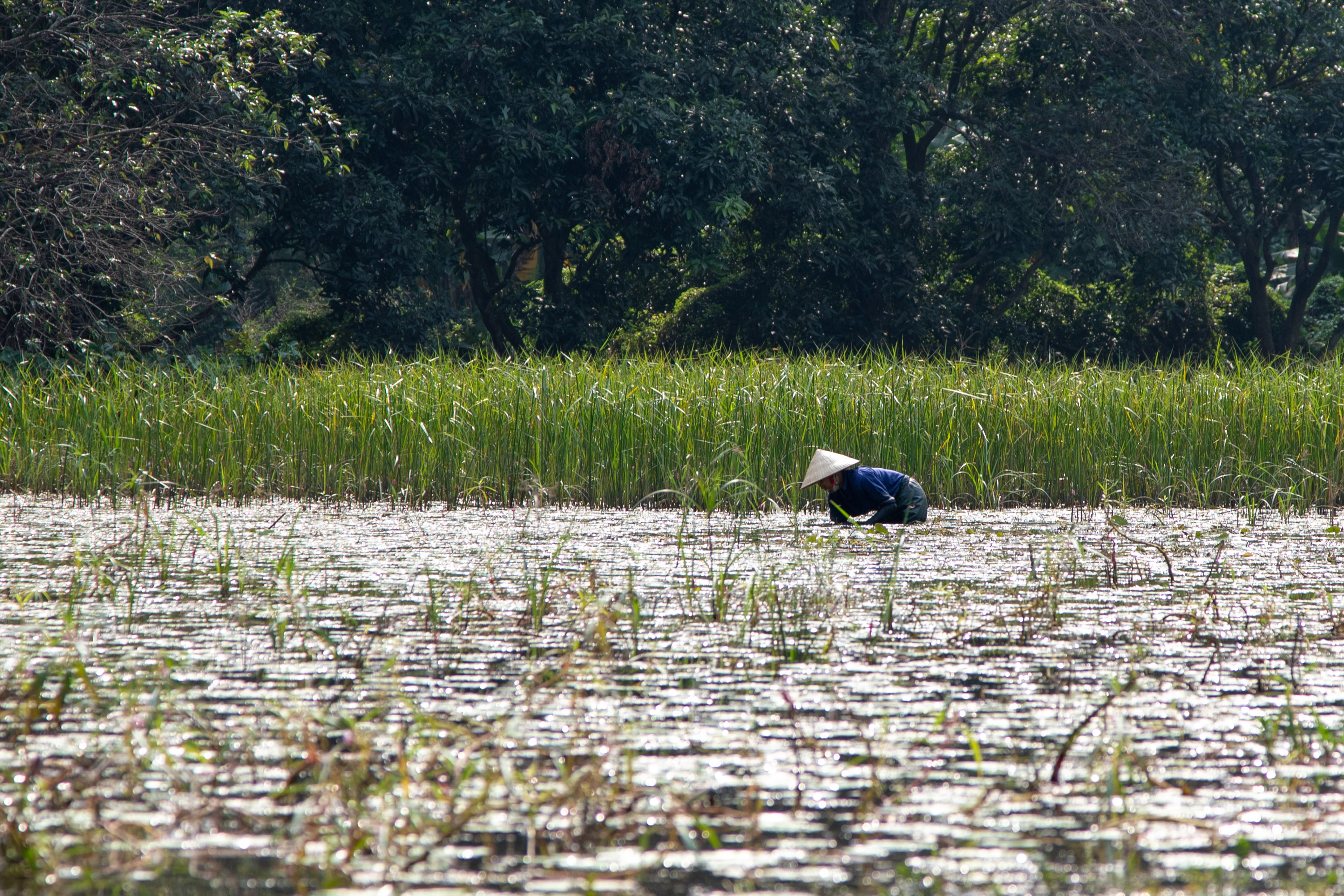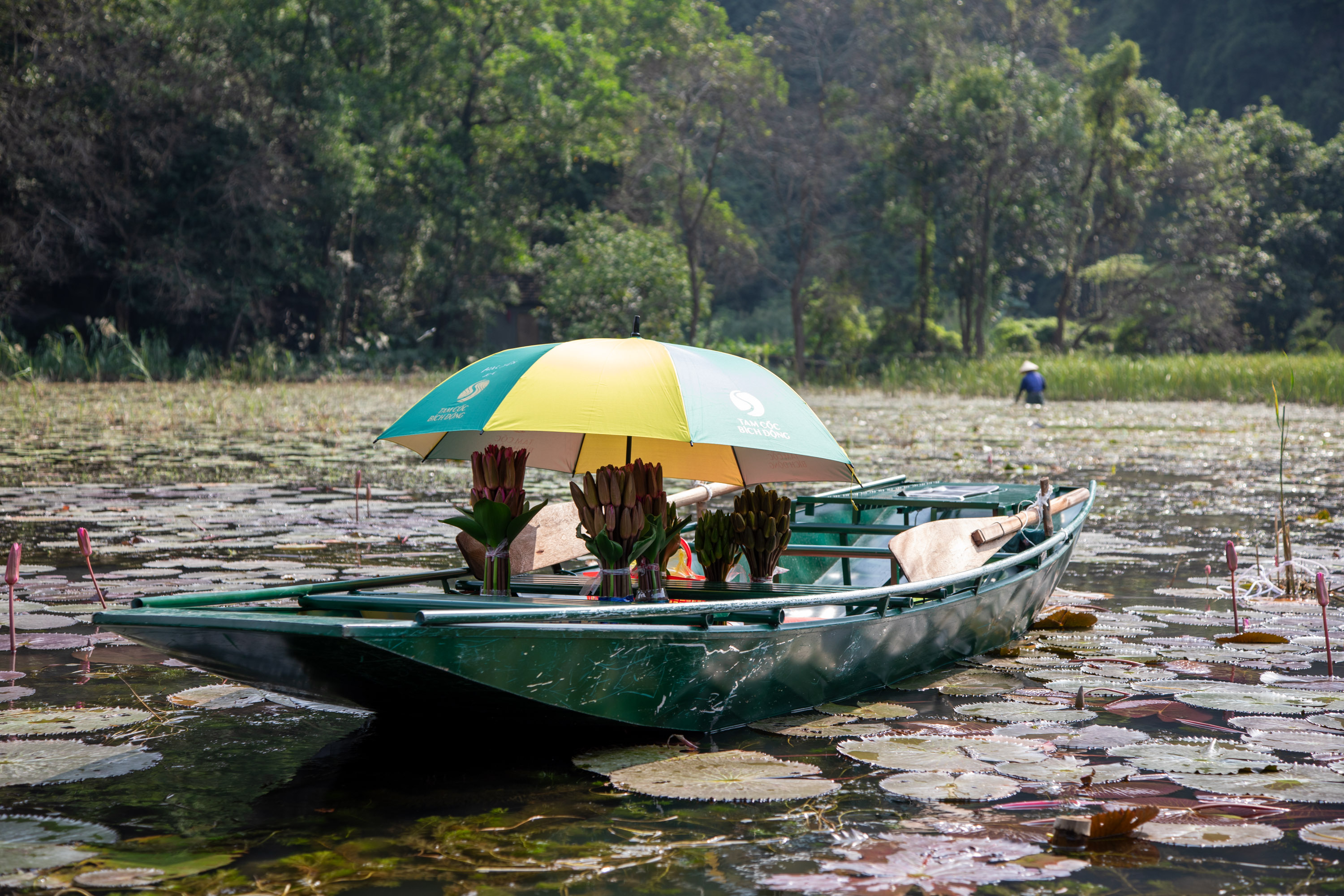 On repasse devant la personne qui était dans la rivière, on voit sa barque remplie de fleurs de lotus en bouquet.