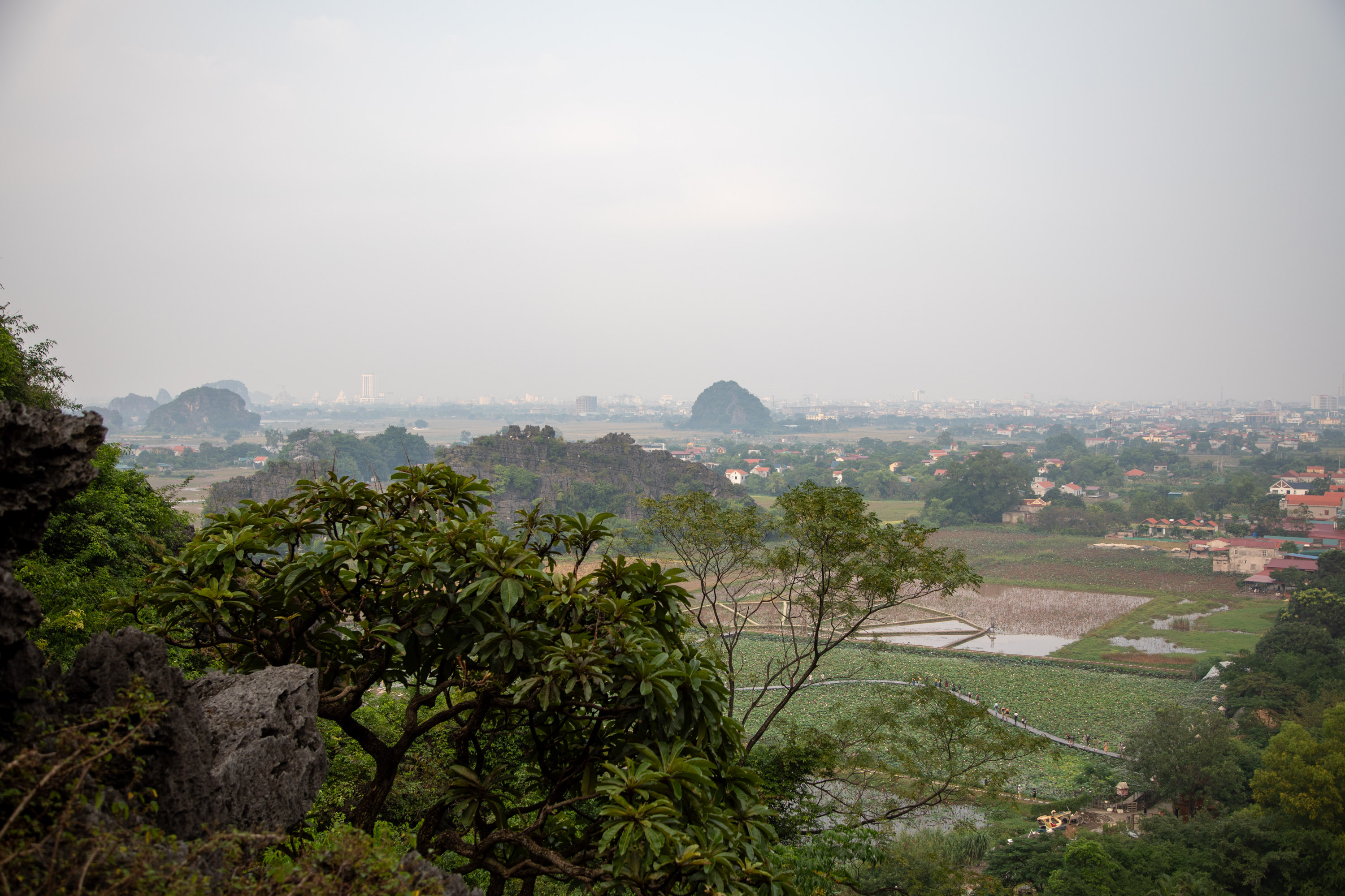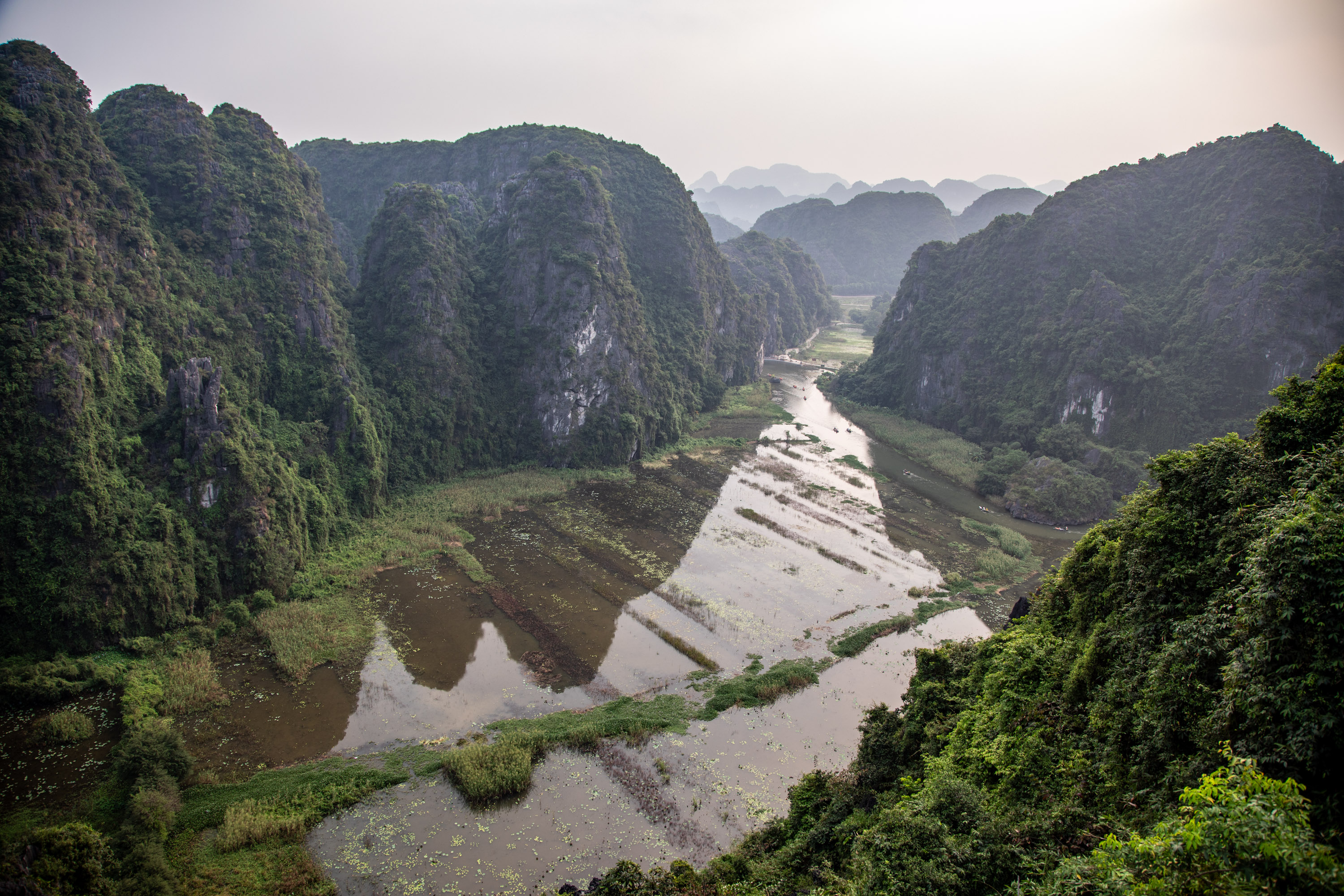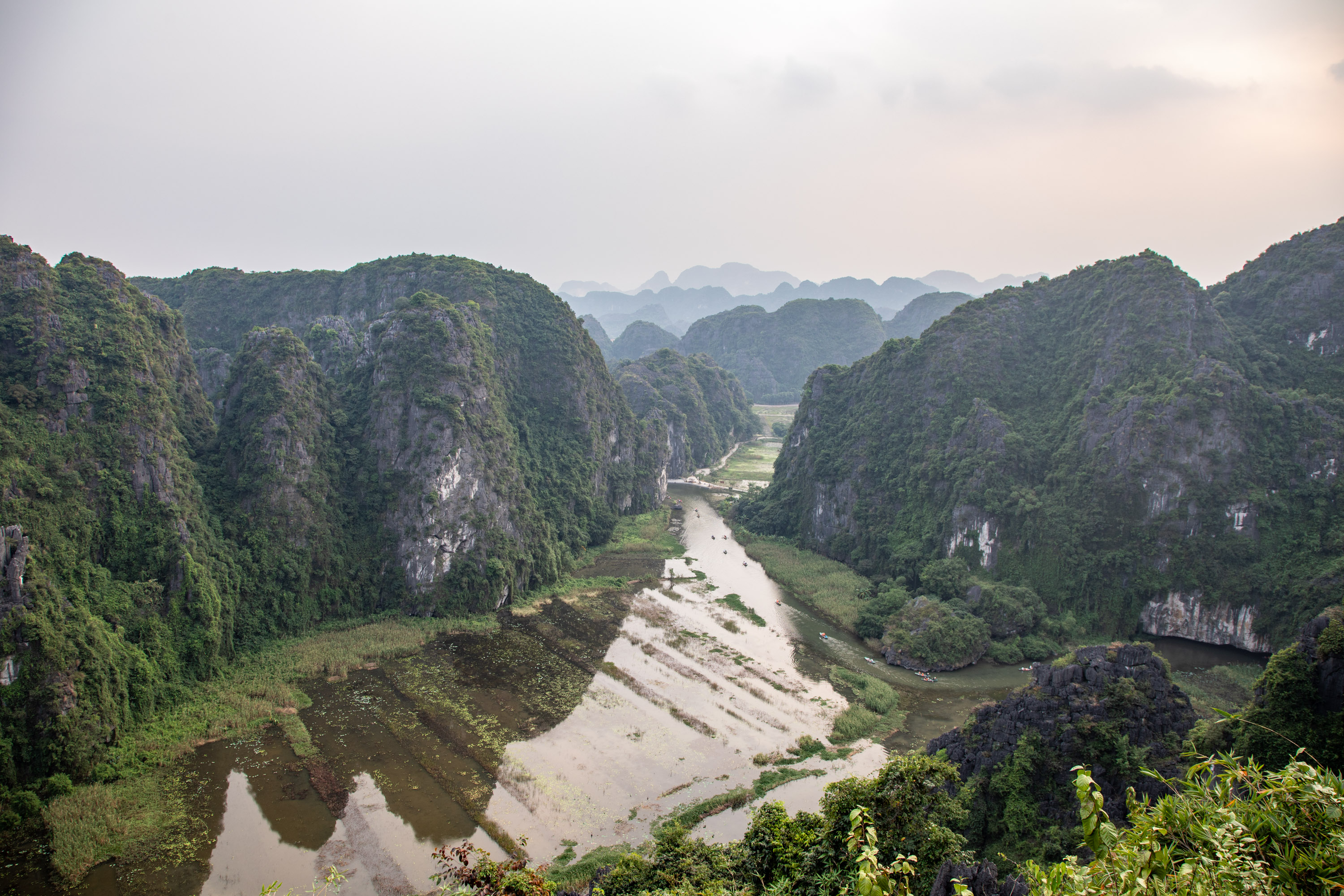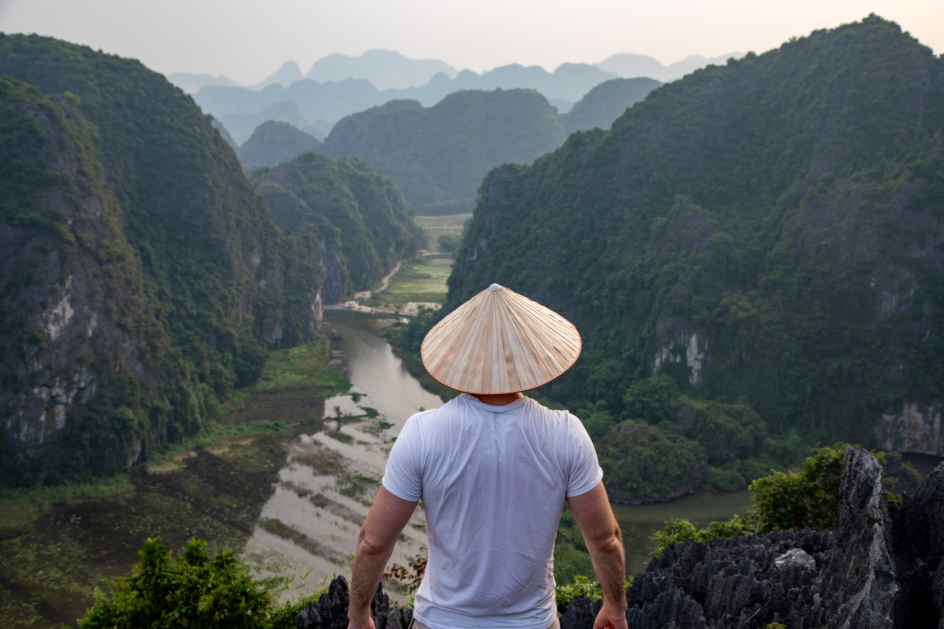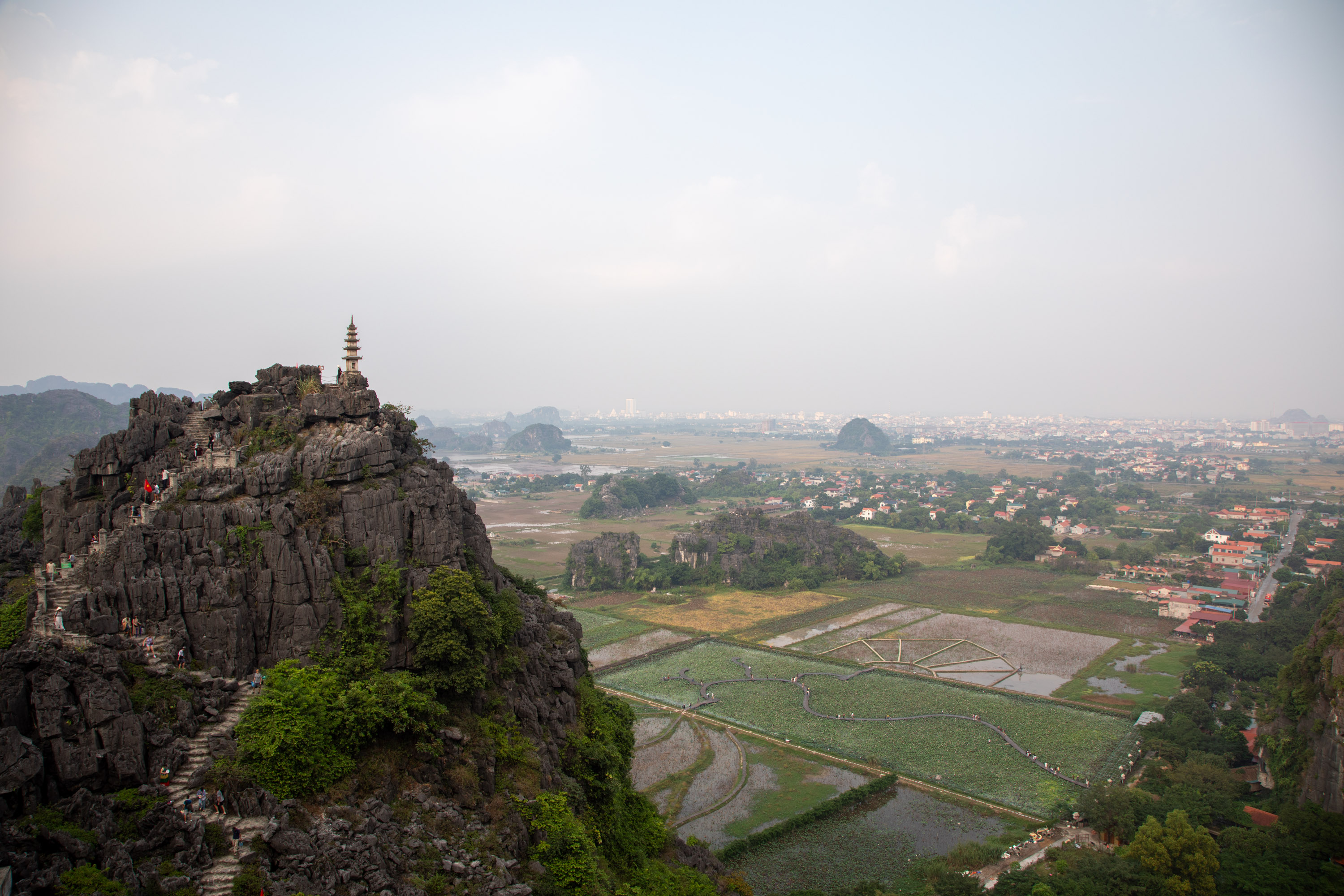 Depuis le sommet, on a une vue sur la rivière qui se fraye un passage au milieu de ce relief presque irréel, et de l'autre sur les champs de riz de la campagne vietnamienne. C'est magnifique.