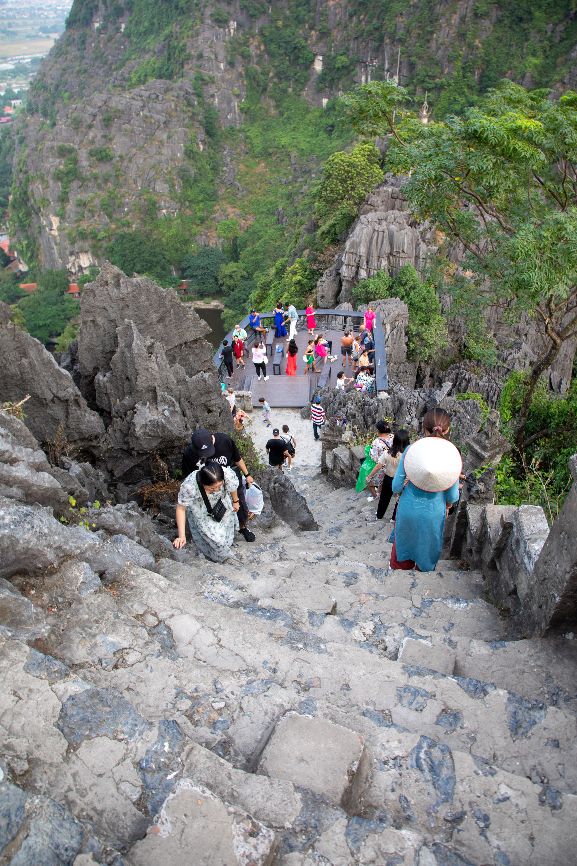 Ca fait du bien de se dégourdir les jambes, malheureusement la ballade à vélo est écourtée à cause du temps qui se met subitement à changer. Il faisait un grand beau toute la journée mais en quelques minutes le grand soleil a laissé la place à une couche de nuage bien noire menaçante. On retrouve donc le bus pour rejoindre la dernière étape de la journée. Pendant que le bus circule jusqu'à Mua Cave, il se met à pleuvoir une grosse averse tropicale avec des gouttes énormes. On attend sous un préau en espérant que la pluie va s'arrêter. En effet, malgré son nom qui évoquerait plutôt une expérience souterraine, Mua Cave est en fait une montagne que l'on peut gravir pour avoir une très belle vue sur la rivière, un des points de vue les plus beaux de la région. On ne se sent pas de monter sous la pluie, mais les autres membres du groupe sont motivés, alors on achète tous des ponchos en plastique puis on se met en route. Quelle chance, quelques minutes après avoir commencé à marcher, la pluie s'arrête déjà. On peut retirer les ponchos car on commençait à transpirer vraiment là-dessous avec la montée des marches. Il y a beaucoup de marches à gravir sous la moiteur extrême, c'est un effort intense.