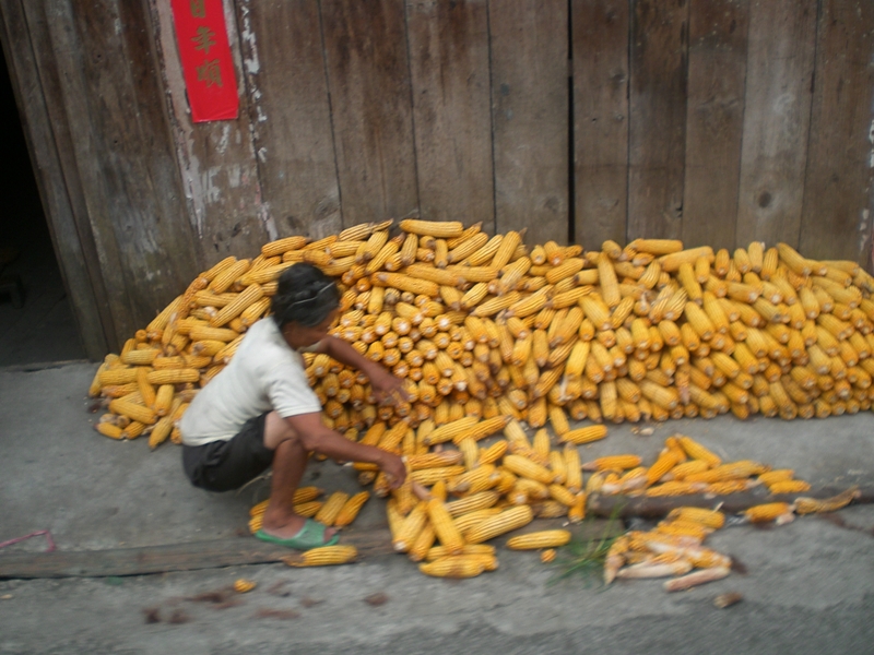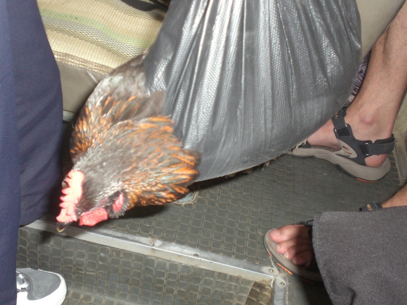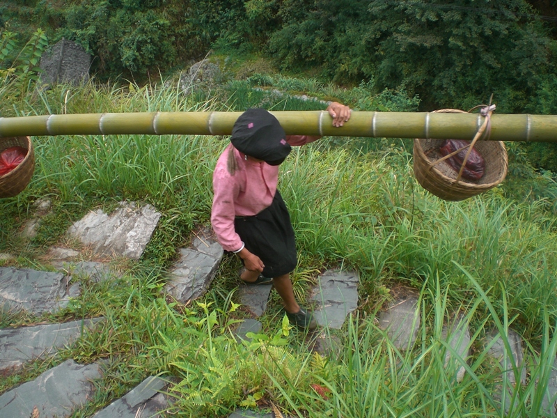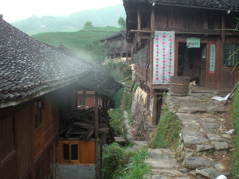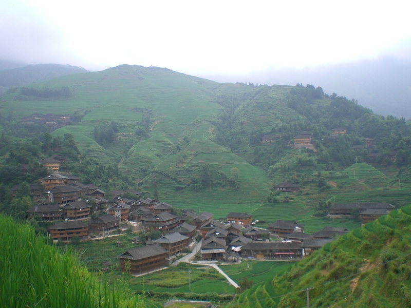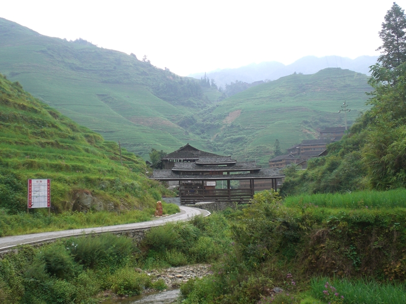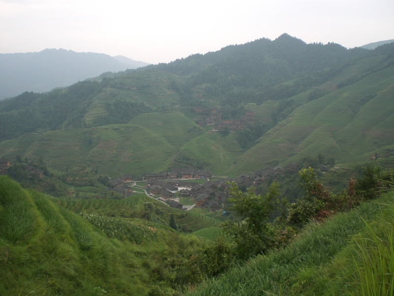 Au départ de Guilin, on prend un bus à la gare routière pour Long Sheng, une ville qui se trouve un peu au Nord des montagnes de Long Ji. Après 4 heures de bus dans la plaine puis dans des montagnes, Long Sheng s’étend des deux cotés d’une rivière. C’est une ville sale qui ne présente pas vraiment d’intérêt autre que la possibilité de prendre un mini bus pour les montagnes. A la sortie du bus, les rabatteurs accourent sur les voyageurs. Finalement, une dame propose de nous emmener dans son village, Da Zhai, qui est plus petit que Long Ji mais aussi plus typique selon elle. Finalement on se dit que l’on perd rien à la suivre et que si cela ne nous plait, on reprend le mini bus. Le voyage en mini bus sera long, une heure et demi, et on aura quelques frayeurs lorsque les roues s’approchèrent trop dangereusement du ravin. Une poule dans un sac plastique sera posé sur le sol à coté de Myriam, qui sursautera quand elle sentira que la poule était en fait vivante et gesticuler pour se dégager.