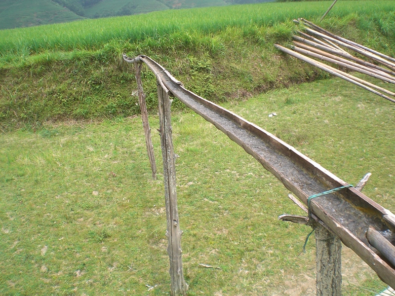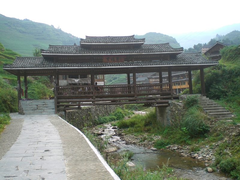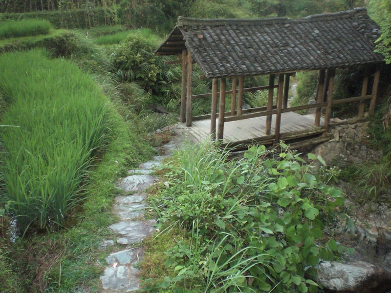 Le petit village de Da Zhai est vraiment mignon, tout de bois, les habitations et les ponts sur le ruisseau avec en arrière plan les terrasses de plantations de riz qui dessinent des courbes sur les montagnes.