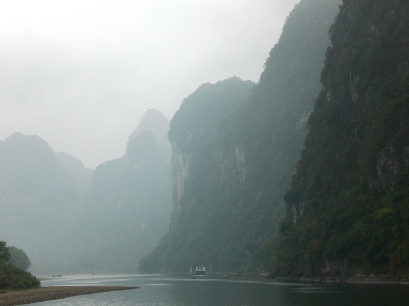 Yangshuo ne fait pas partie de ce genre de campagne balafrée, l’attrait de la région l’en protège peut être. En tout cas, explorer ces petits chemins est vraiment intéressant, surtout s’arrêter pour regarder autour de soi vaut vraiment le coup. Le relief déchiré qui se reflète dans le fleuve est unique, et pour mieux apprécier, il est vraiment conseillé de faire la croisière Guilin – Yangshuo en bateau. Les billets sont à prendre dans une agence de voyage à Guilin. Il n’est pas difficile de les trouver, il y en a partout qui propose deux classes, occidentale ou chinoise. La première dans des bateaux rapides, plus chère, permet d’être entre gens civilisés, il y a de la bière et le prix élimine les gens les plus simples. La classe chinoise dans des bateaux vétustes est bruyante, populaire, sale, bref il nous est vivement conseillé de prendre la classe occidentale. On s’est senti troublé par cette présentation des choses et nous ne manquons pas de le faire remarquer à la vendeuse, qui ajoute que la classe chinoise avec leurs parapluies ne nous permet pas de bien voir. Définitivement on prend la classe chinoise, déjà parce que sur deux billets, la différence de prix est énorme, mais en plus on n’est pas là pour rester entre occidentaux.