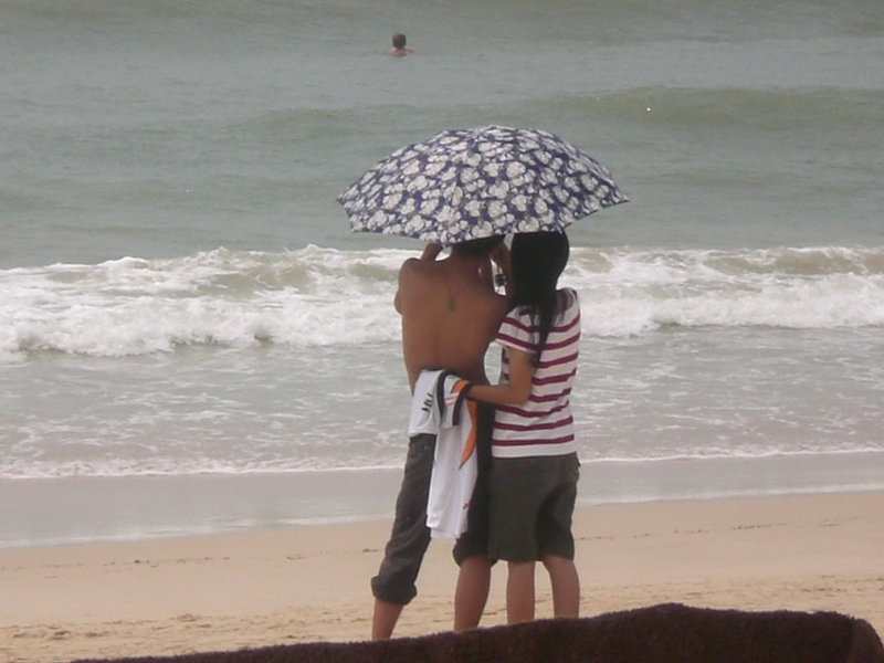 Nous partons de Hong Kong en direction de Guangzhou. Après 4 heures de route, nous avons passés les frontières et finalement arrivés à la gare, la grande gare de Canton, où l’afflux de voyageur est si continu que l’on se croirait dans un fleuve humain. Nous souhaitons prendre un train direct pour Hainan, l’île au Sud de la Chine. Il est en effet possible de prendre un train qui, arrivé face à la mer, rentre dans un grand bateau pour traverser le détroit. Malheureusement, il n’y a plus de places disponibles le jour même ni les jours suivants en classe couchettes dures. Nous ne comptons pas nous résigner et filons directement à la gare des bus que l’on connaissait déjà (à cause de l’accident de bus de l’aller qui nous avait obligé à attendre un autre bus ici pour Shenzhen). Là non plus, il n’y a plus de bus pour Hainan, que ce soit Sanya ou Haikou, la capitale de la province insulaire. Par contre la guichetière nous propose un bus partant à 22 heures pour Hai’An. Nous pensons que c’est une blague au début, mais en fait, Hai’An est le nom de la ville portuaire qui fait face à Hainan, d’où il est possible de prendre un bateau pour Haikou nous dit elle. N’ayant pas d’autre choix, nous prenons les billets et embarquons dans ce bus pour l’inconnu. Après une nuit dans le siège à essayer de dormir nous arrivons à 6 heures face à la mer, le bateau pour Haikou partant devant nos yeux. Dommage, le suivant ne part qu’à 8 heures. Cela nous permettra de finir notre nuit dans le hall et de petit déjeuner. Dans le bateau, la climatisation a été réglée sur congélation et le son du téléviseur qui passe un karaoké sur volume maximum. Impossible de dormir… Nous faisons la connaissance d’un Chinois qui rentre chez lui à Haikou, nous sympathisons et à la sortie du bateau demande à un taxi de nous amener à la gare des bus pour Sanya, car il y a plusieurs gare de bus à Haikou. Haikou est un vaste chantier, comme les autres capitales de provinces chinoises. Zone Economique Spéciale, elle bénéficie d’un régime fiscal favorable aux investisseurs étrangers. Ce chauffeur nous propose alors de nous amener directement à Sanya par une voiture privée, à un prix intéressant. Fatigués, nous acceptons. Il nous dépose alors devant un groupe de jeunes qui ont une voiture, une femme attend avec eux, ils ont l’air louches mais bon, en Chine les apparences sont trop souvent trompeuses et les repères occidentaux inutiles. Au moment d’embarquer, je crois que la fatigue me joue des tours lorsque je vois des policiers se cacher derrières les buissons dans le dos de nos chauffeurs. Personne d’autre remarque, je me dis donc qu’une petite sieste me ferait le plus grand bien. La voiture démarre, mais pas le temps de rouler qu’un policier, bien réel, se jette sur le véhicule et vocifère au conducteur de sortir. Celui-ci a juste eu le temps de fermer les portes à clé. Mais il finit par ouvrir et nous par ressortir, après s’être pris une grosse baffe de la part du policier, il est sommé de partir, ce qu’il fait sans discuter. Nous nous retrouvons sans chauffeur. Ils nous disent qu’il va revenir, qu’il faut attendre un peu, la police va partir… Bref trop fatigué, un taxi arrive, on l’appelle et lui demande de nous amener à la gare des bus. Encore une fois manque de chance, il nous amène à la mauvaise. Ah oui, c’est vrai, le Chinois dans le bateau disait qu’il y en avait plusieurs. Bon finalement on reprend un taxi pour arriver à la bonne gare d’où le bus de… midi quand même, s’apprete à partir. Les billets payés on embarque pour 3 heures. Le temps de parcourir l’île du Nord au Sud et de découvrir des paysages fantastiques. Champs de riz, cocotiers, bananiers, la mer, des plages immaculées… Ce long voyage en valait la peine. Nous resterons même plus longtemps que prévu à Sanya, pensant même annuler notre étape Pékin afin de profiter plus longuement du soleil de l’île. Après avoir expérimenter les baies de Da Dong Hai et de Ya Long Hai, notre choix se portera finalement sur la première, plus accessible. Il y a des vendeurs de fruits frais en face de la plage, ce qui est un régal du matin au soir (surtout quand ils mixent les fruits pour en faire des sorbets).
