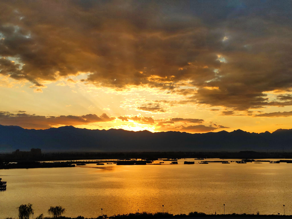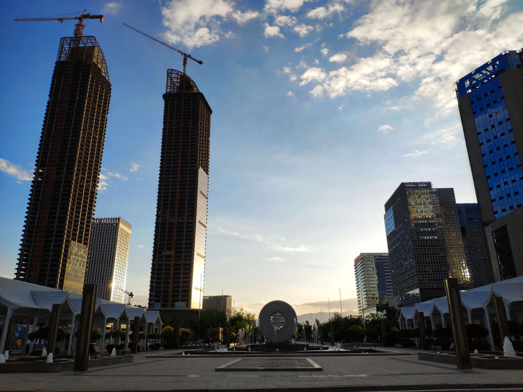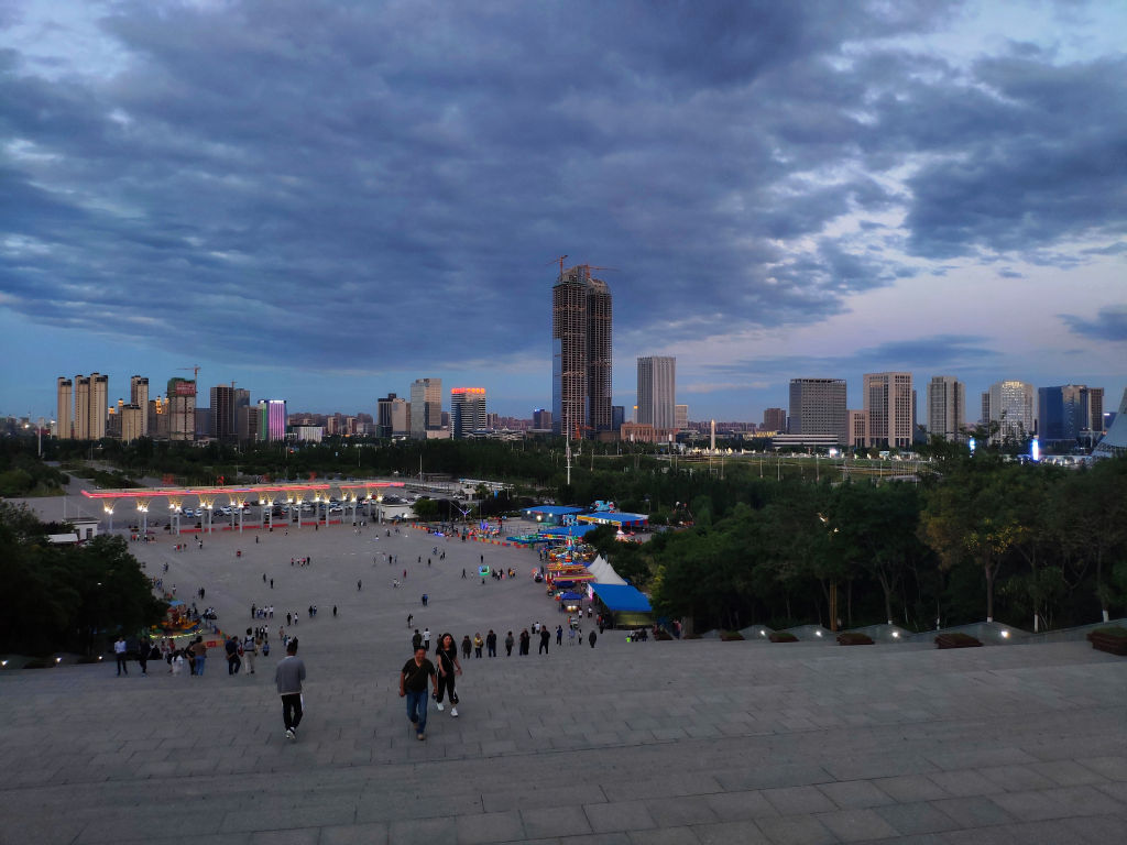 La nuit tombe tard à Yinchuan par rapport à Hangzhou qui se trouve à 2000 kilomètres à l’Est. Ce qui nous donne l’occasion de rentrer tranquillement en ville et de visiter le quartier d’affaire de Yinchuan et regarder le soleil se coucher depuis une esplanade qui est parfaitement orientée plein Ouest.