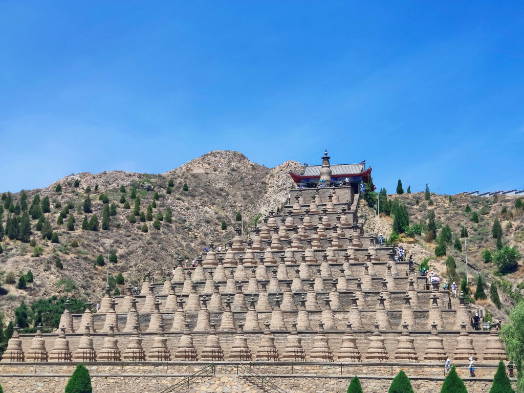 Nous ferons une pause Nous ferons une pause face au site des 108 stupas, édifié dans la roche aride des montagnes qui bordent le fleuve jaune. C’est seulement sur les rives que la végétation arrive à survivre à ce climat extrême.