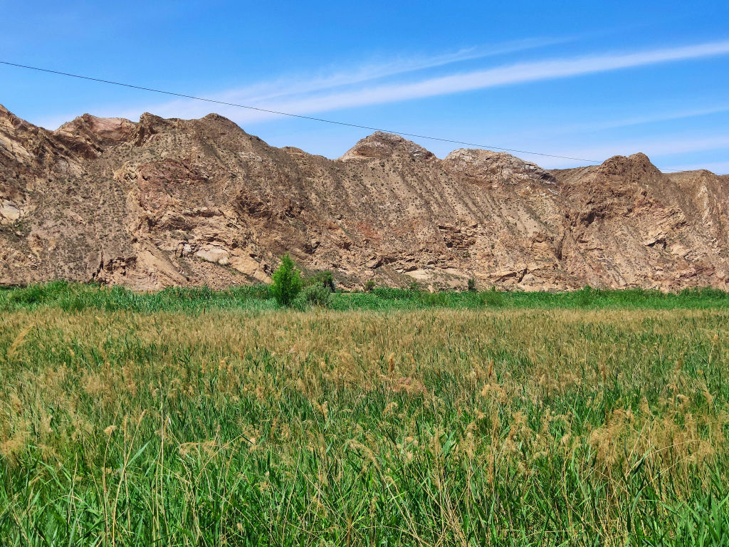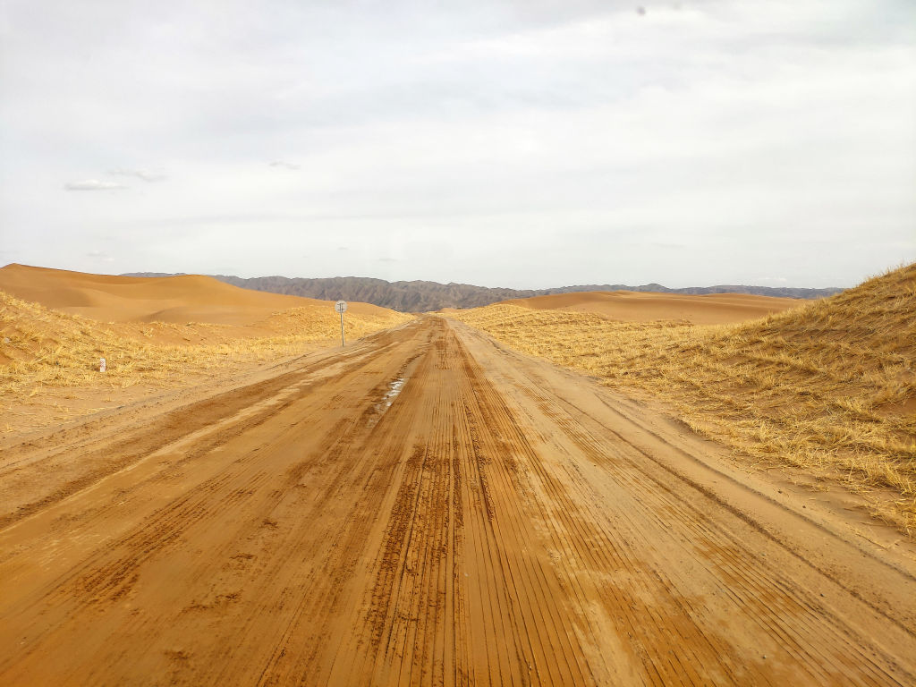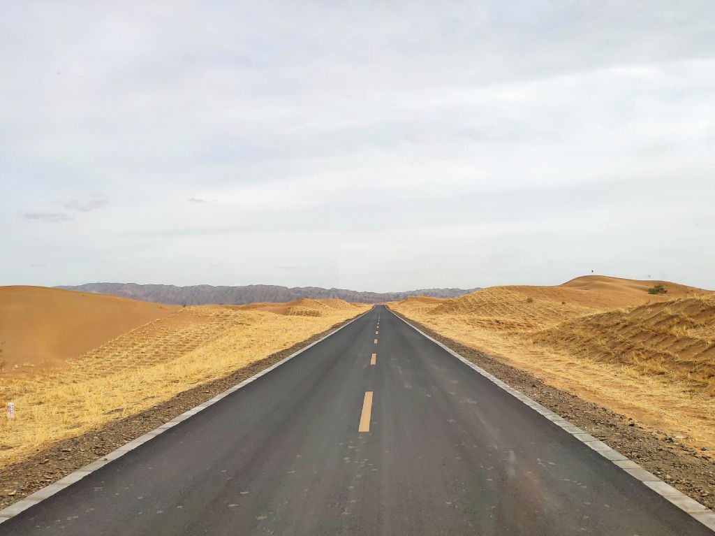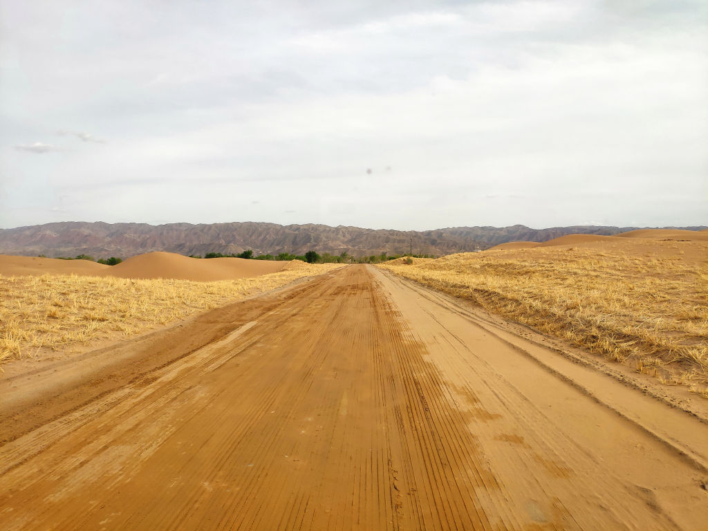 Après avoir profité de notre petit bout de désert, on reprend la navette pour rejoindre la zone ou le désert de sable rencontre le Fleuve Jaune. Pour cela, on roule sur une belle route dans les dunes.