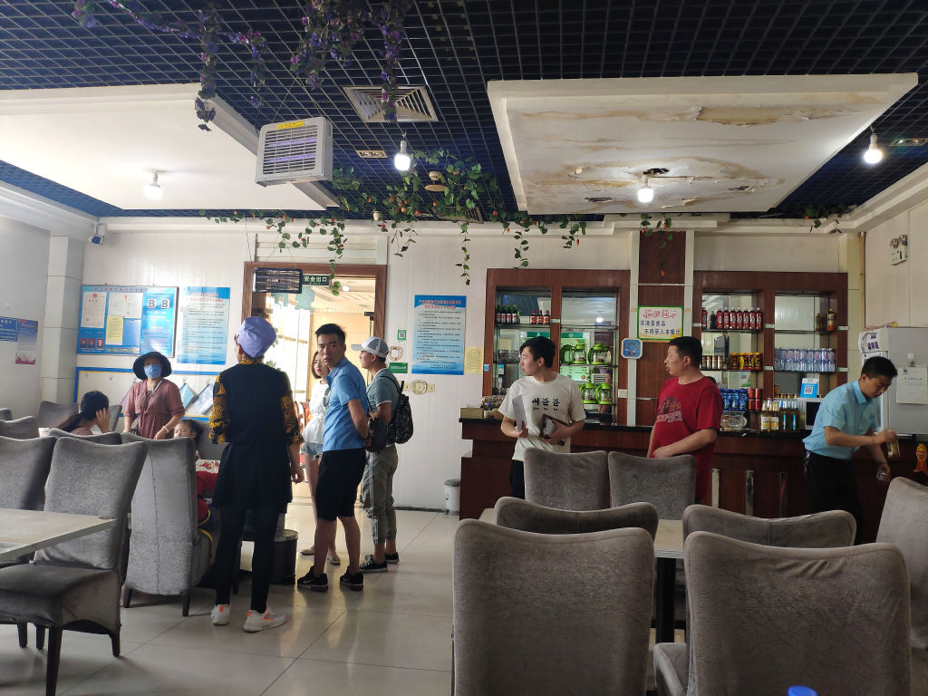 En milieu d’après-midi, nous reprenons la route pour Zhongwei. On enfile un repas sur une aire d’autoroute, composé d’un grand plat de poulet et pommes de terre dans un restaurant à la décoration dépassée.