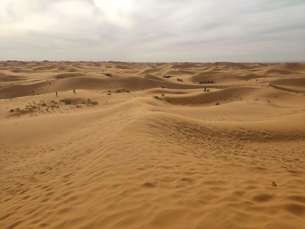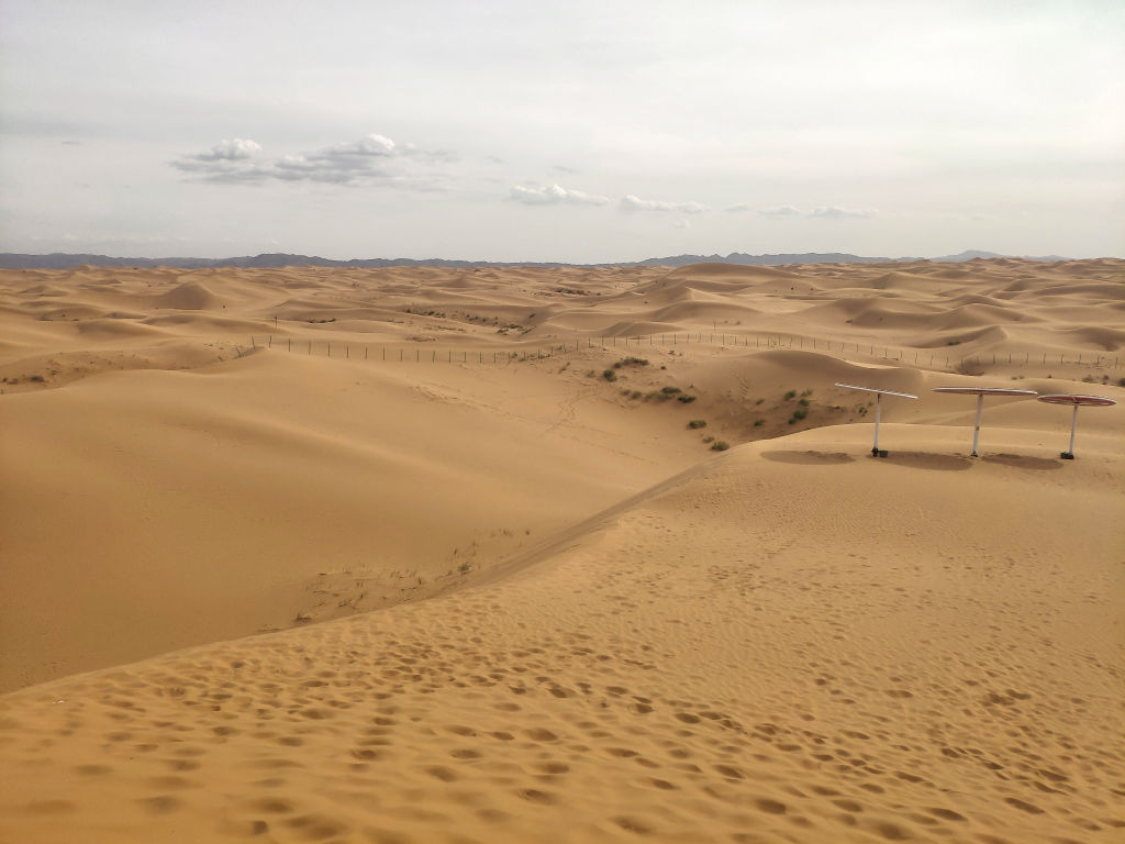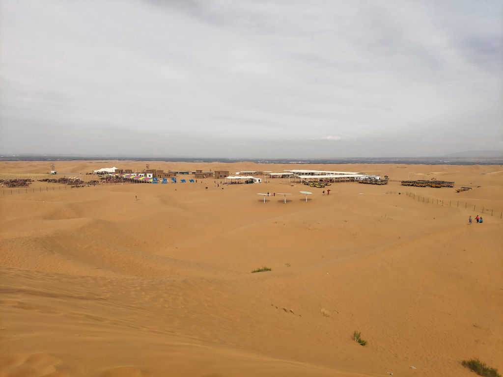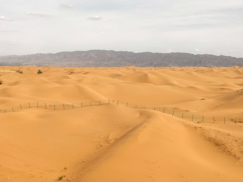 Pas vraiment ce que l’on imagine de la route de la soie et la solitude du désert. Le site est en soi vraiment grandiose avec de grandes dunes jusqu’à l’horizon, un sable fin jaune. Le pire c’est que la navette a roulé un bon moment avant d’arriver à cette zone touristique planté au milieu des dunes, on aurait pu s’arrêter ou on veut et faire un petit tour mais non. En même temps, en toute honnêteté, on imaginait bien que cela ressemblerait à un parc d’attraction dans le désert. J’en rajoute une dernière, le site est fermé par un grillage pour éviter que les touristes ne s’aventurent seuls dans les dunes ! On essaye de voir le positif et on profite quand même de ce petit carré de bac à sable propre et sécurisé pour en faire le tour, on a une belle vue vers le vaste désert de Tengger, le quatrième plus grand désert de Chine.