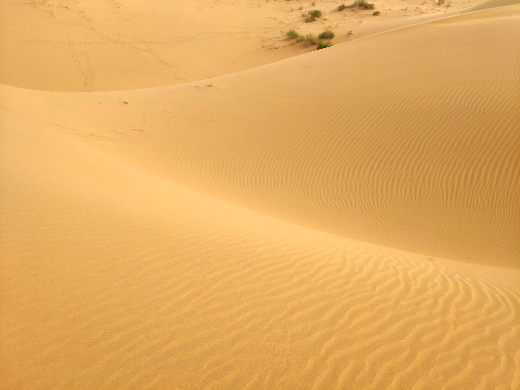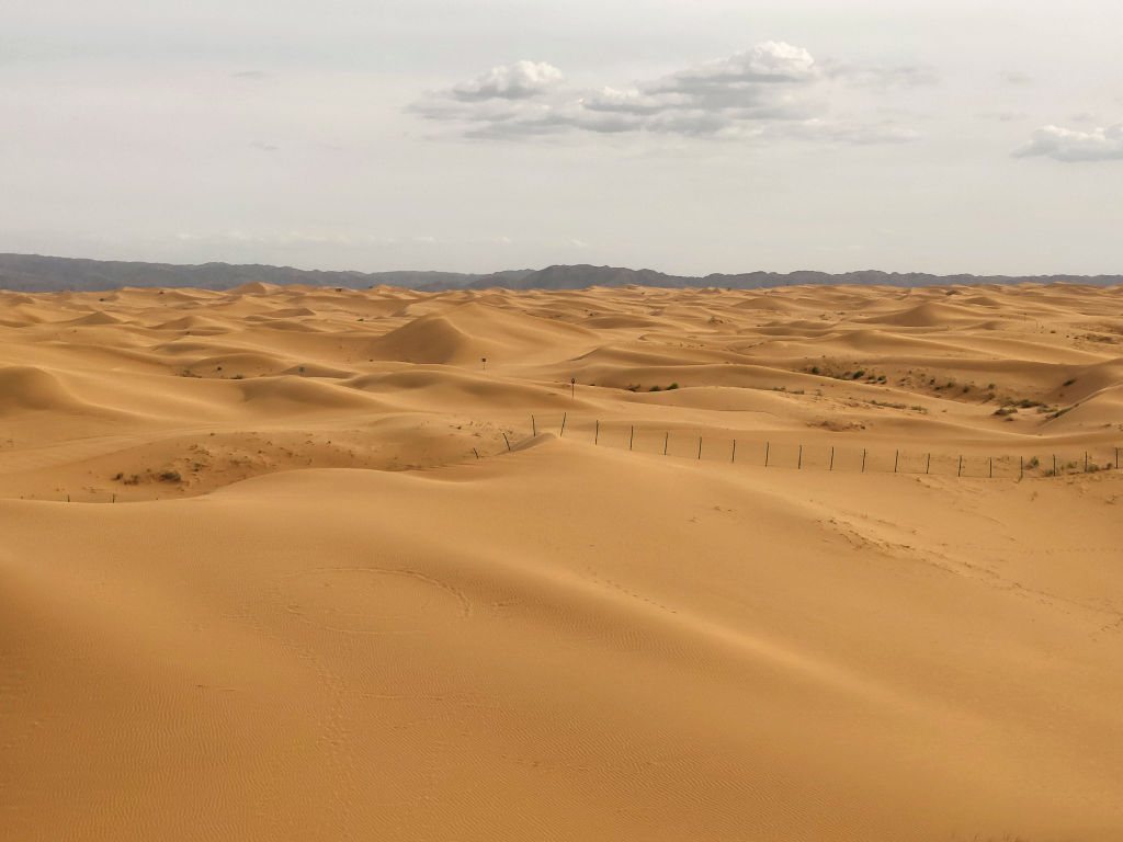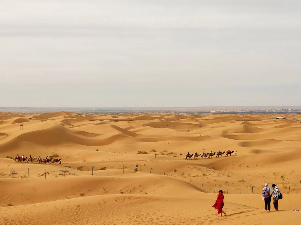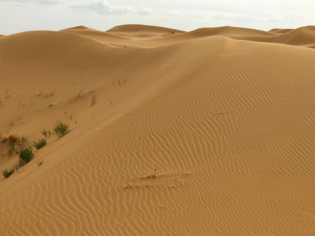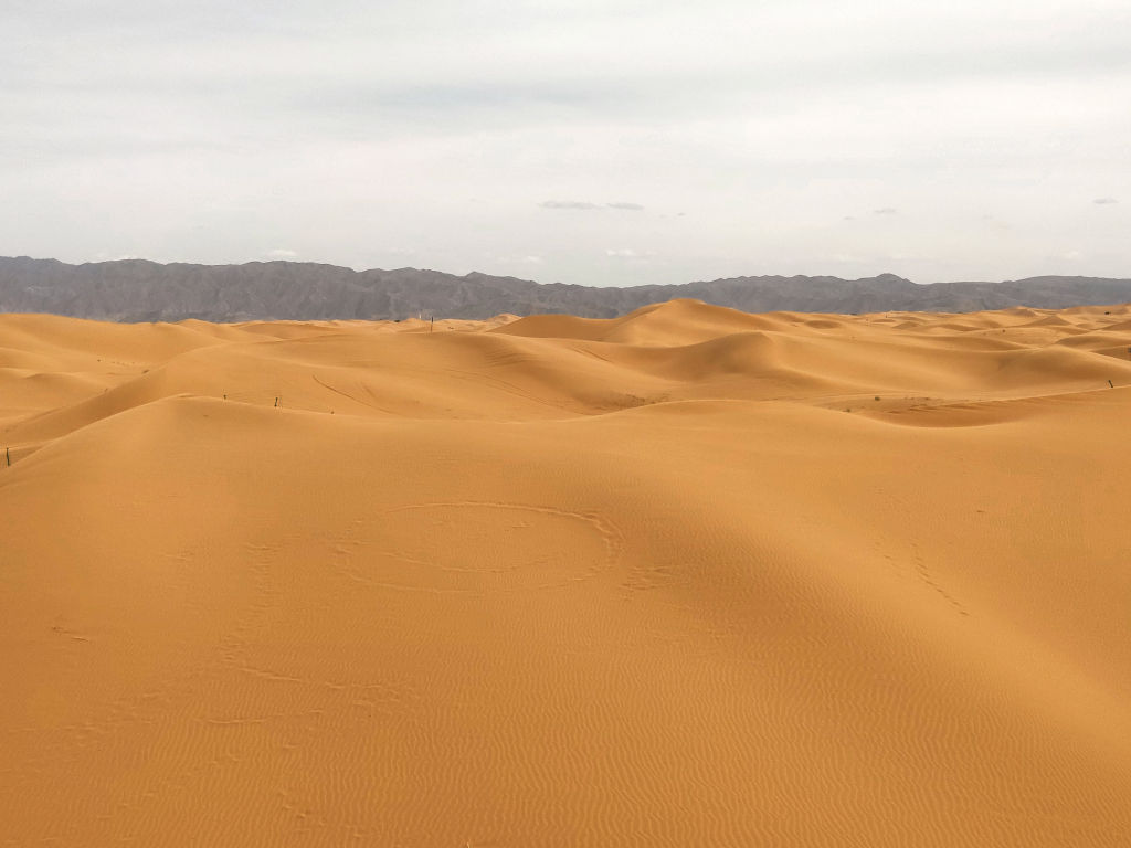 Pas vraiment ce que l’on imagine de la route de la soie et la solitude du désert. Le site est en soi vraiment grandiose avec de grandes dunes jusqu’à l’horizon, un sable fin jaune. Le pire c’est que la navette a roulé un bon moment avant d’arriver à cette zone touristique planté au milieu des dunes, on aurait pu s’arrêter ou on veut et faire un petit tour mais non. En même temps, en toute honnêteté, on imaginait bien que cela ressemblerait à un parc d’attraction dans le désert. J’en rajoute une dernière, le site est fermé par un grillage pour éviter que les touristes ne s’aventurent seuls dans les dunes ! On essaye de voir le positif et on profite quand même de ce petit carré de bac à sable propre et sécurisé pour en faire le tour, on a une belle vue vers le vaste désert de Tengger, le quatrième plus grand désert de Chine.