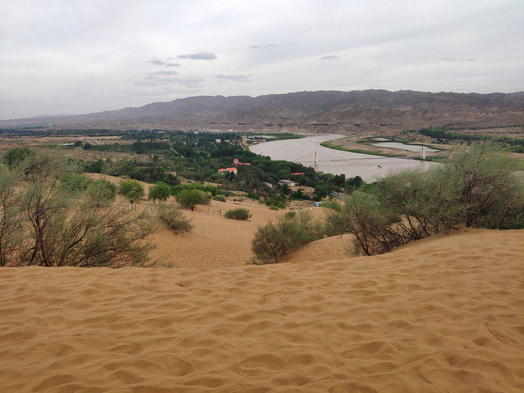 De l’autre côté, on aperçoit la ville de Zhongwei. Comme toutes les villes du Ningxia, ce ne sont pas les grands batiments qui s’élèvent dans le ciel, mais les cheminées des usines chimiques et pétrolières, la région étant spécialisée dans ce type d’industries.