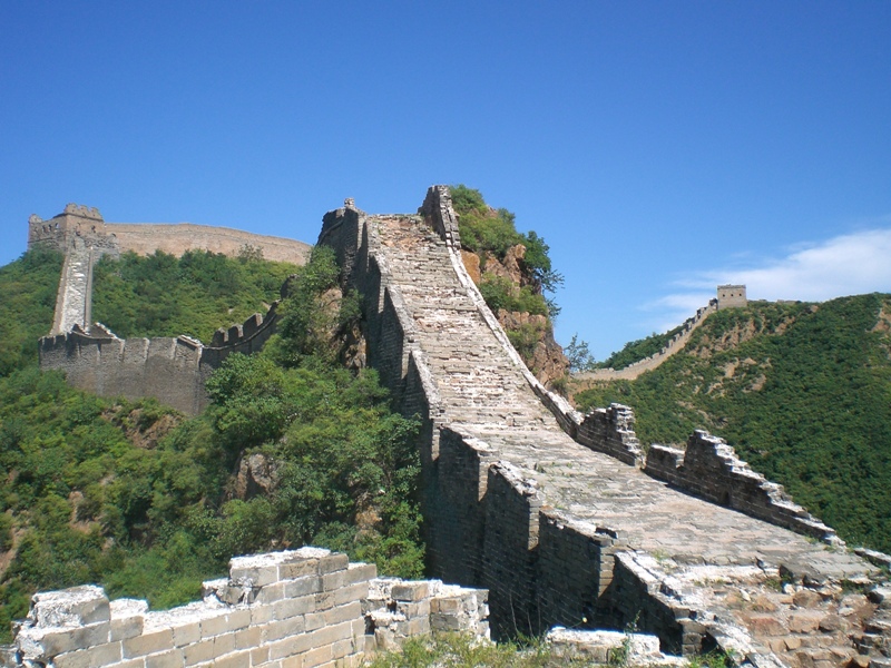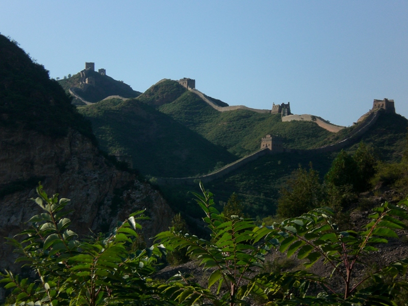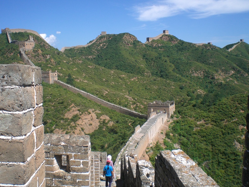 Nous croiserons finalement que quelques touristes ce jour là. Tout au plus 10, sachant que nous sommes en plein mois d’août, bizarre. Pourtant cela permet d’apprécier, de prendre son temps et de n’entendre que le bruit du vent… et des vendeurs de livres de photographies sur la muraille durant les quatre saisons. Les parties proches de l’entrée sont déjà rénovées, par contre au milieu du chemin il n’y a plus de parapet, les marches se sont effritées, et il ne faut pas être déséquilibré. Après le passage d’une tour, il n’y a même plus de pont et il faut sauter (pour les plus téméraires) ou contourner la tour en revenant en arrière (pour les autres). La redescente sur Simatai permet de voir que la muraille s’étend réellement à perte de vue, devant comme derrière, elle se confond finalement avec l’horizon lointain.