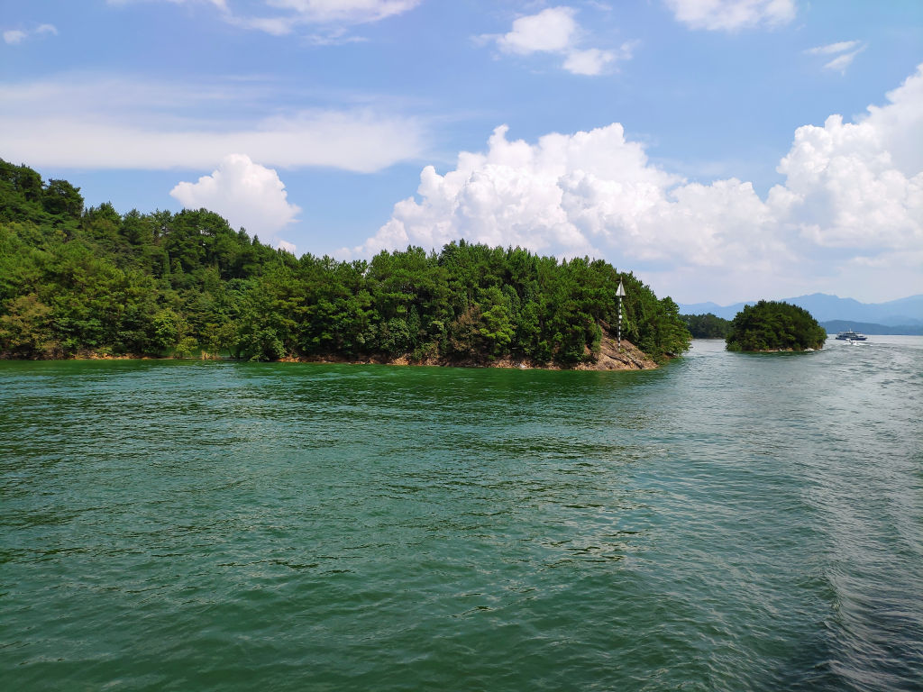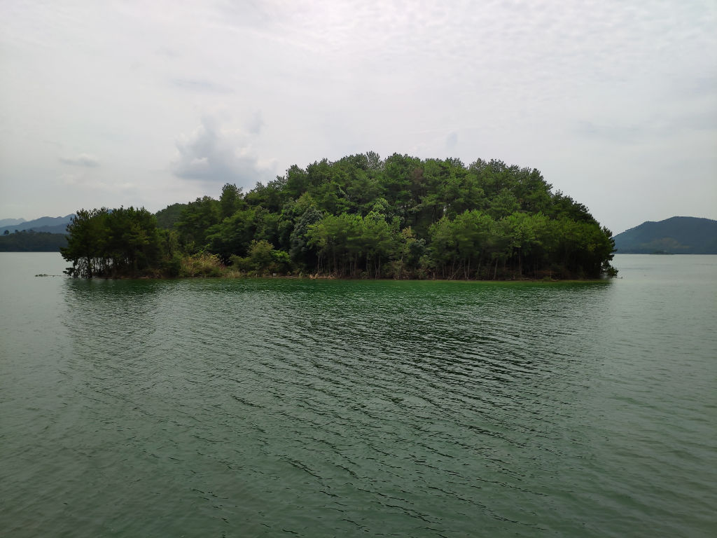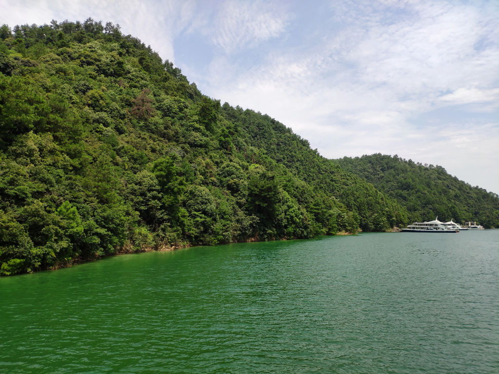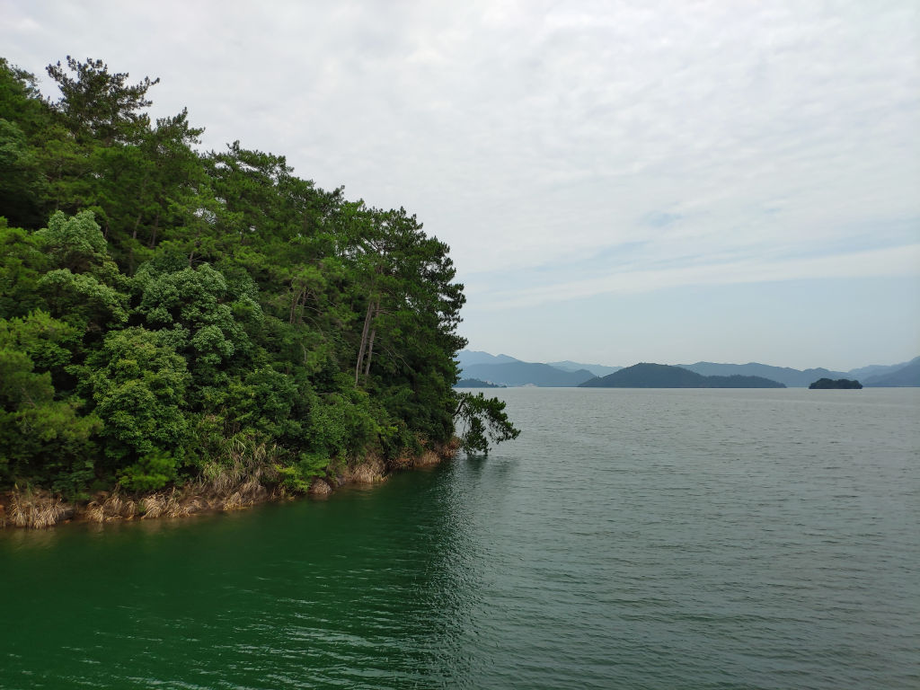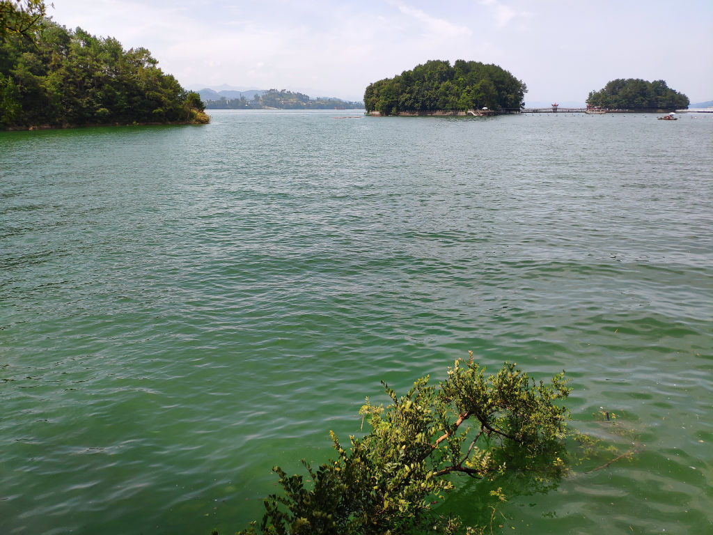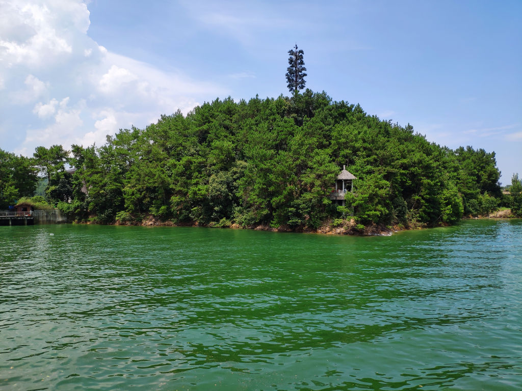 Comme c'est la période où le niveau de l'eau est plutôt élevé, on rate quand même une des beautés de Qiandaohu. En effet, ces îlots normalement dépasse un peu plus au dessus de l'eau et on peut voir la base est faite de terre orange, ce qui ajoute une troisième couleur, avec le bleu de l'eau, le vert de la végétation luxuriante.