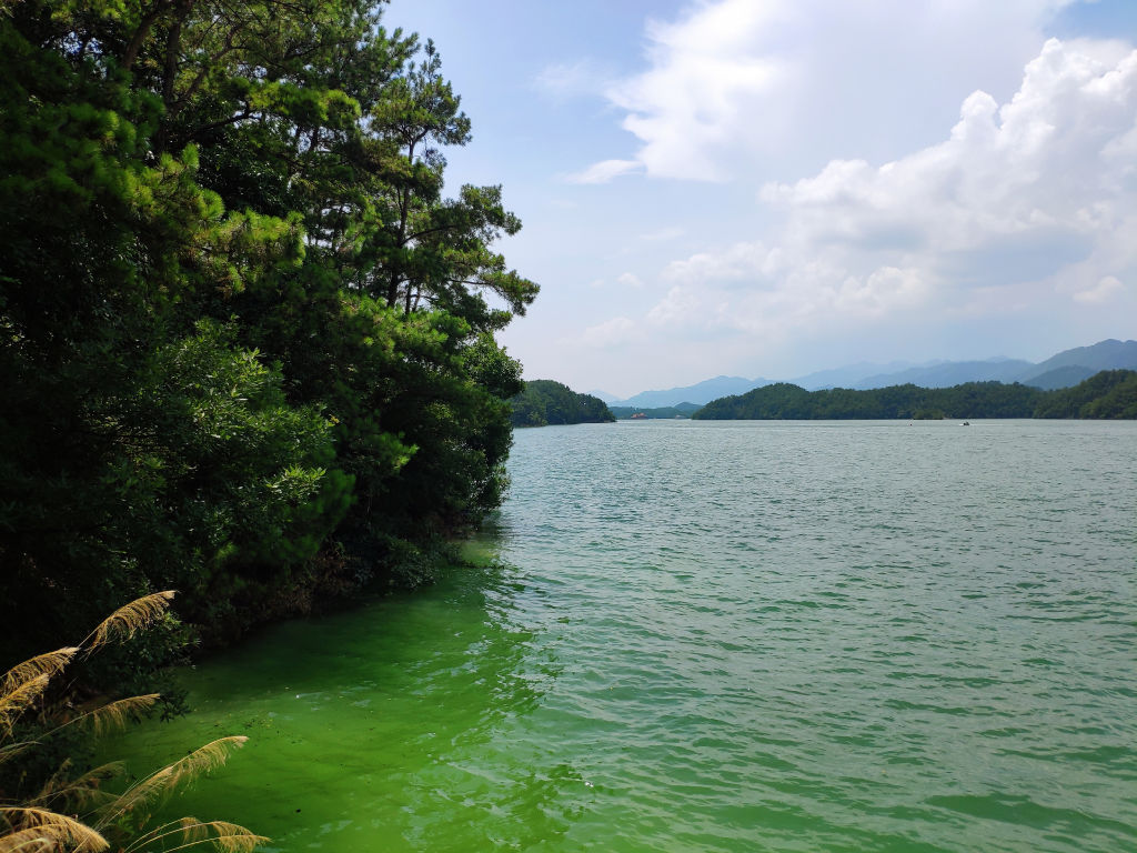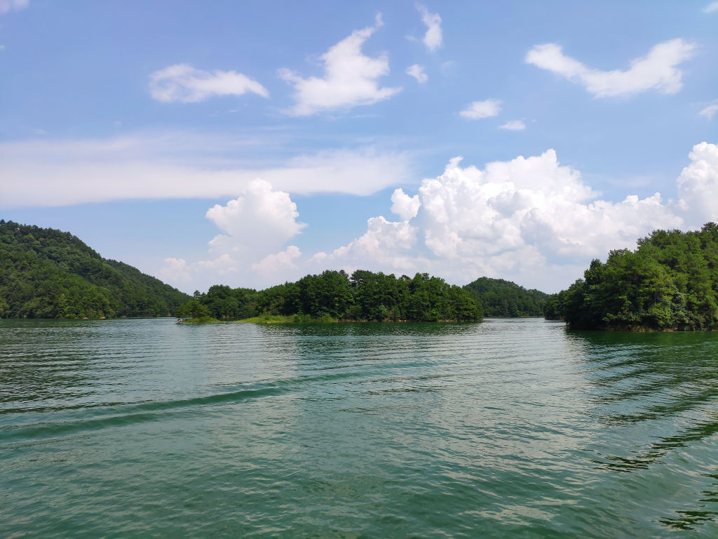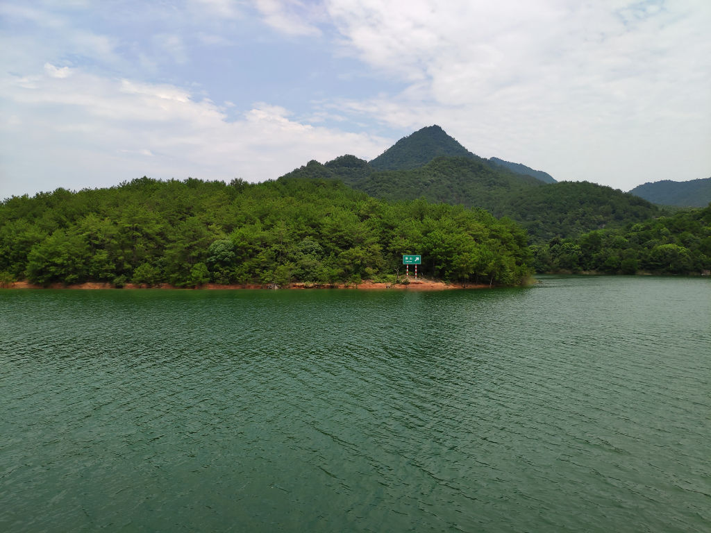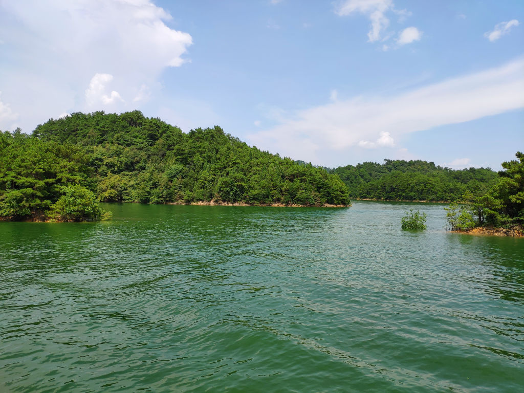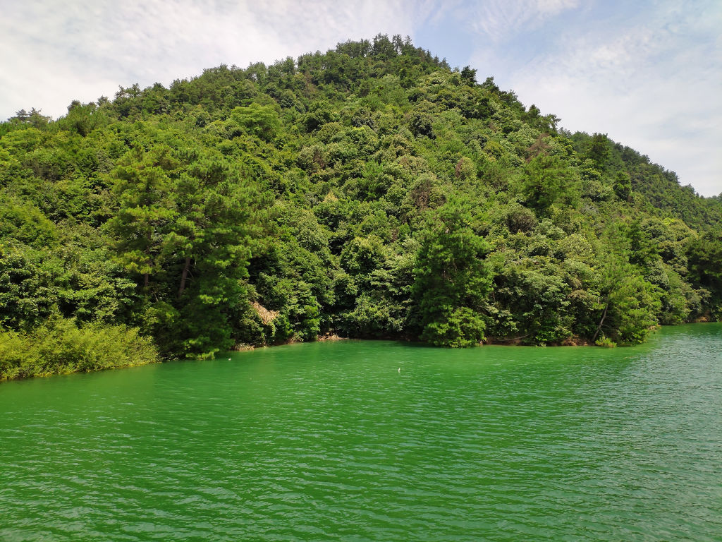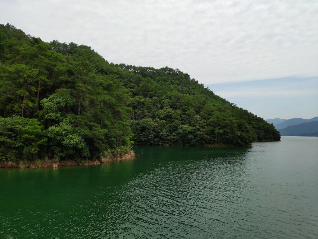 Comme c'est la période où le niveau de l'eau est plutôt élevé, on rate quand même une des beautés de Qiandaohu. En effet, ces îlots normalement dépasse un peu plus au dessus de l'eau et on peut voir la base est faite de terre orange, ce qui ajoute une troisième couleur, avec le bleu de l'eau, le vert de la végétation luxuriante.