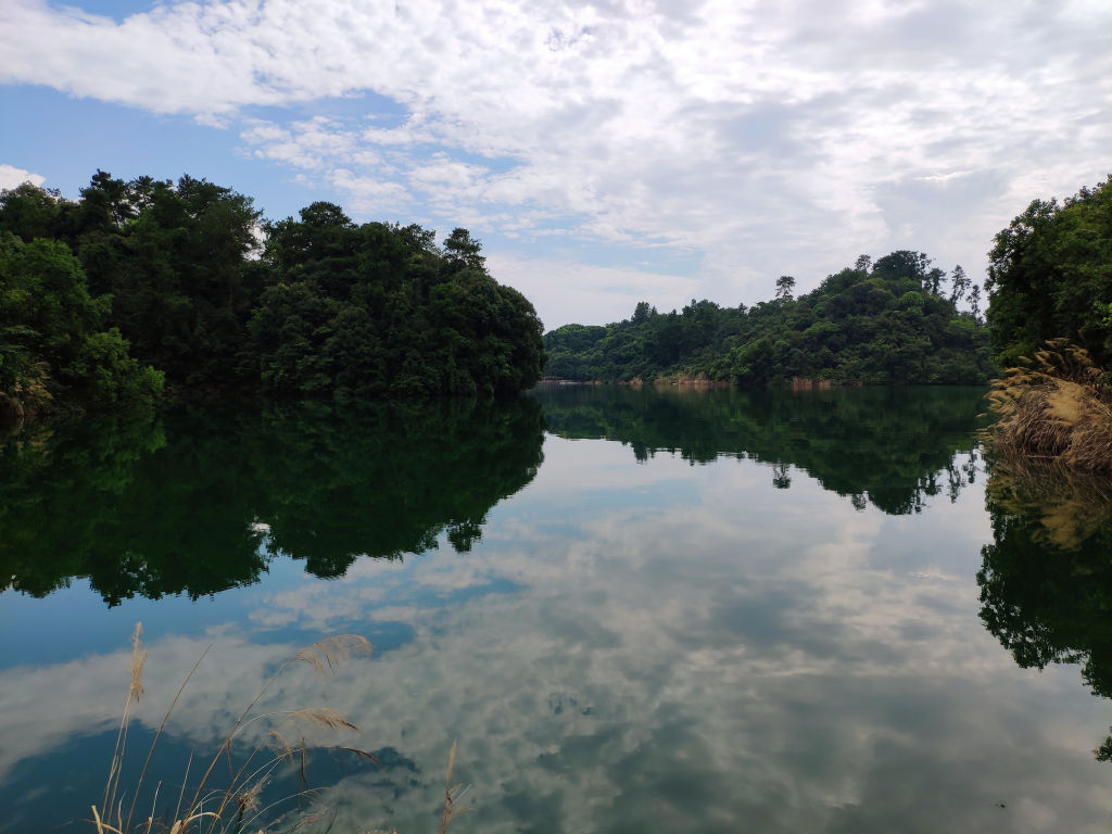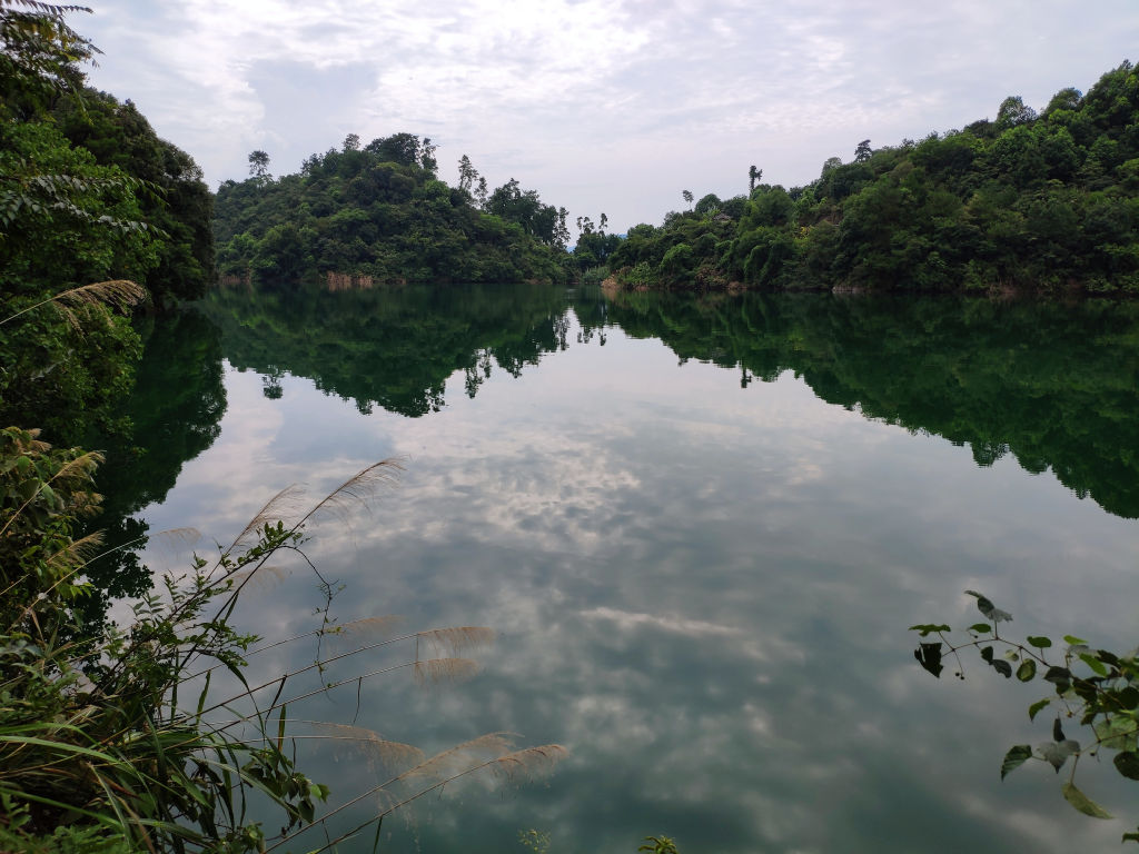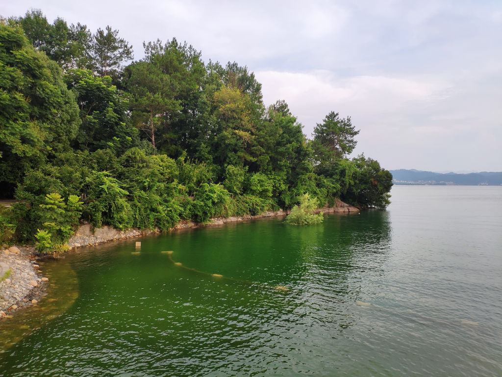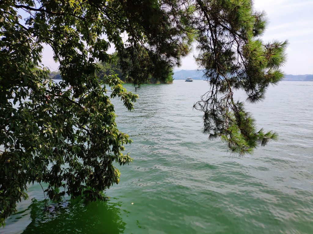 Après cette superbe étape contemplative, nous reprenons le bateau vers le port. On arrive en fin d'après midi et maintenant on se met en tête qu'avec cette chaleur, rien de mieux que de piquer une tête dans l'eau du lac. Ce sera un peu plus compliqué que prévu. On demande à l'hotel qui nous dit que les berges autour de l'hotel sont interdit à la baignade pour des raisons de sécurité car on n'a pas pied, malgré qu'en se promenant on remarque une plateforme qui pourrait faire l'affaire. Comme souvent en Chine, on est sur protégé pour éviter tout problème, c'est tout simplement interdit. Comme on a les idées fixes, on continue de marcher pour enfin trouver un chemin qui descend jusqu'au lac sans être dans le champs de vision d'une caméra. On en profite pour se baigner malgré une eau vraiment très chaude qui ne permet pas de se refroidir, on a l'impression que l'eau est encore plus chaude que l'air.