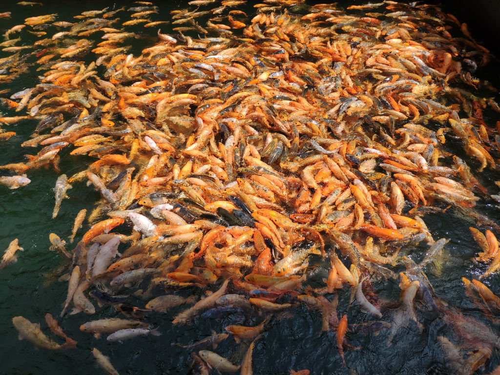 Sur une des plateforme qui relie les îles, des bassins sont installés avec des carpes. Il y en a vraiment énormément.