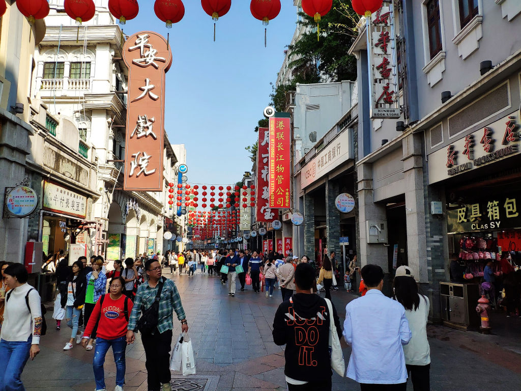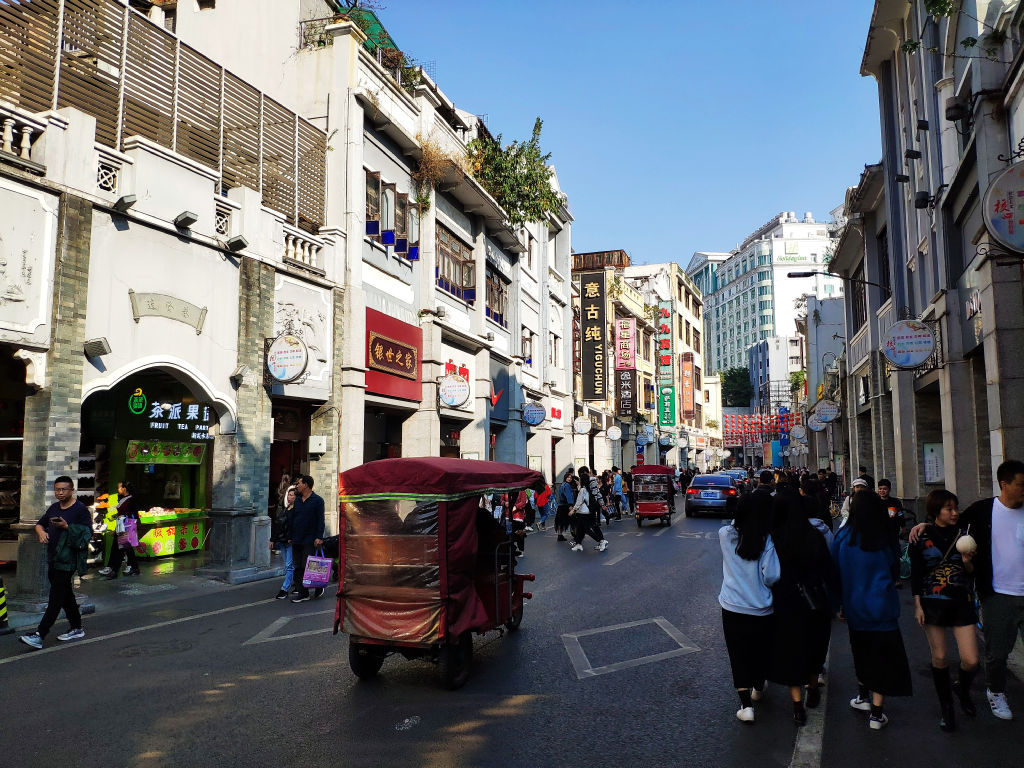Il faut dire que Guangzhou n’est pas une ville que l’on mettra en haut de la liste des destinations en Chine, elle ne recèle pas de sites touristiques d’importance et l’étendue de la ville, les embouteillages dans cet enchevêtrement de routes et ponts ne la rendent pas facile à appréhender. Mais justement, cette grandeur c’est un peu ce qui fait son charme. Surtout le centre-ville encore composé de nombreux bâtiments à la façade un peu décrépie, tout ce monde dans les rues agitées, on sent l’activité commerciale intense du Sud de la Chine, des transporteurs qui tirent ces chariots remplis de cartons dans ces quartiers segmentés par spécialité (sacs, vêtements, chaussures, etc.) que l’on traverse à vélo. L’avènement des vélos en libre-service est vraiment pratique pour découvrir les différentes facettes de la ville, mais aussi rouler sur les bords de la rivière des perles.