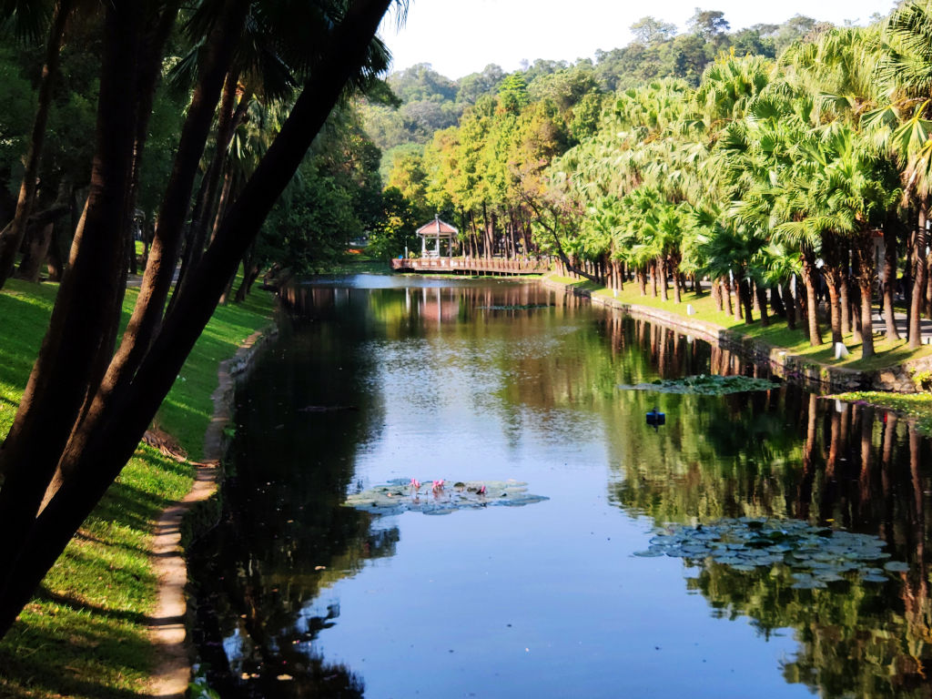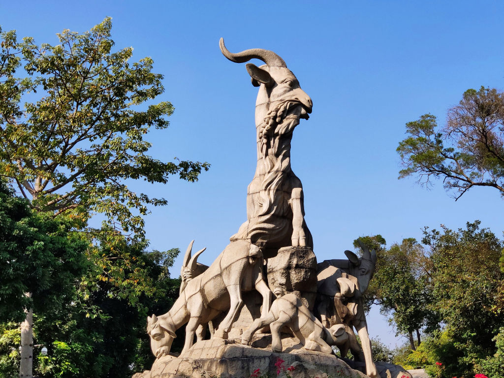 Le parc de Yuexiu mérite que l’on s’y promène, on y trouve un des symboles de la ville de Guangzhou. Bon, ce n’est pas impressionnant en soi, c’est une statue de pierre représentant cinq chèvres. Ces chèvres aurait été à l’origine de la création de la ville et tous les tours passent par ce symbole dans leur itinéraire. Je pense que le passage par le parc n’est pas indispensable, mais on peut quand même y trouver des choses intéréssantes. Déjà le parc est un havre de paix, ça fait du bien de sortir du tumulte de ces grandes avenues, ces autoponts, ce trafic... Les palmiers rangés face au plan d'eau donne une très belle image.