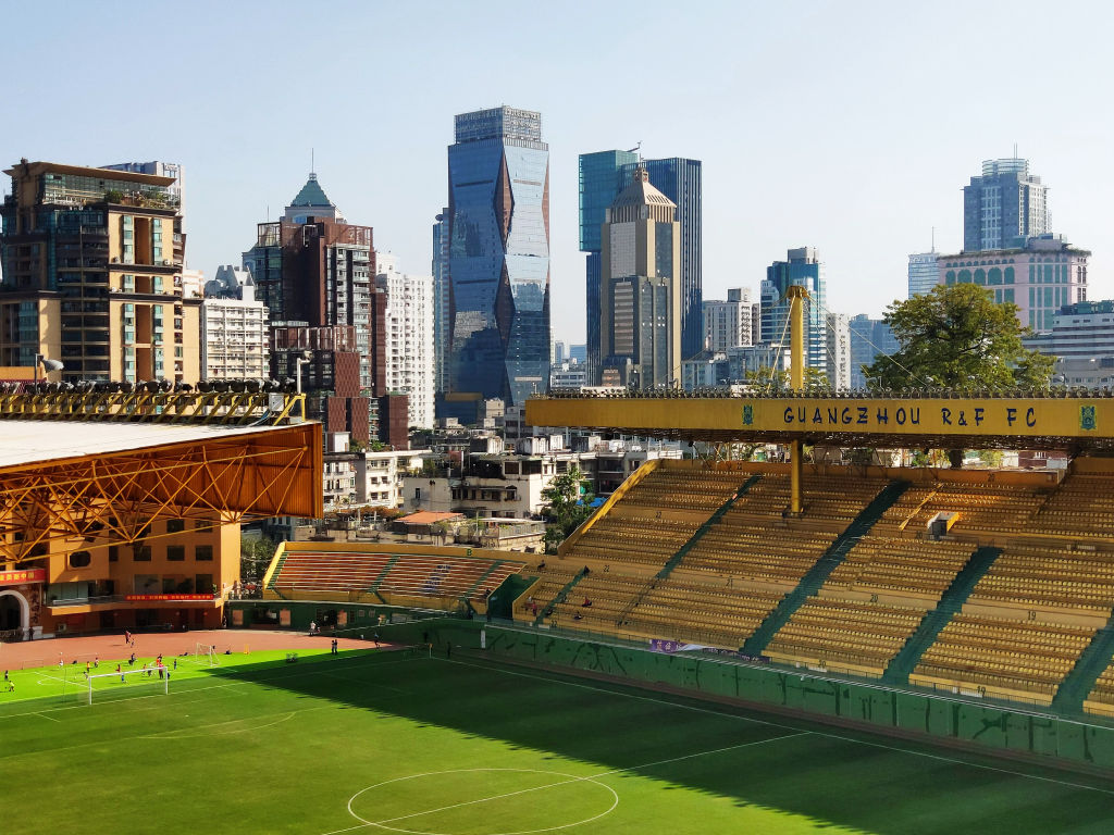Le stade du Guangzhou FC est installé dans un stade naturel, épousant le dénivelé de la montagne, on a une vue dominante sur la ville.