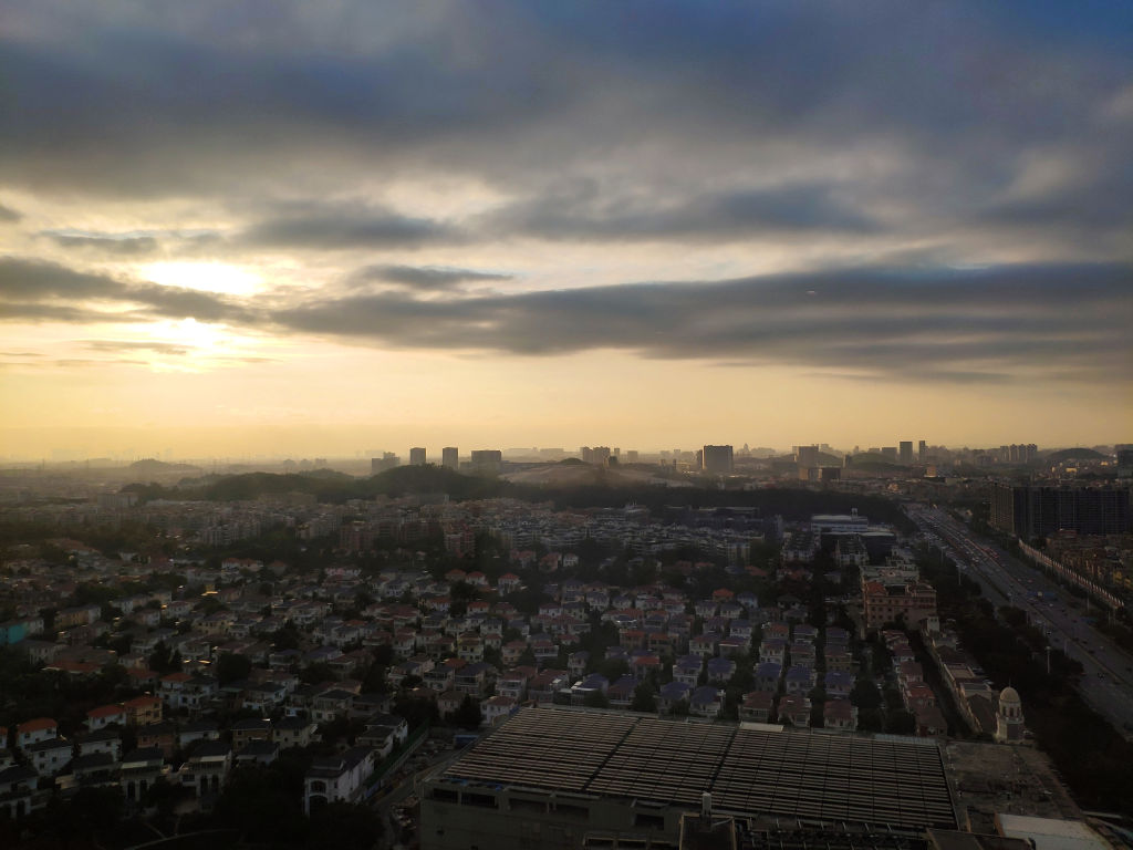 Départ matinal pour Shenzhen, le soleil se lève sur le quartier de Panyu. Guangzhou fait partie du projet de mégacity du Sud de la Chine, qui doit compter plus de 100 millions d'habitants entre Hong Kong, Macau et Guangzhou, en comptant les villes de Shenzhen, Dongguan, Foshan, Zhuhai, Zhongshan au son sein.