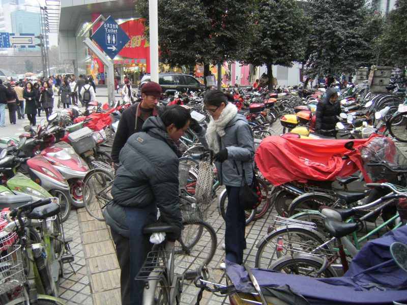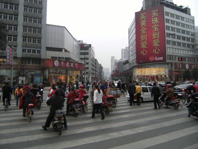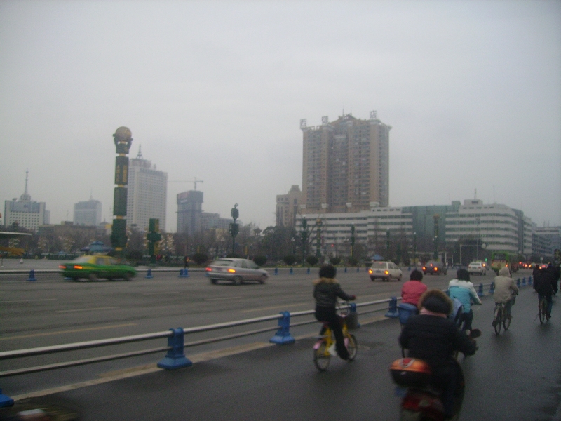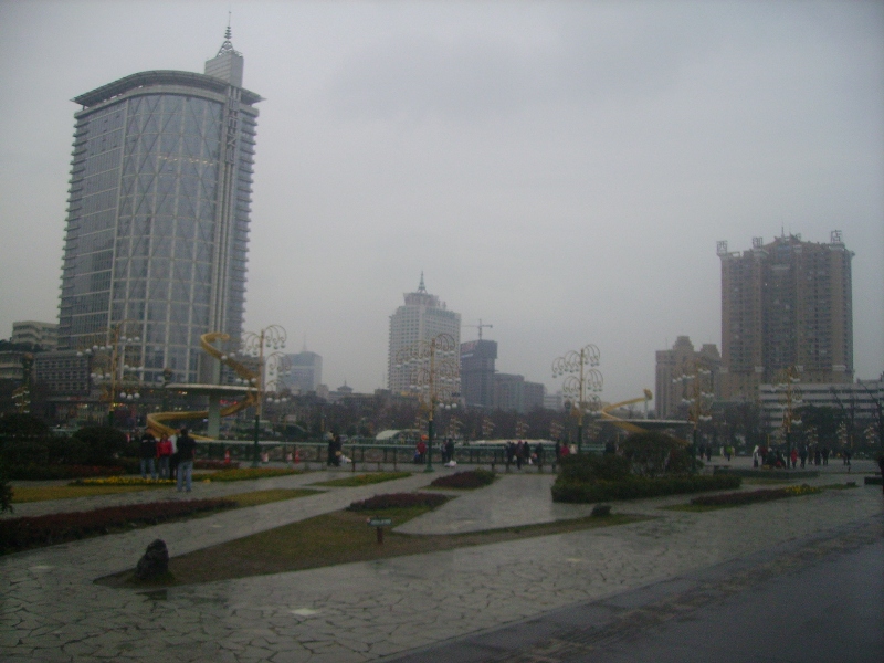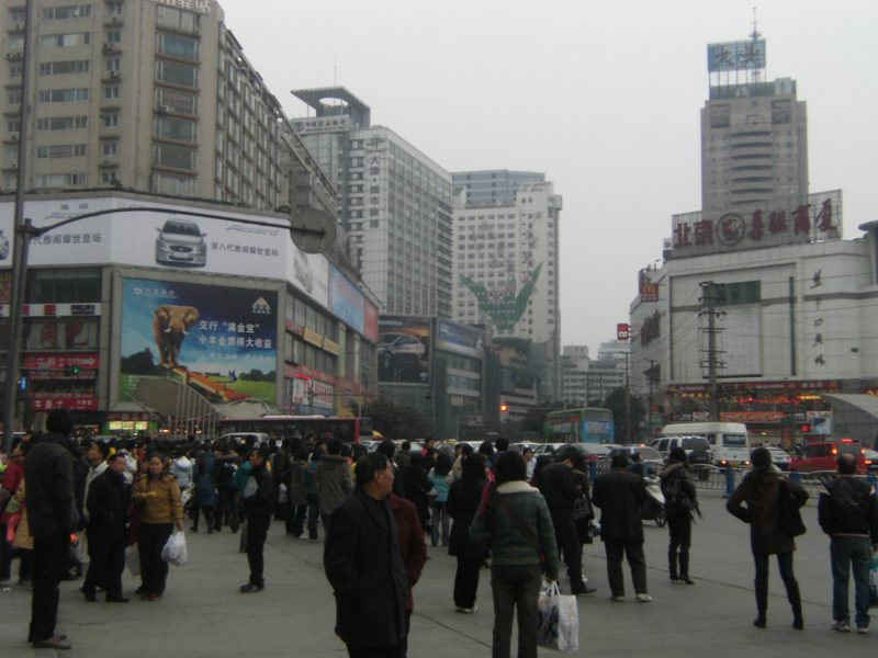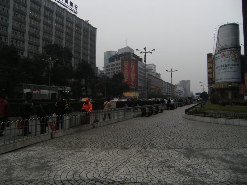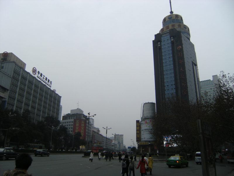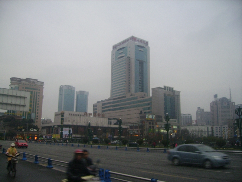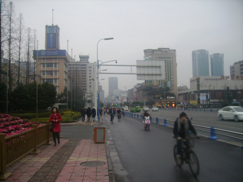 Chengdu est ensoleillé et il fait plus chaud qu'en France mais le brouillard épais englobe la ville et l'on peine à apercevoir les hauts des immeubles. A propos des immeubles, la ville connaît une expansion particulière avec des constructions neuves et élevées qui dominent les nombreux quartiers encore précaires, aux petits artisans qui travaillent dans la rue, aux marchés aux conditions d'hygiène qui foudrerraient un commissaire européen...