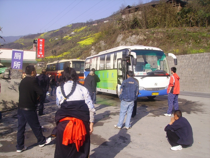 J’embarque dans un bus où je suis le seul étranger et je suis tombé sur plusieurs phénomènes qui vont égailler ce long voyage. Ma voisine de gauche mange des pattes de poulet et recrache le cartilage sur le sol du bus. Ma voisine de droite vomit a chaque virage et quand ce n’est pas du contenu gastrique qu’elle déverse dans le sac plastique bleu donné par le chauffeur, c’est avec de gros crachats blancs que dans un raclement de gorge difficilement égalable qu’elle les remplit avant de tous les ranger sous son siège, au cas où ? Pas loin, un petit homme chauve fixe le téléviseur qui passe un show comique et rigole à toutes les blagues au lieu de regarder par la fenêtre le paysage époustouflant qui défile. Je pourrais rajouter d’autres anecdotes sur les voyages en bus en Chine mais j’ai peur de dégoûter certains à venir découvrir des régions du Nord Sichuan qui ne sont pas accessible autrement. Accompagné de la fine équipe, nous quittons la plaine de Chengdu et commençons à grimper.