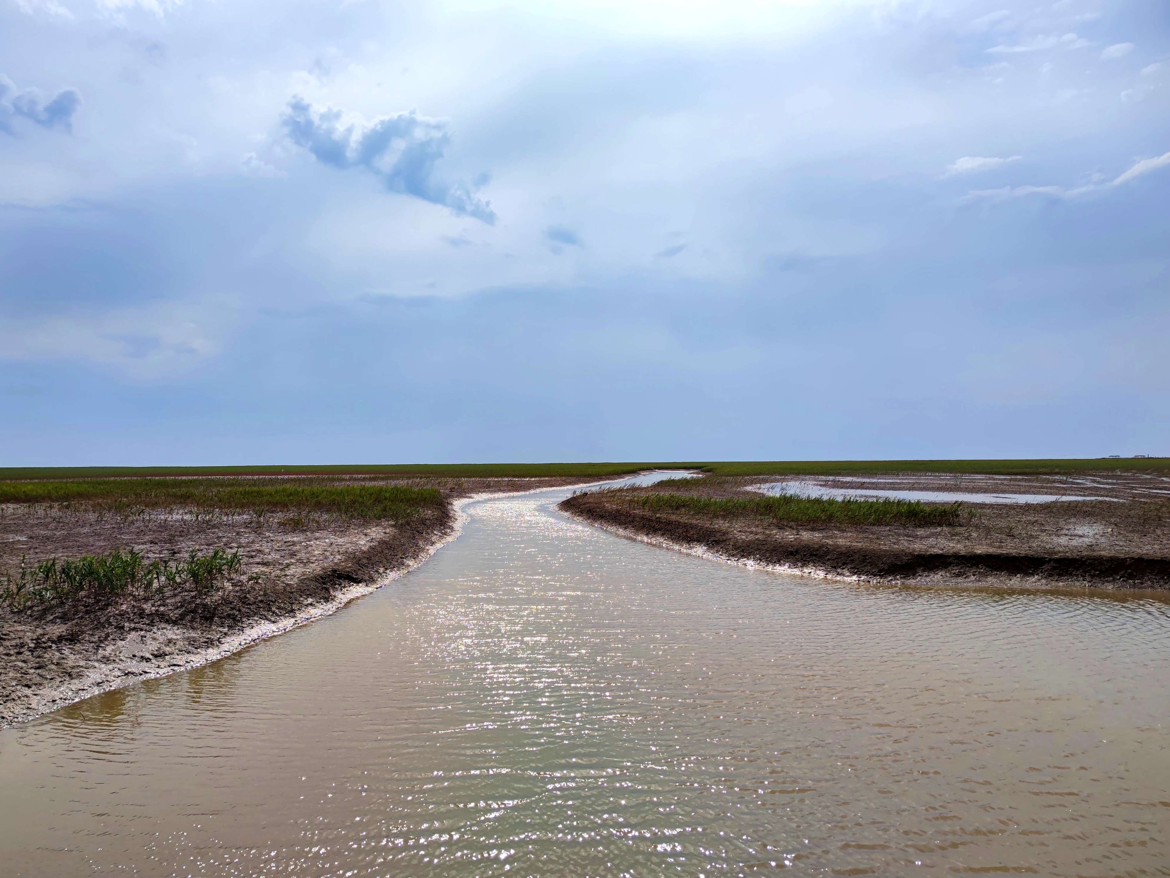 Des ruisseaux traversent la plage rouge, tranchant avec l’homogénéité du paysage.