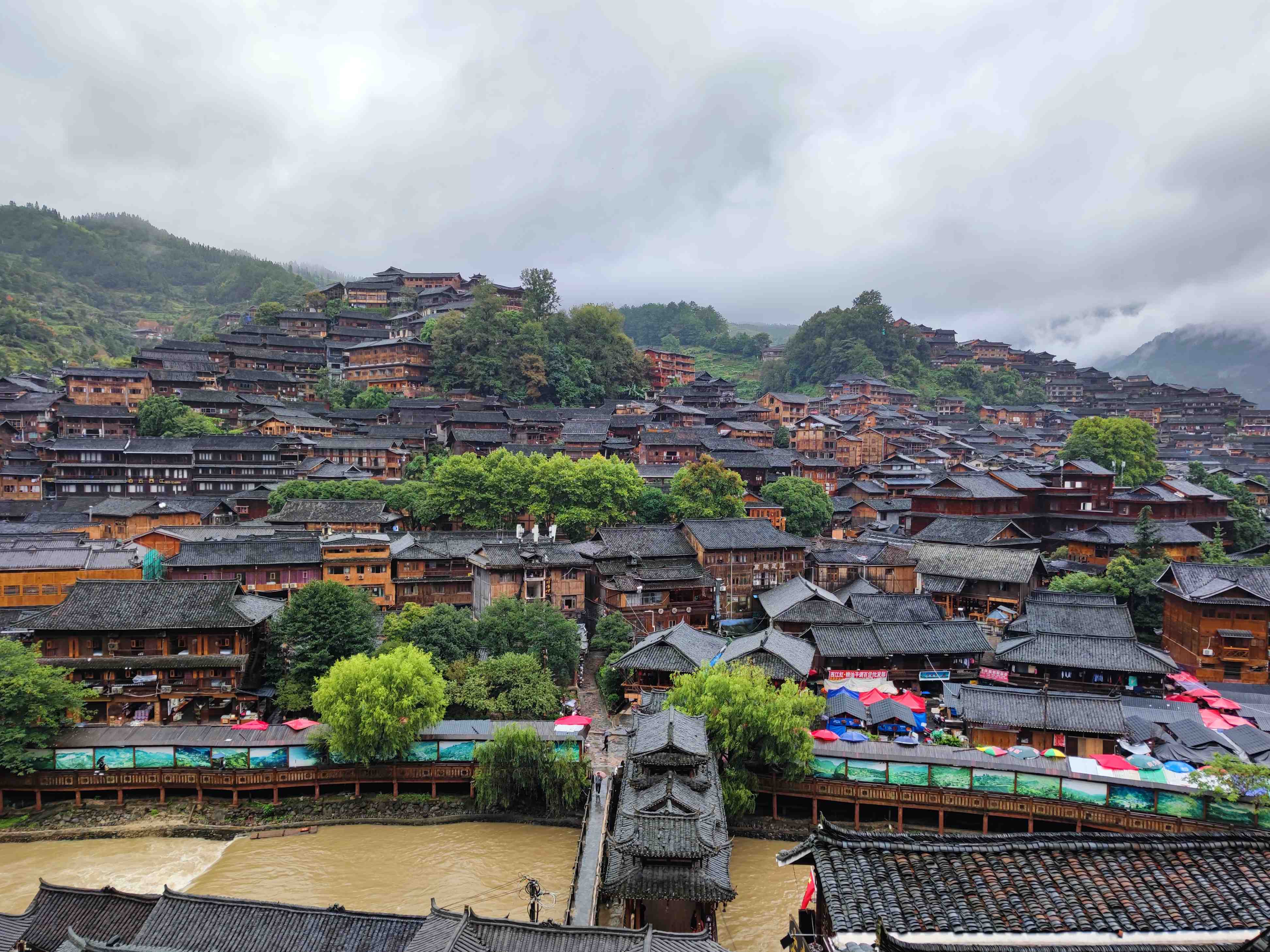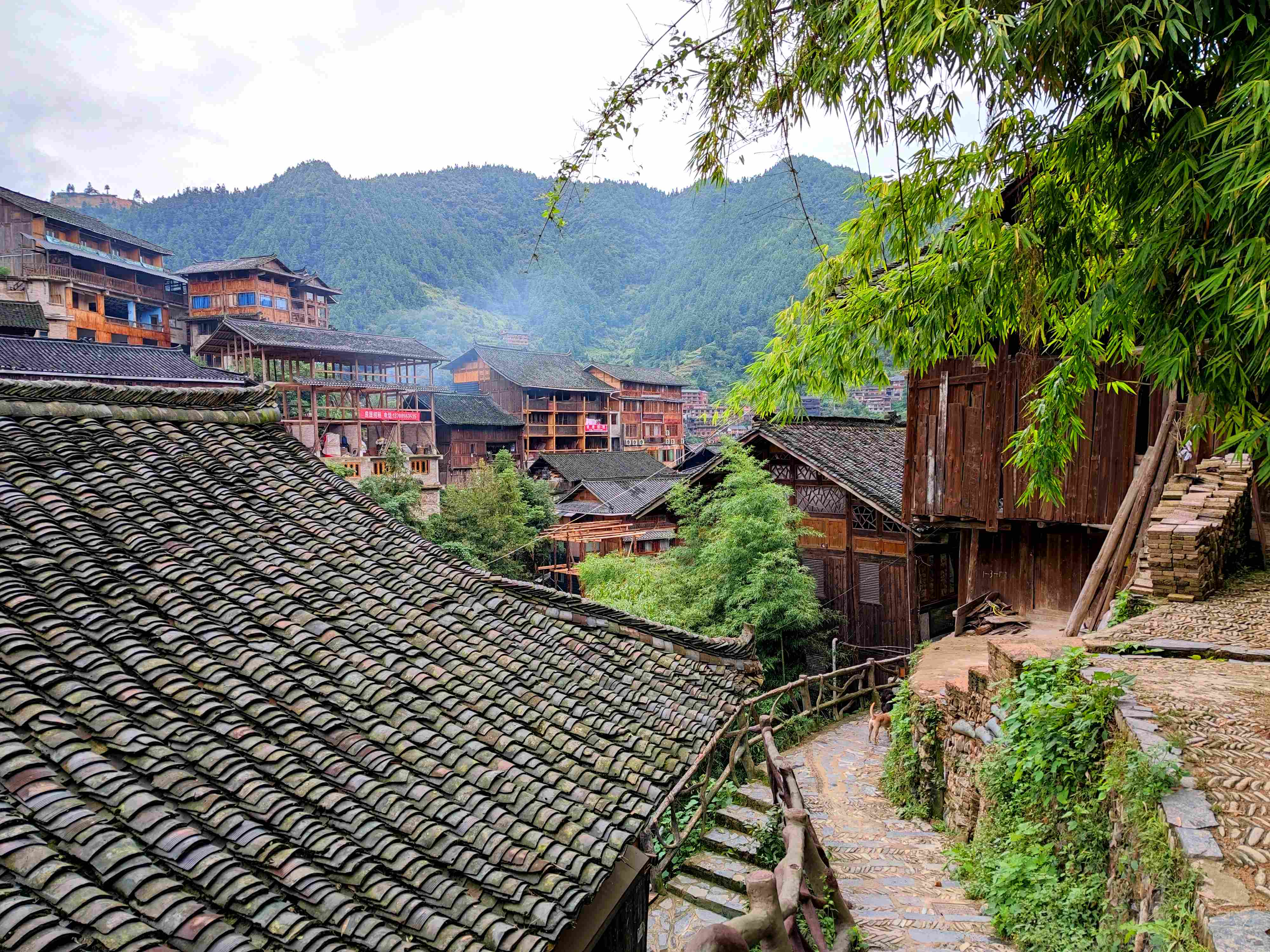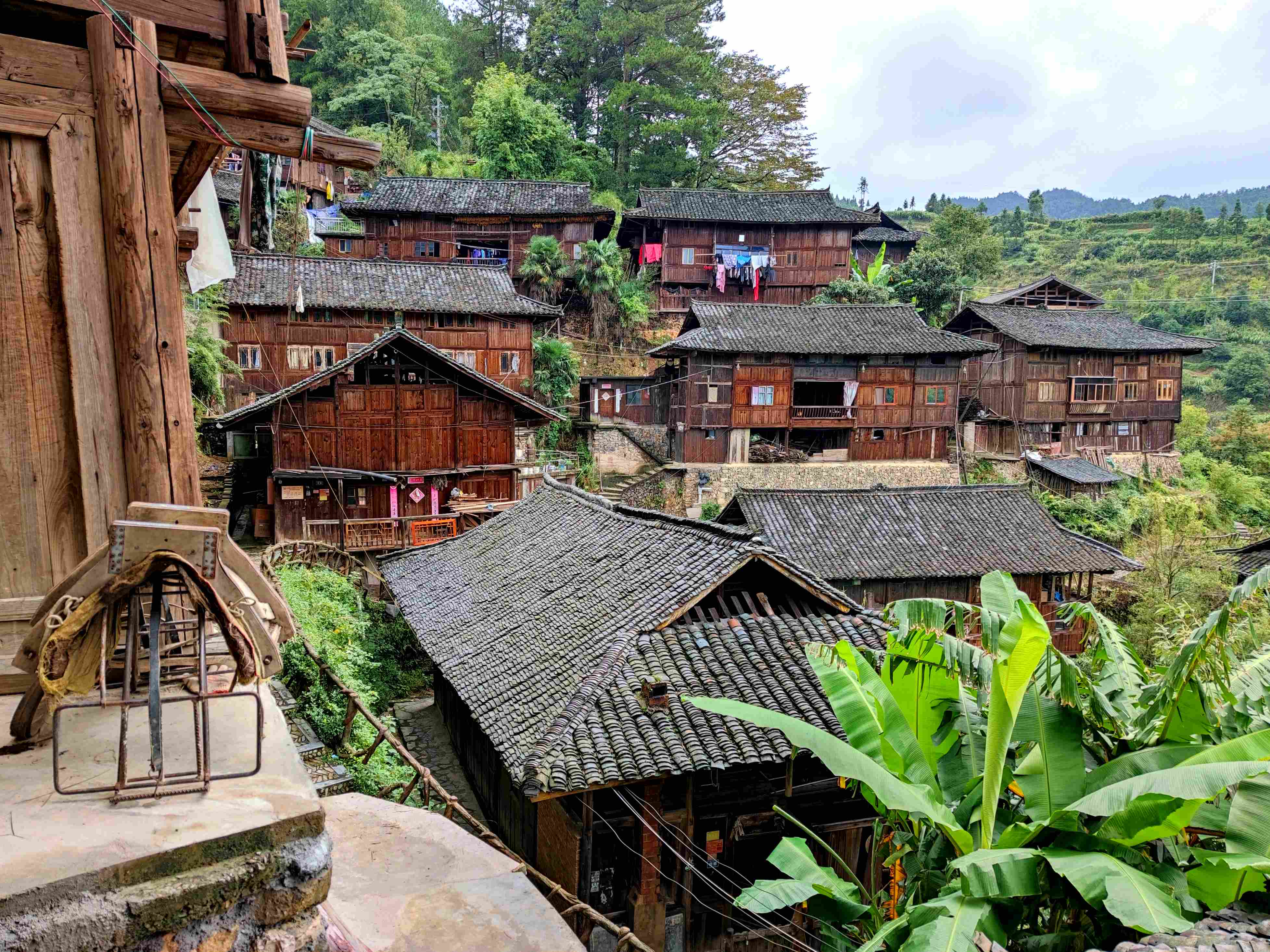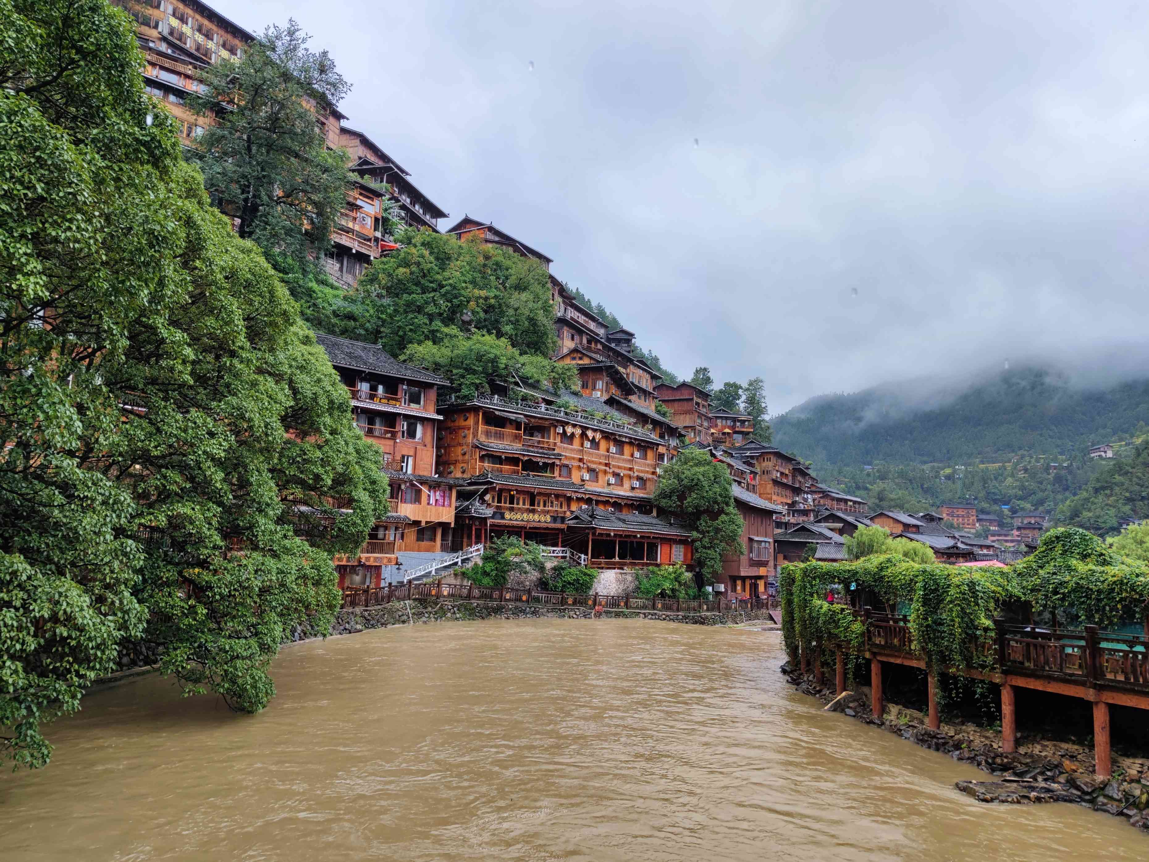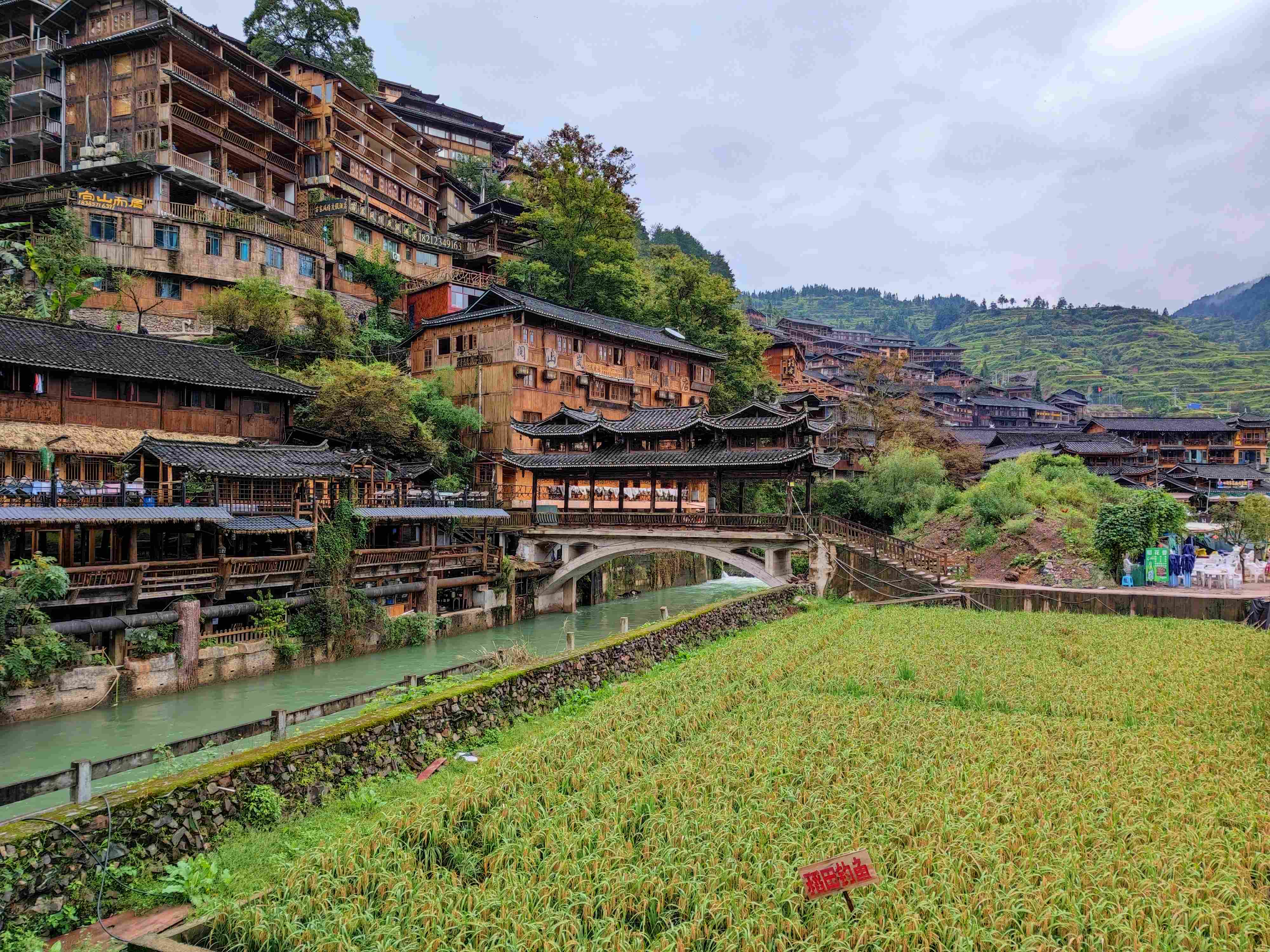 Le village de Xijiang est fait de maisons en bois accrochés à flanc de colline. En son centre coule un torrent vigoureux traversé par des ponts couverts.