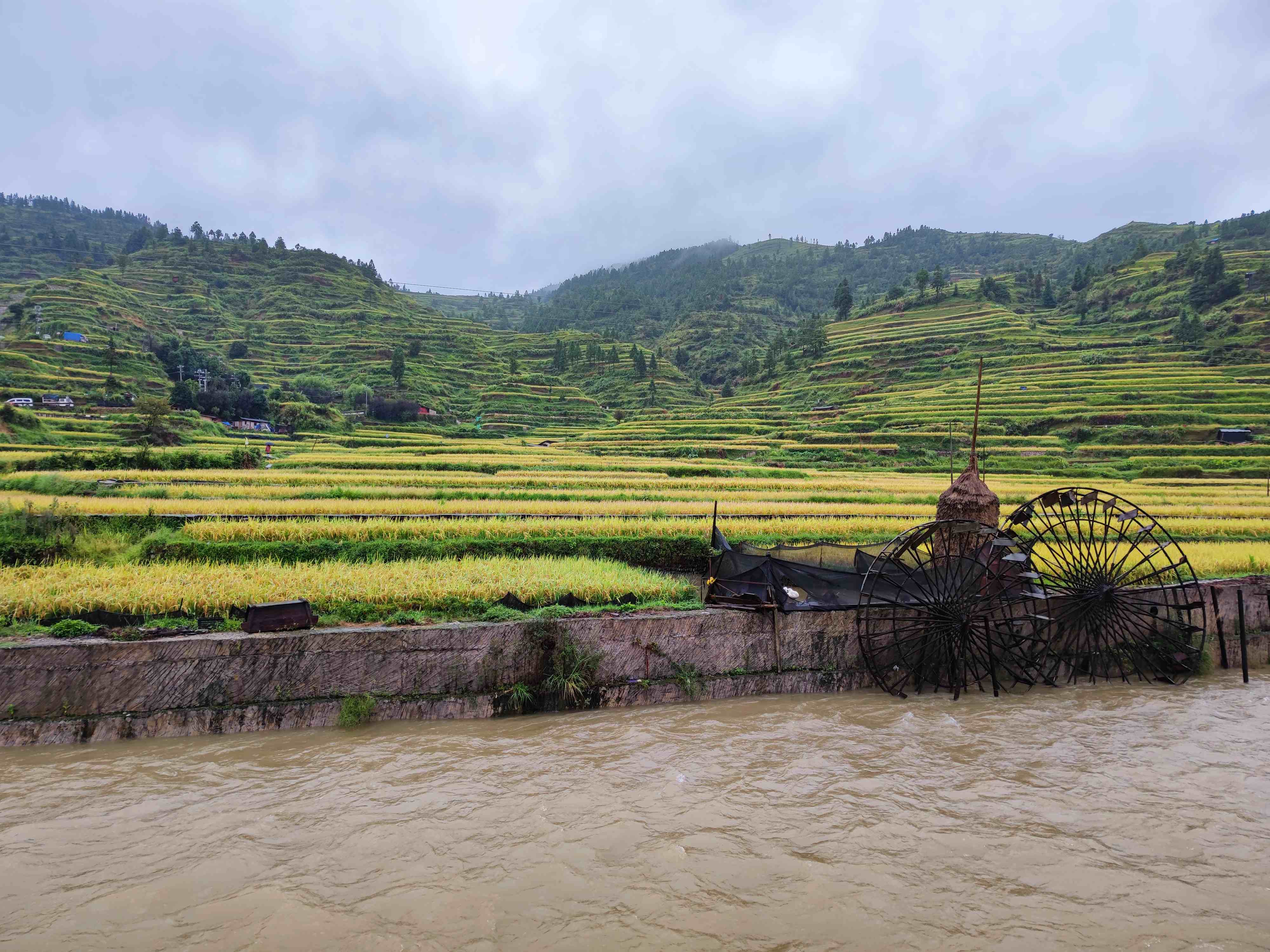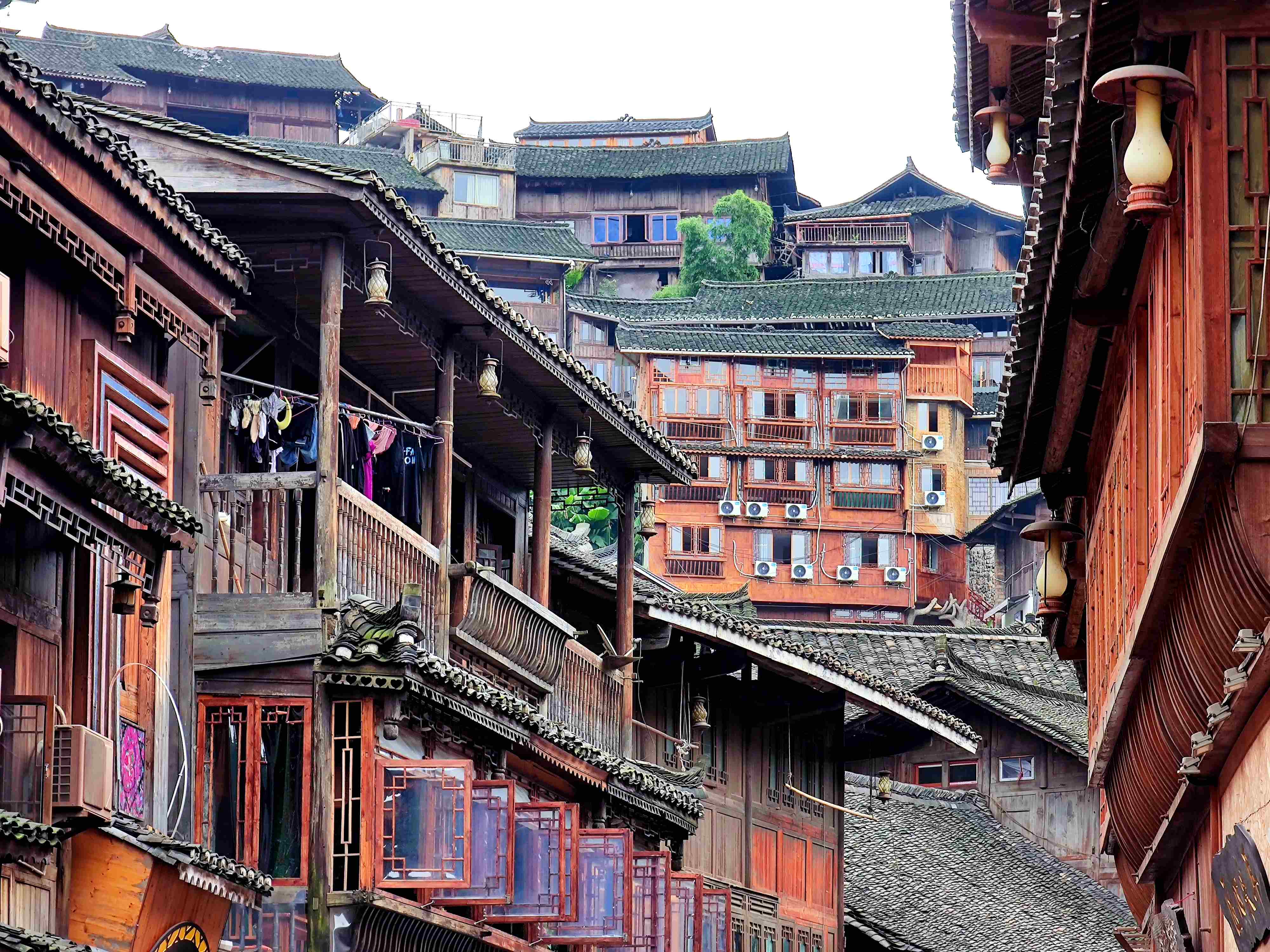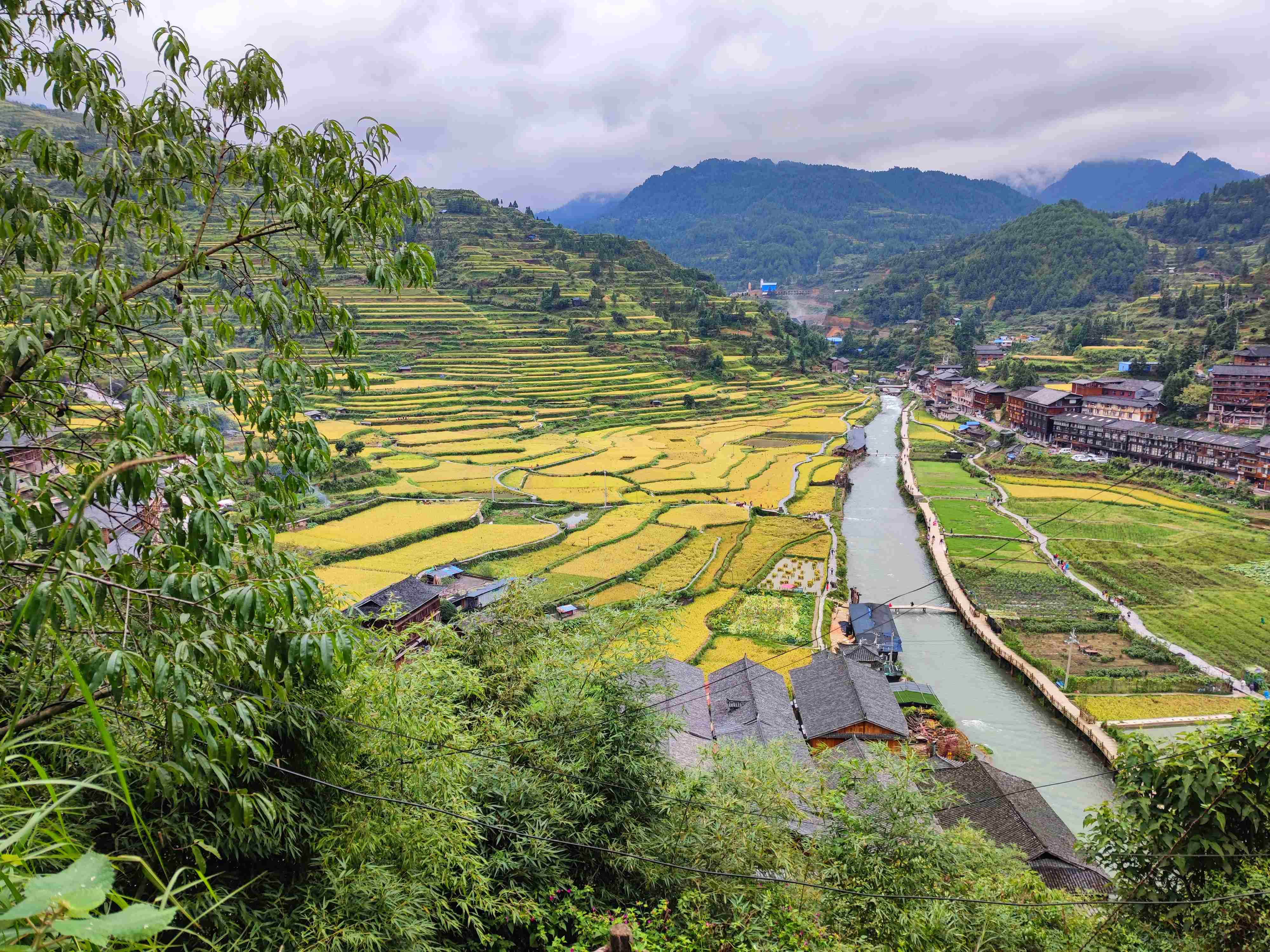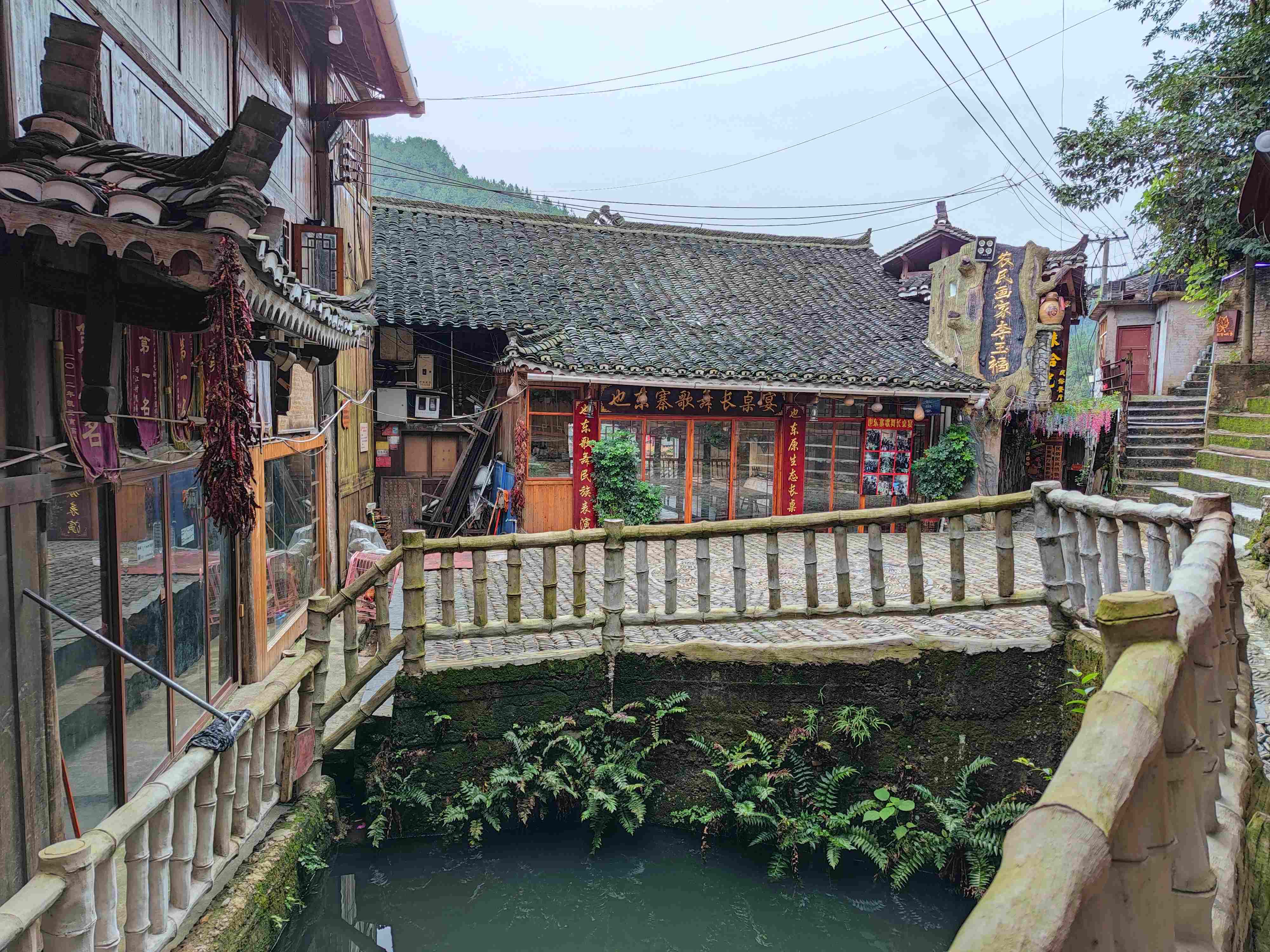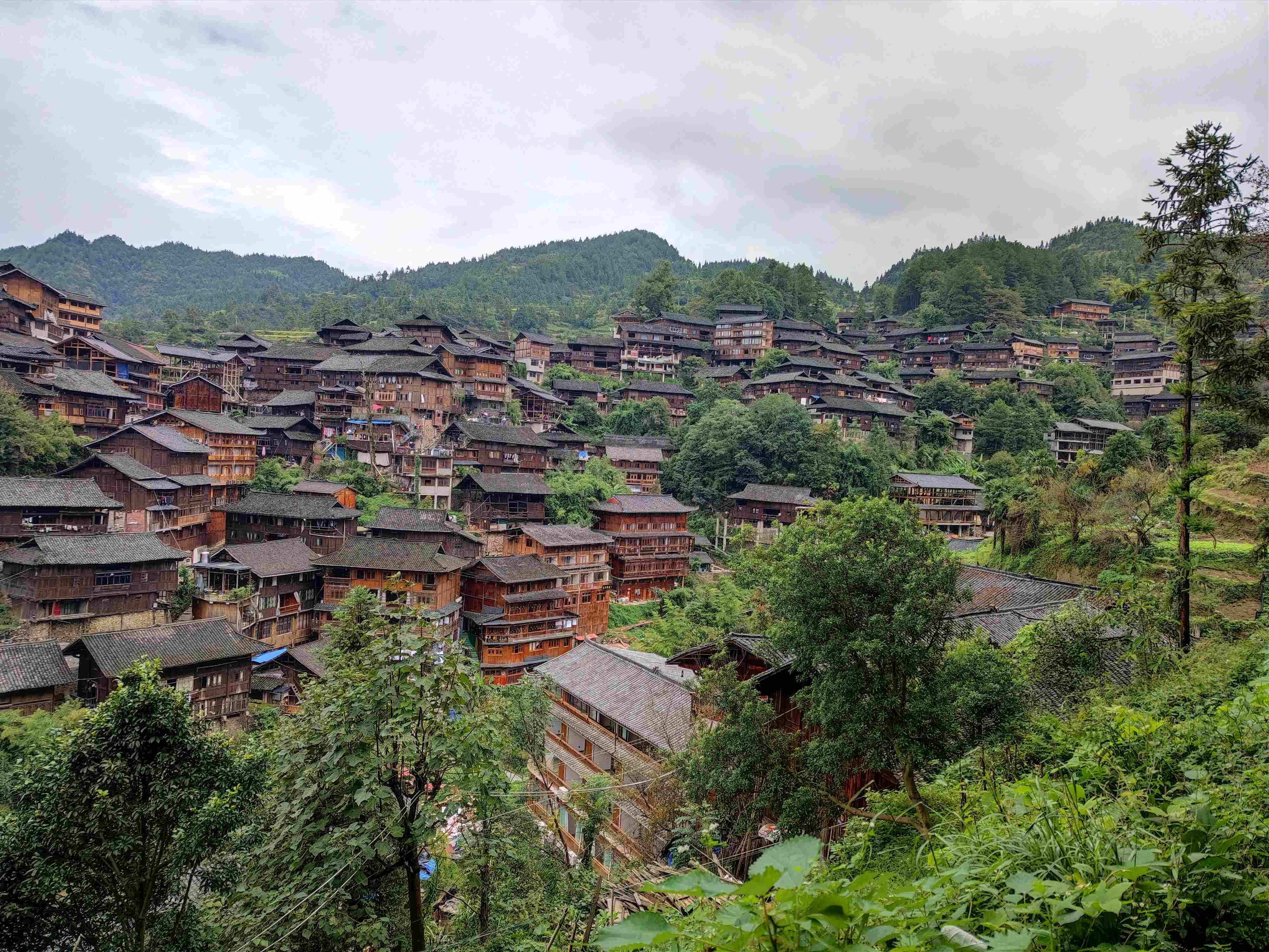 Le village de Xijiang est fait de maisons en bois accrochés à flanc de colline. En son centre coule un torrent vigoureux traversé par des ponts couverts.