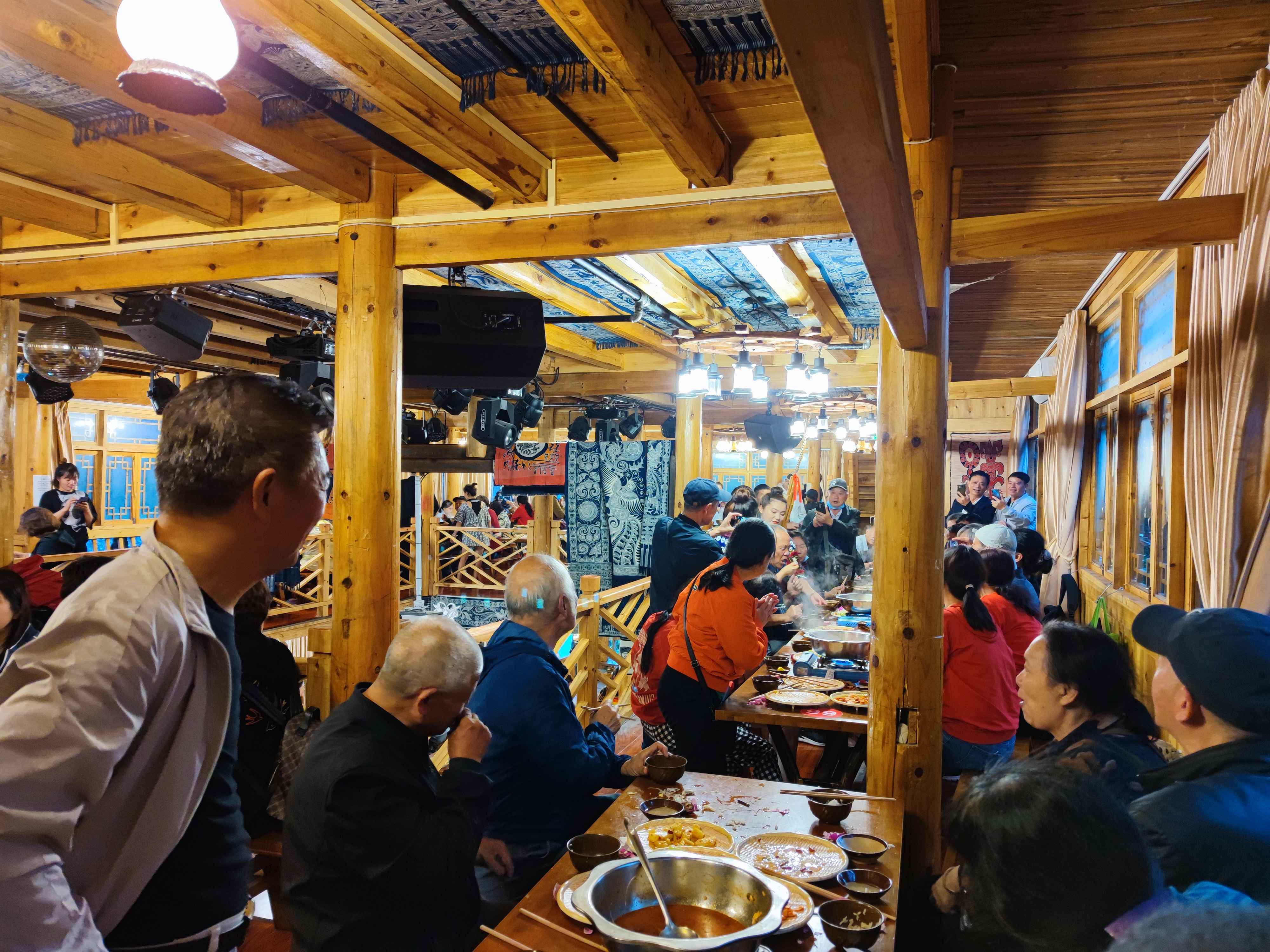 Le temps nous ramène quand même rapidement vers des activités intérieures. Une des spécialités Miao se sont les soirées festives sur des longues tables où l’on déguste tous ensemble une soupe de poisson sauce aigre arrosé de vin de riz très sucré. L’alcool coule généreusement, incité par les musiciens et danseurs qui mettent l’ambiance. C’est assurément une attraction pour les touristes qui veulent avoir un bref aperçu de cette tradition Miao, le diner est vraiment abordable 65 RMB par personne tout compris et je trouve que finalement cela vaut le coup.