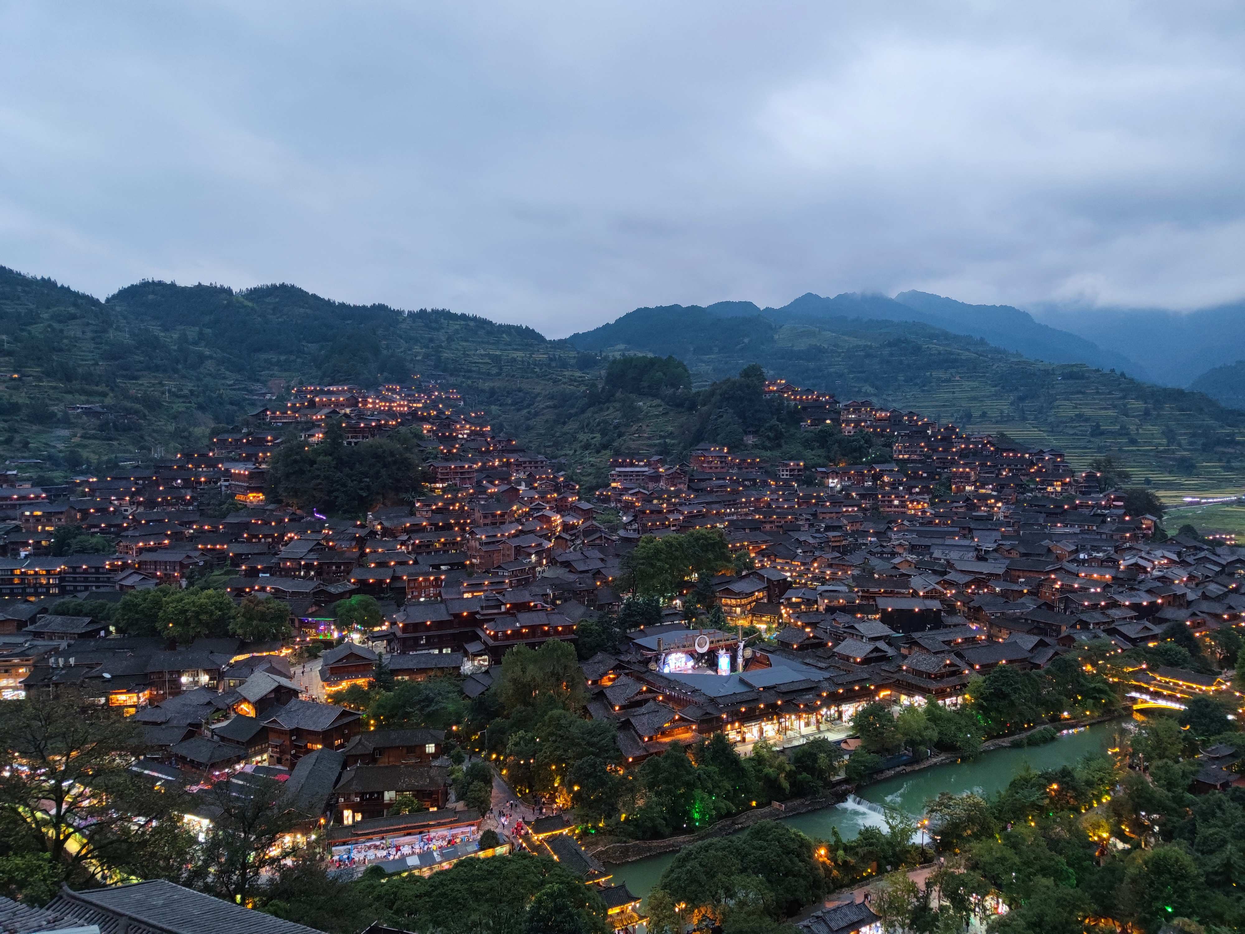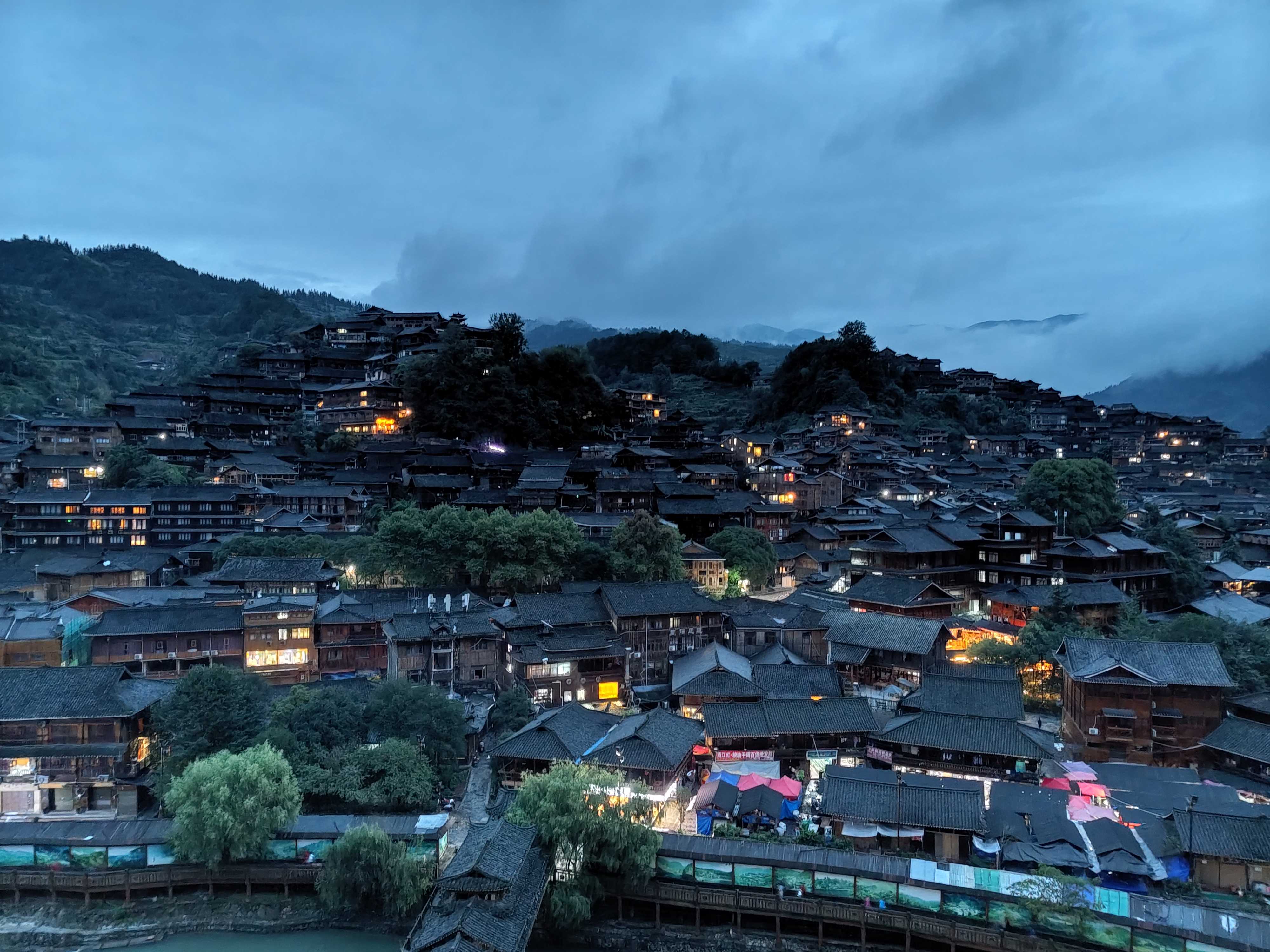 Le matin j’avais repéré un endroit parfait pour le diner et manger face à la première attraction de Xijiang. Tous les soirs, toutes les maisons de Xijiang allument une lampe devant leur maison, c’est une tradition du village que le gouvernement a institutionnalisé pour le tourisme. La vue au crépuscule est magique, c’est un magnifique instant de contemplation, le temps semble suspendu.