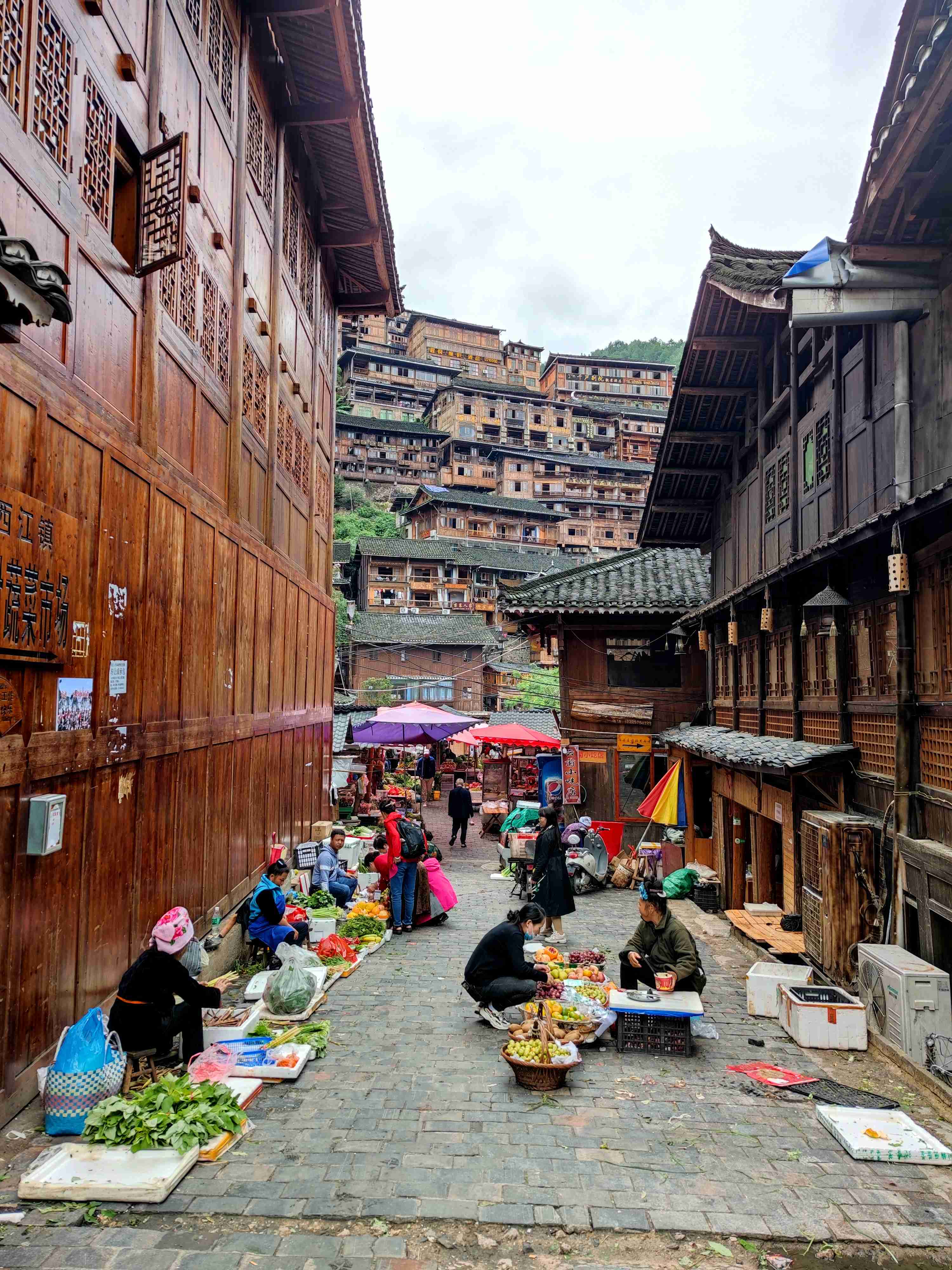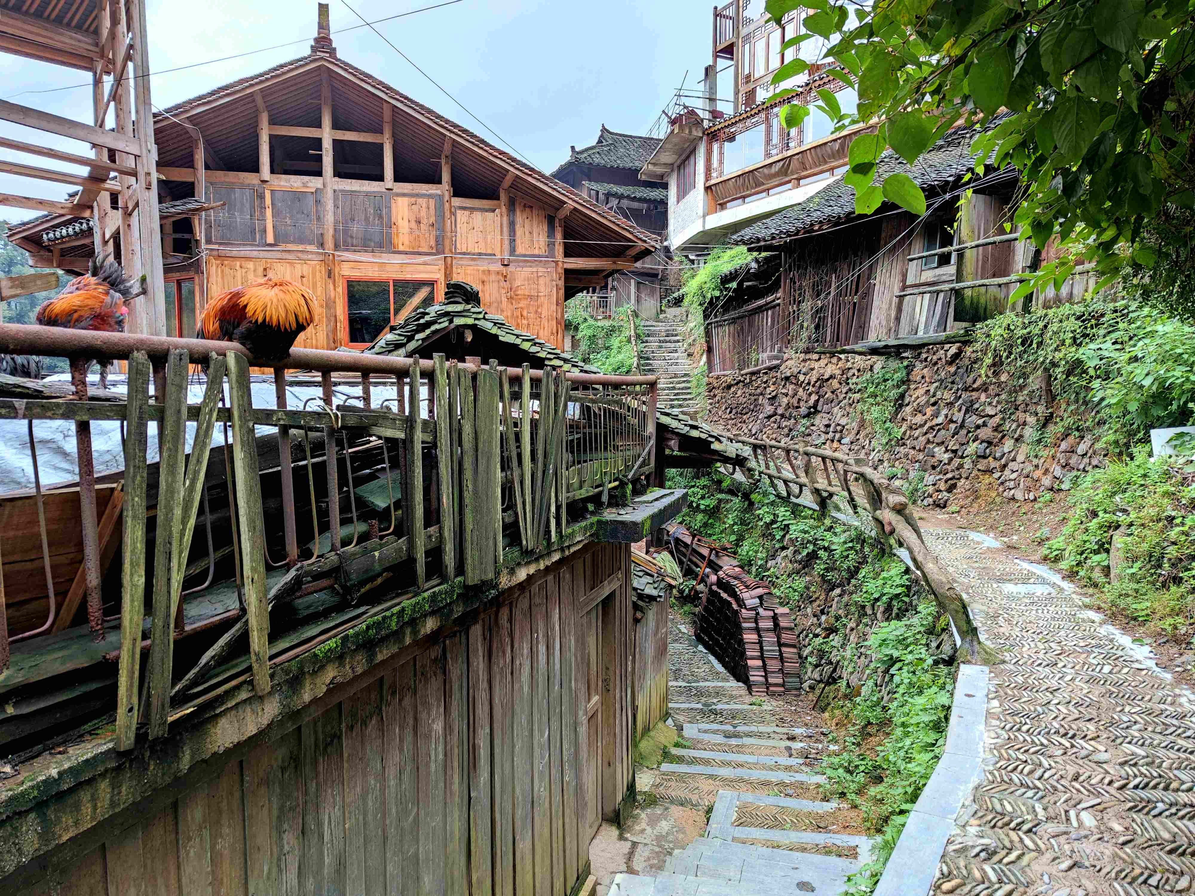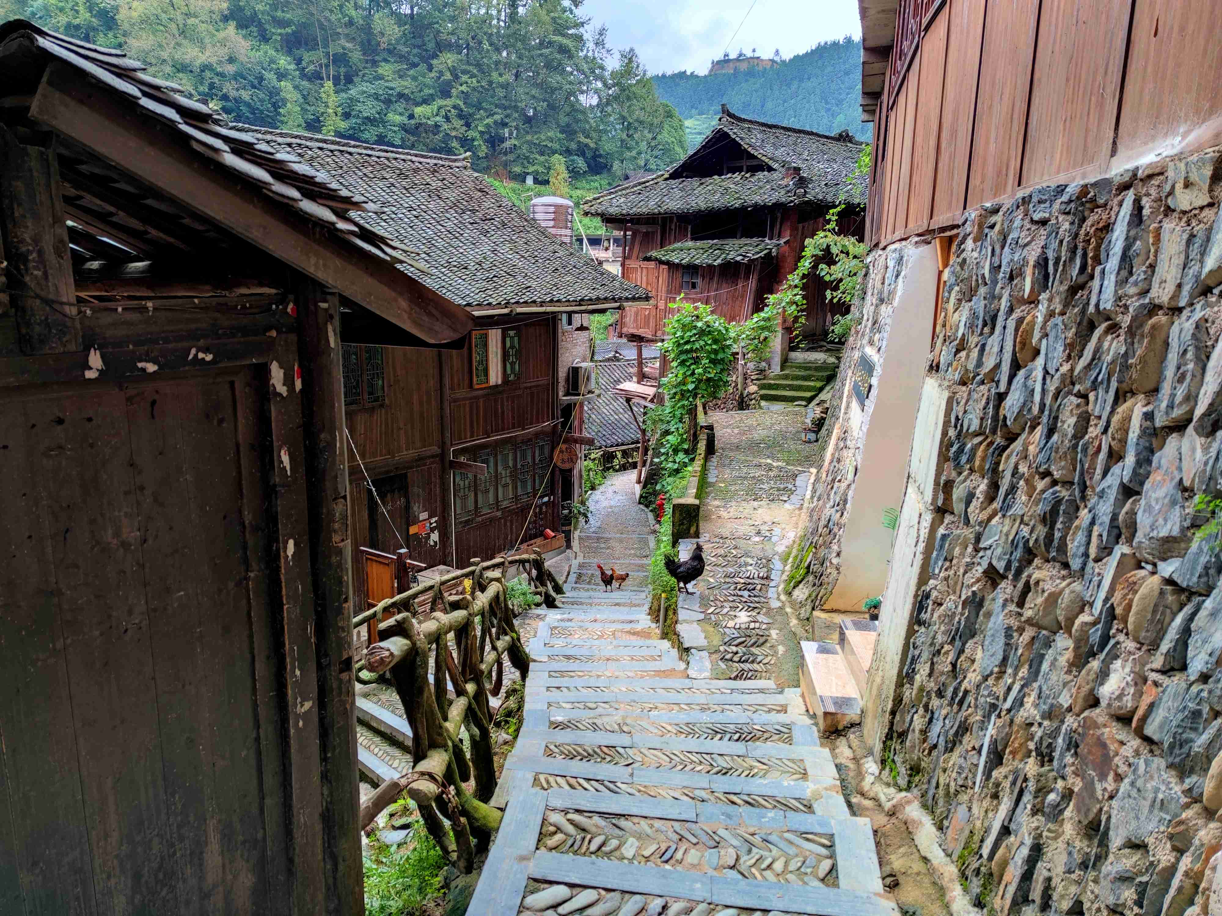 Quelques Miao sont assis et discutent, d’autres grimpent les nombreuses marches avec des marchandises suspendues sur un bambou. Leur dialecte m’est inconnu, je ne comprends pas un mot de leurs conversations. On passe devant de belles maisons en bois, et on a une vue différente du village.